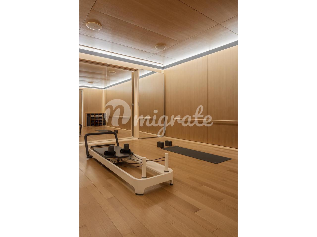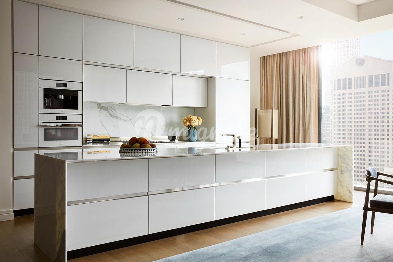 Из впечатляющей входной галереи в просторную угловую большую комнату выходят окна от пола до потолка, которые искусно обрамляют виды на юг и восток. Смежная кухня, изготовленная на заказ Тьерри Деспонтом для Molteni, оснащена столешницами из полированного мрамора в виде скульптур и задней панелью в виде скульптур с подсветкой, которая дополняет окрашенные в черный цвет стеклянные шкафы с отделкой из полированного никеля и сантехникой Dornbracht. Обширный набор бытовой техники от Miele и Sub-Zero включает в себя полностью встроенные холодильник и морозильную камеру, варочную панель с пятью конфорками и полностью вентилируемой вытяжкой, встроенную посудомоечную машину, настенный духовой шкаф, скоростную духовку, винный холодильник под стойкой и встроенную кофеварку.