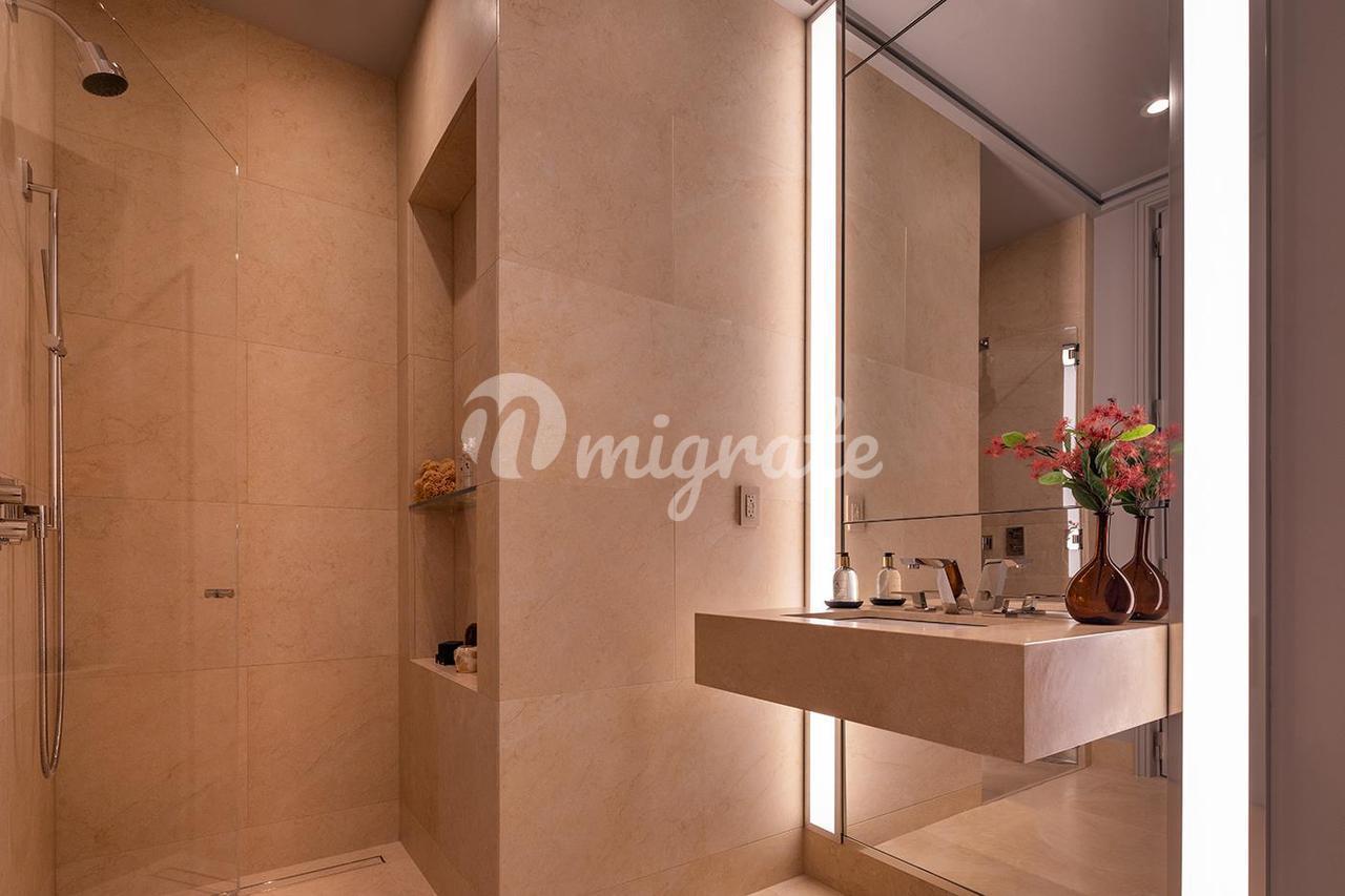 Отдельный основной люкс с видом на восточную сторону располагает просторной гардеробной и просторной ванной комнатой с лучистым полом с подогревом. Элегантно отделанная полированным мрамором Noir St. Laurent, высокоточным веронским известняком и полированным персидским золотистым травертином с полированной никелевой сантехникой Dornbracht, главная ванная комната оснащена двумя отдельными туалетными столиками с резьбой по индивидуальному заказу, чугунной ванной Lefroy Brooks, отдельно стоящим душем и отдельным туалетом. Из просторной второй спальни, выходящей на восточную сторону, открывается вид на ванную комнату в номере, отделанную веронским известняком высокой чистоты с полированной никелевой сантехникой Dornbracht. Завершают резиденцию прекрасно оборудованная дамская комната и незаметный подсобный шкаф со стиральной машиной и вентилируемой сушилкой. Ни одна деталь не была упущена из виду, от индивидуального дизайна внутреннего освещения, разработанного Тьерри Деспонтом в сотрудничестве с Биллом Швингхаммером, до моторизованных солнечных плафонов Lutron с дополнительными затемняющими шторами в каждой спальне, до подачи увлажненного и отфильтрованного свежего воздуха по всему дому.