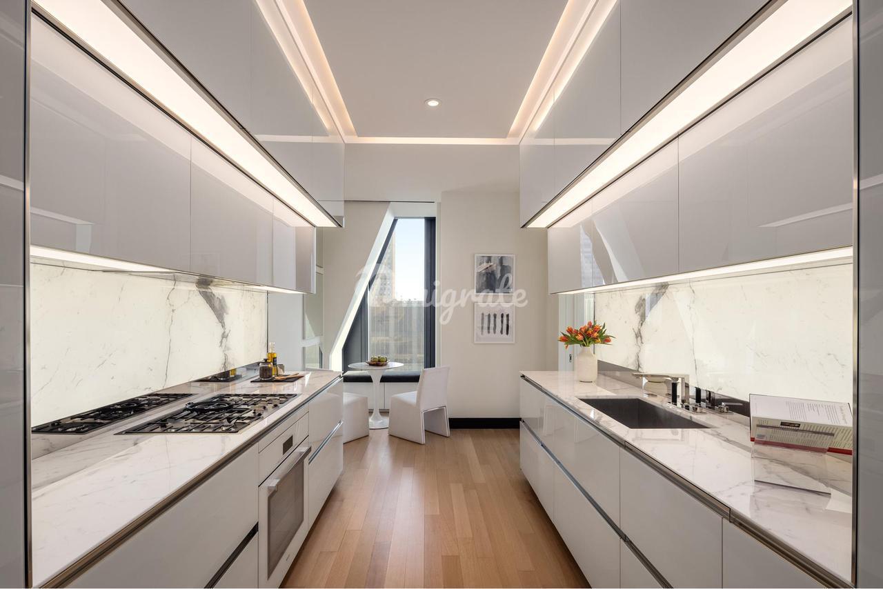 Из галереи у входа в просторную гостиную с двух сторон выходят окна от пола до потолка, которые искусно обрамляют выходящий на север вид на Центральный парк, а также поразительные виды на юг и запад с видом на горизонт Манхэттена и реку Гудзон. За хитроумной дверцей-карманом вас ждет кухня, изготовленная на заказ Тьерри Деспонтом для Molteni, где столешницы из полированного мрамора в виде скульптур и задняя панель в виде скульптур с подсветкой дополняют окрашенные в черный цвет стеклянные шкафы с отделкой из полированного никеля и сантехникой Dornbracht. Обширный набор бытовой техники от Miele и Sub-Zero включает в себя полностью встроенные холодильник и морозильную камеру, варочную панель с пятью конфорками и полностью вентилируемой вытяжкой, встроенную посудомоечную машину, настенный духовой шкаф, скоростную духовку, винный холодильник под стойкой и встроенную кофеварку.