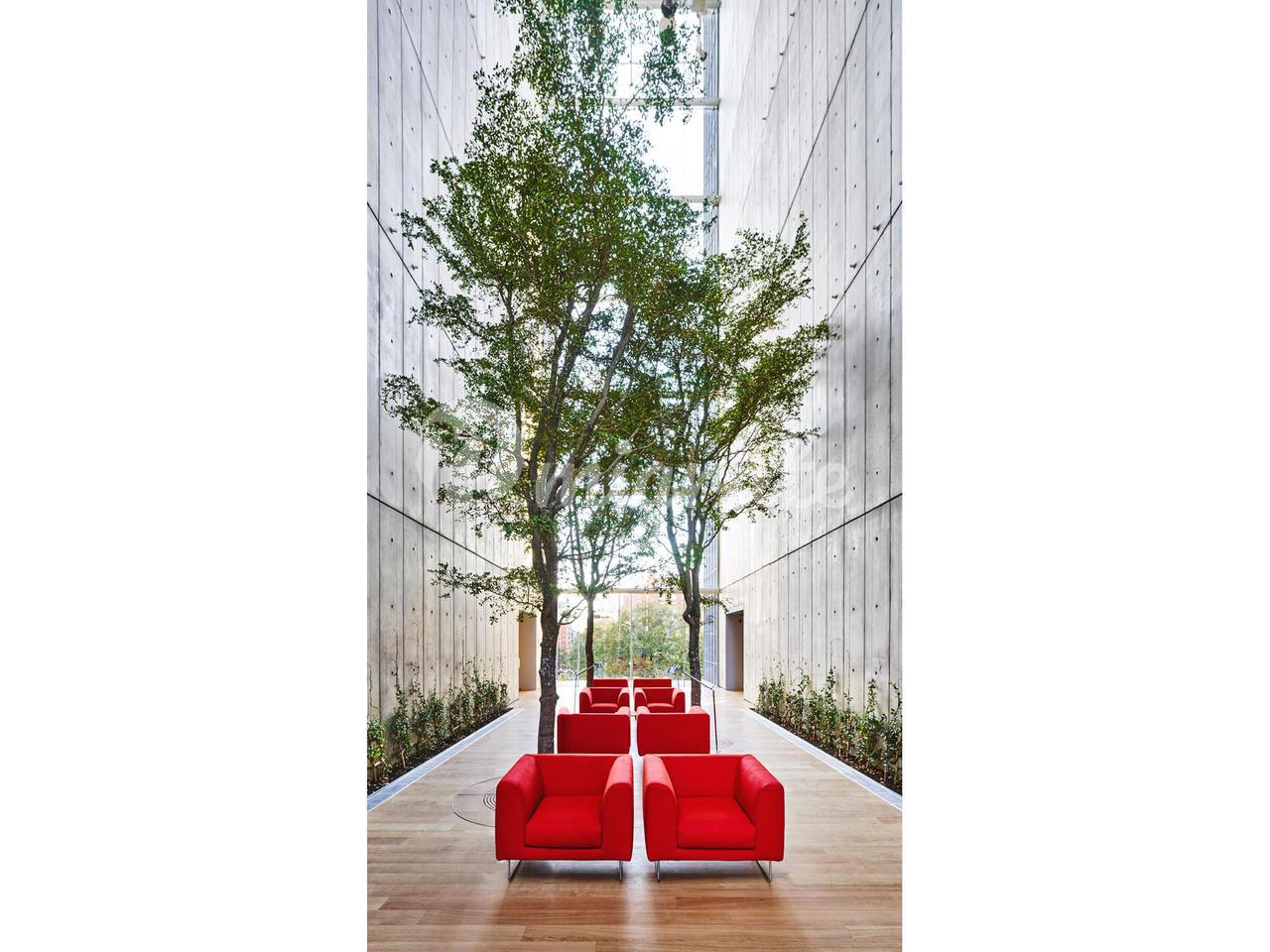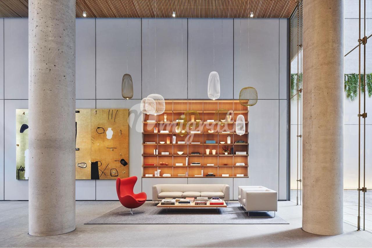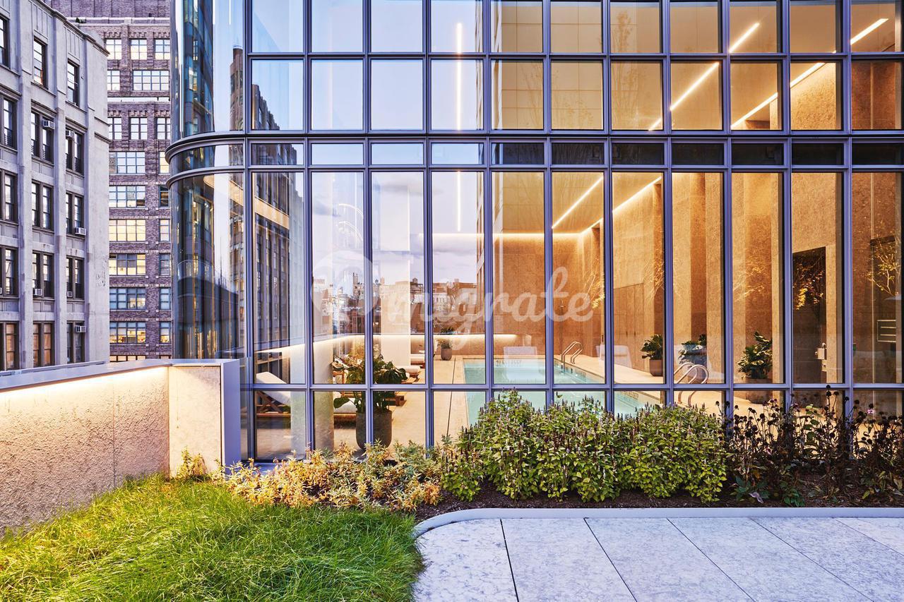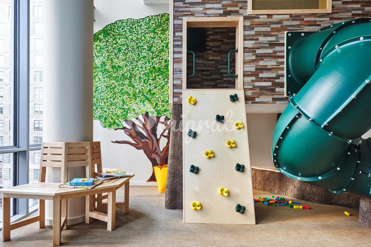 Дополнительные удобства включают вестибюль двойной высоты с круглосуточным швейцаром и консьержем, 55-футовый крытый бассейн с подогревом, паровую баню, сауну и фитнес-центр со студией йоги, детскую игровую комнату, а также внутренний ландшафтный лаундж с 92-футовыми потолками, живой зеленой стеной и библиотекой. В этом здании также есть автоматизированная парковка, которую можно приобрести.