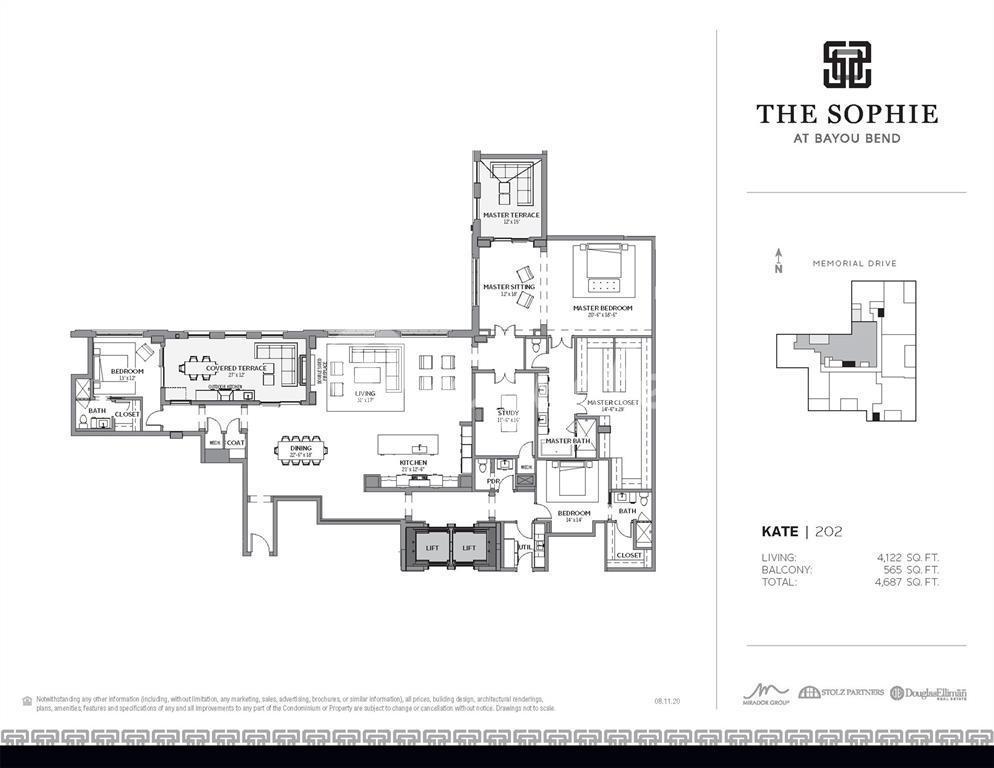Изысканная жизнь в изысканном месте. План этажа Кейт в отеле Sophie at Bayou Bend находится прямо рядом с Мемориальным парком. Вид на вершины деревьев создает ощущение спокойствия в городе. Эта планировка этажа имеет прямой вход на лифте в дом с просторной гостиной, идеально подходящей для развлечений. На этой дизайнерской кухне с мраморными столешницами, наполнителем для кастрюль и многим другим не пропущено ни одной мелочи. Основной люкс - предмет зависти других, с собственной террасой и невероятно большой гардеробной. Сразу за основным люксом находится закрытая комната Flex с гардеробом, идеально подходящая для офиса, медиа-зала или гостевого помещения. Все второстепенные спальни находятся в другом крыле квартиры. Рядом с гостиной и дополнительной спальней находится большая терраса с летней кухней и площадкой для домашних животных. В распоряжении гостей 2 выделенных парковочных места и кладовая. В отеле Sophie есть круглосуточная стойка регистрации, фитнес-центр, бассейн, гидромассажная ванна, бассейн с отягощениями и парк для домашних животных.