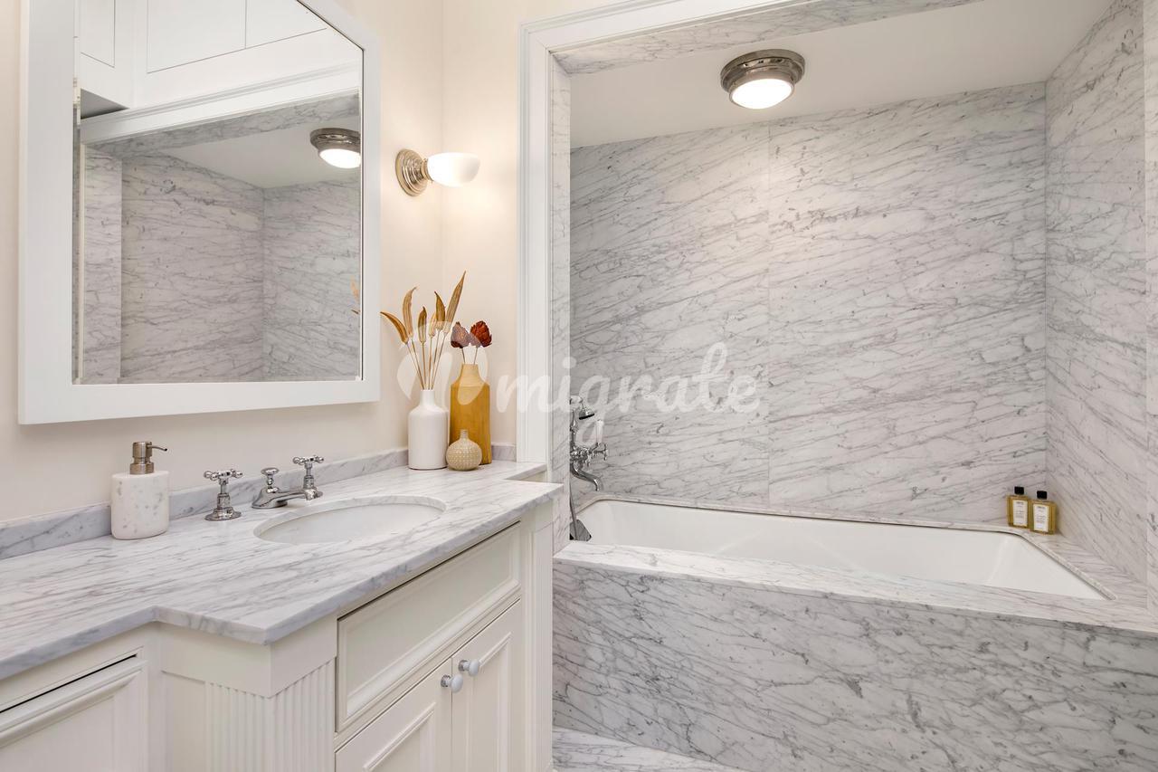 Следуйте по центральной лестнице с перилами из орехового дерева наверх, в жилые помещения. Естественный свет льется через четыре эффектных световых люка, украшающих третий уровень этого необычного дома. Негабаритная главная спальня может похвастаться двумя стенами со встроенными шкафами и местом для хранения вещей. Три окна, обрамленные бледно-голубыми жалюзи и деревянными кашпо с автоматическим поливом, выходят на тихую мощеную улицу внизу. Во второй спальне французские двери ведут на очаровательный балкон, возвышающийся над безмятежным центральным двором. Главная ванная комната, облицованная мрамором, оснащена сантехникой Barber Wilsons, в ней есть глубокая ванна и отдельный большой паровой душ с тропическим душем Samuel Heath.