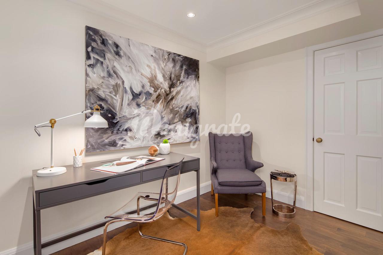 Нижний уровень открывается в кабинет / медиа-комнату, которая также может функционировать как дополнительная спальня. Другой георгианский камин с инкрустацией мрамором подчеркивает непревзойденное очарование этого величественного, но привлекательного пространства. Также на этом этаже находится просторный офис, ванная комната с отдельной душевой кабиной и большая прачечная со стиральной и сушильной машинами Miele с вентиляцией, раковиной, стеллажами и многочисленными шкафами. Термостаты Nest контролируют две зоны HVAC по всему дому.