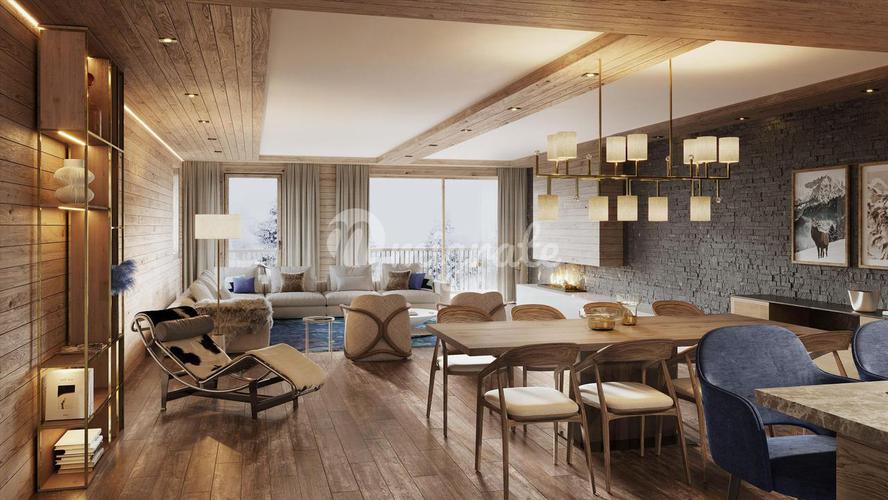 4-комнатная квартира на двух уровнях. На первом уровне есть прихожая с кладовой, открытая оборудованная кухня, гостиная с камином, 2 спальни, спальня с двуспальной кроватью, горный угол, одна ванная комната и 2 балкона. На следующем уровне есть ванная комната, спальня и спальня.