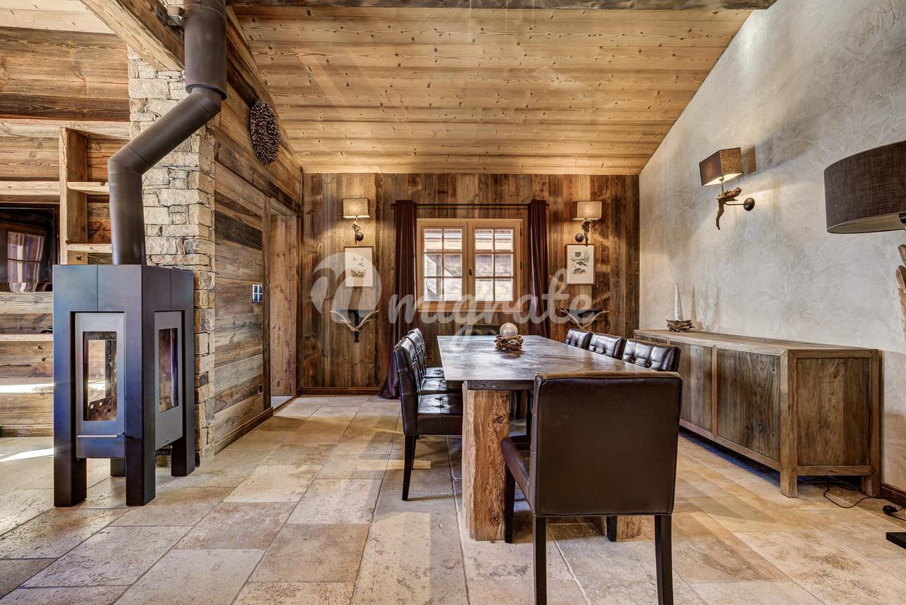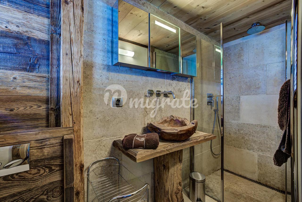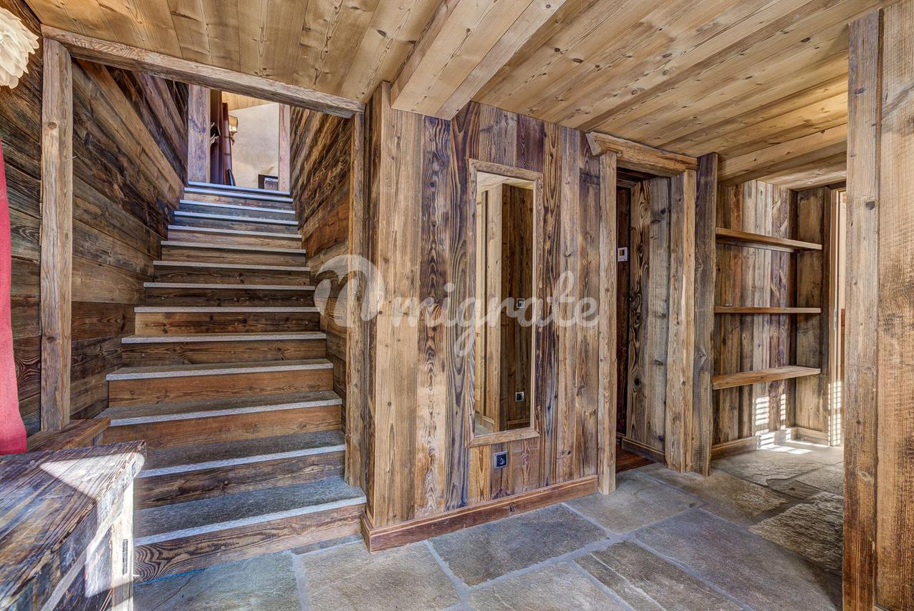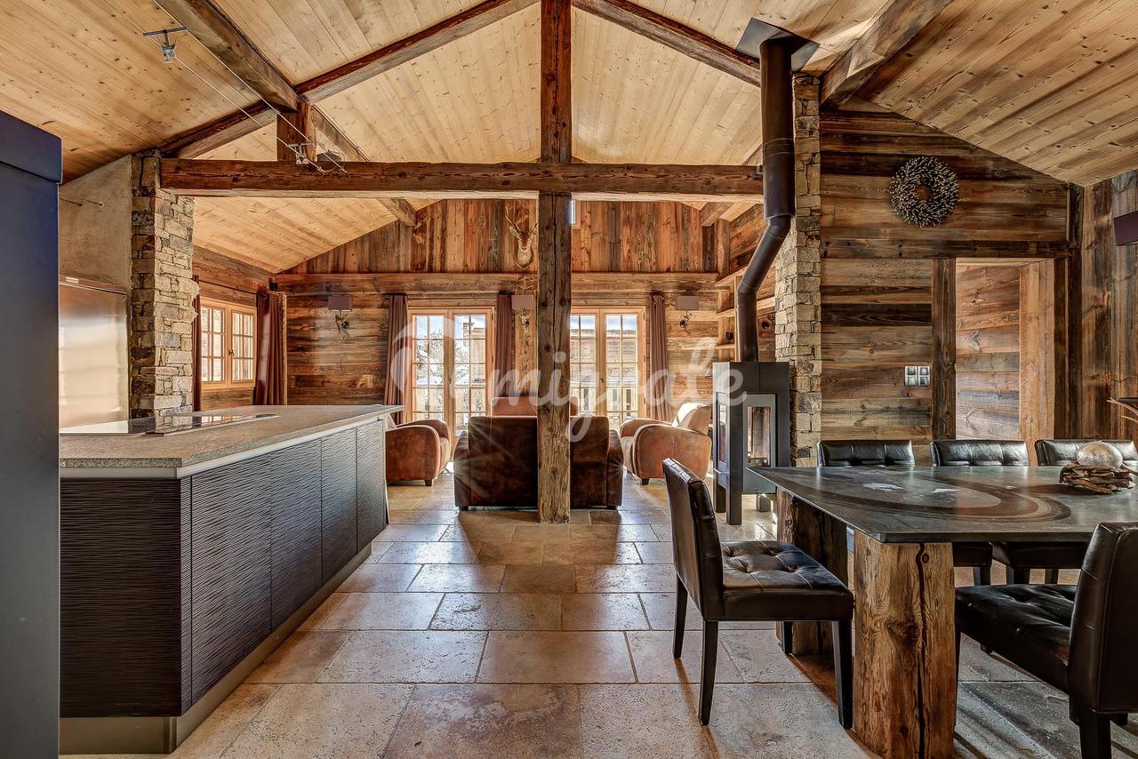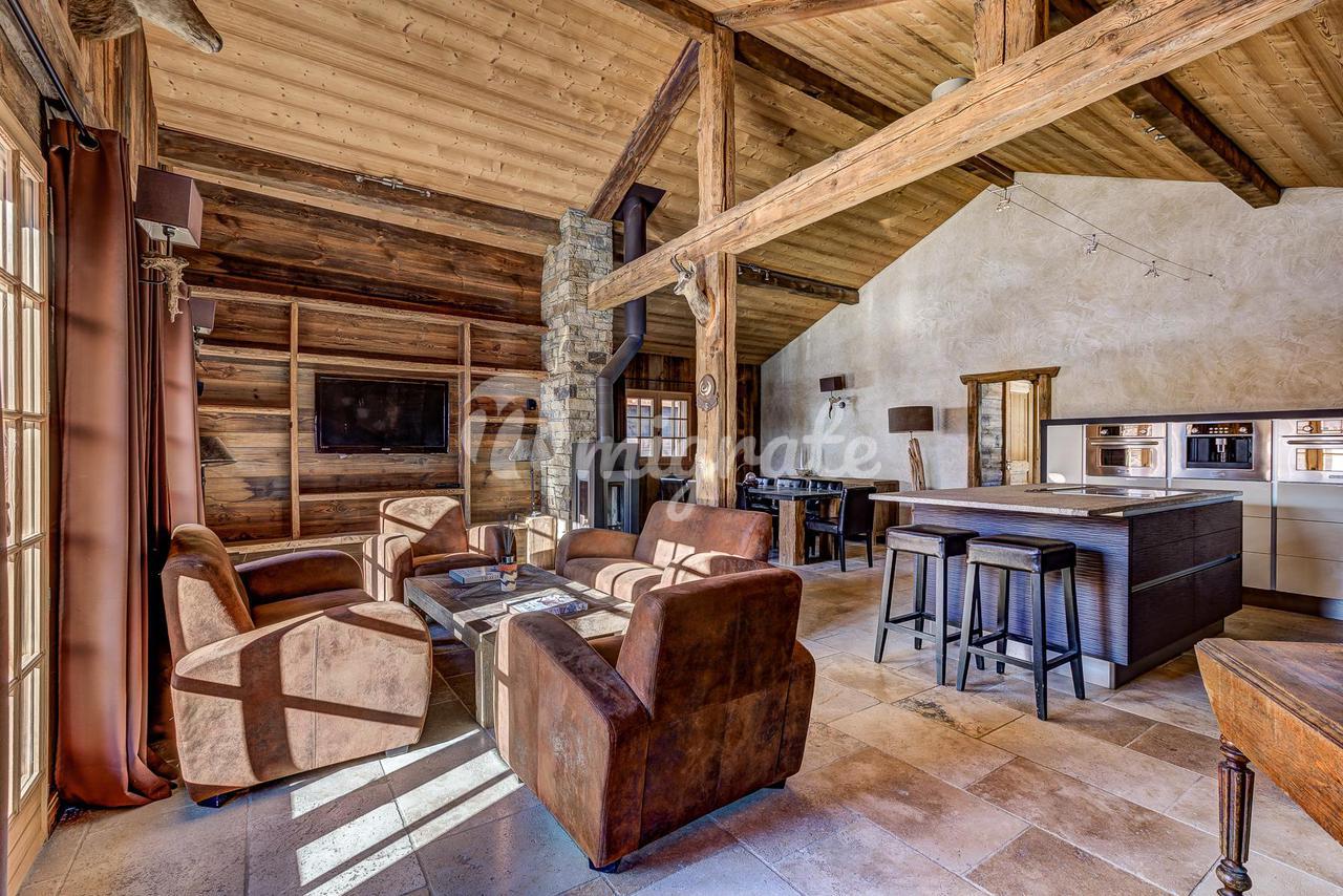 Шале представляет собой типичное альпийское шале из темного дерева и с высококачественной отделкой. Основная жилая площадь находится на первом этаже с гостиной двойной высоты, ведущей на большую солнечную террасу с прекрасным видом. Главная спальня с паровым душем также находится на первом этаже.