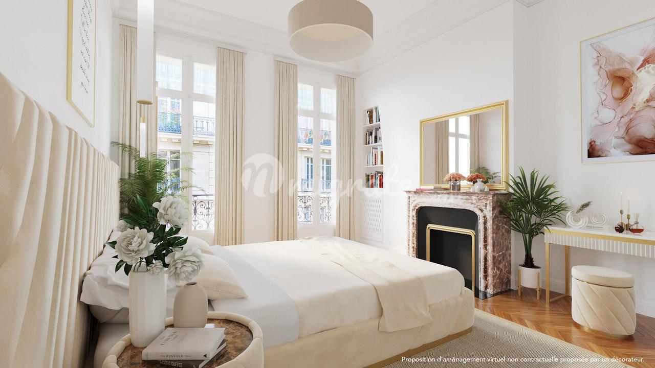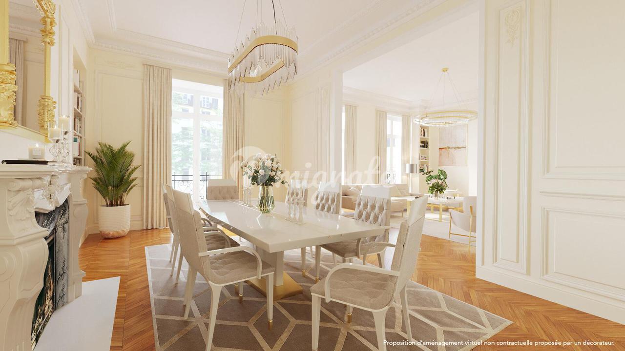 Квартира площадью 264,75 кв. м. Закона Карреза завершена квартирой площадью 49,85 кв. м. Закона Карреза на шестом этаже. Главная квартира имеет прихожую с эркером, столовую и гостиную с балконом с видом на Эйфелеву башню и Дворец Гальера, отдельную кухню с прачечной и кабинет. Спальная зона состоит из люкса площадью 55 м² с ванной и туалетом, а также люкса площадью 35 м² с ванной и туалетом. Возможность обустроить третью спальню. На шестом этаже квартира под ремонт, которая может быть преобразована в красивую двух- или трехкомнатную квартиру. Коробка во дворе и два подвала дополняют это предложение.