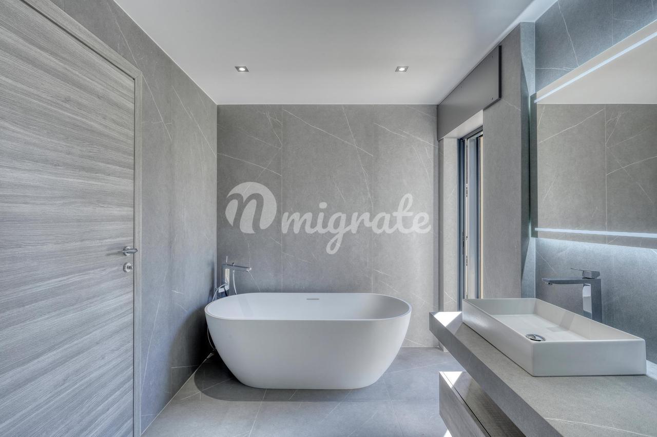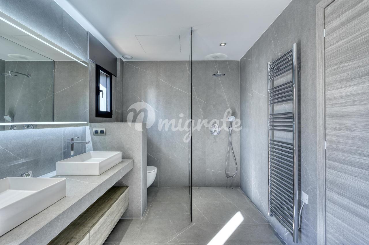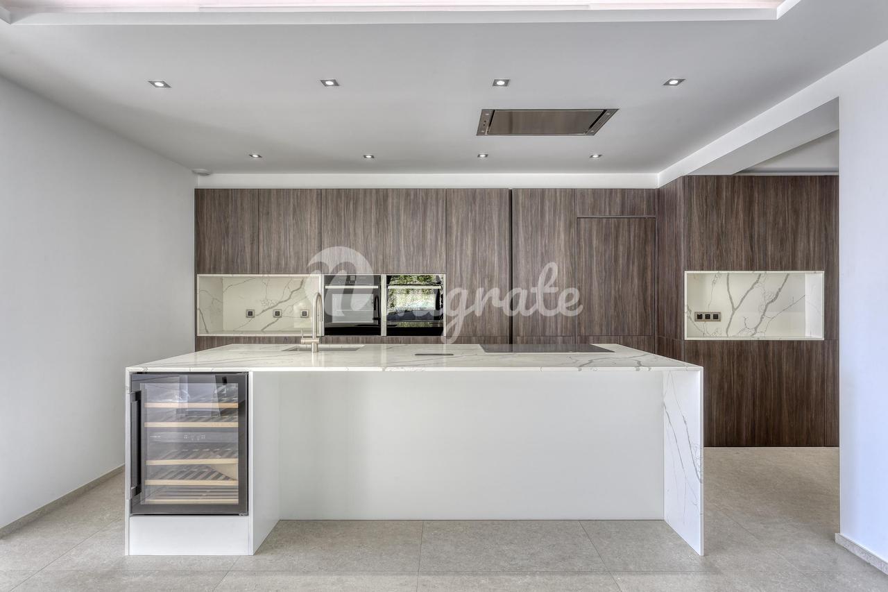 Современная кухня с кухонным островом, светлая столовая, просторная гостиная, главная спальня с собственной ванной комнатой, еще три спальни, ванная комната и душевая. Недвижимость окружена ландшафтным садом площадью около 2600 кв. м с элегантным пейзажным бассейном с видом на море, просторными террасами и двумя гаражами.