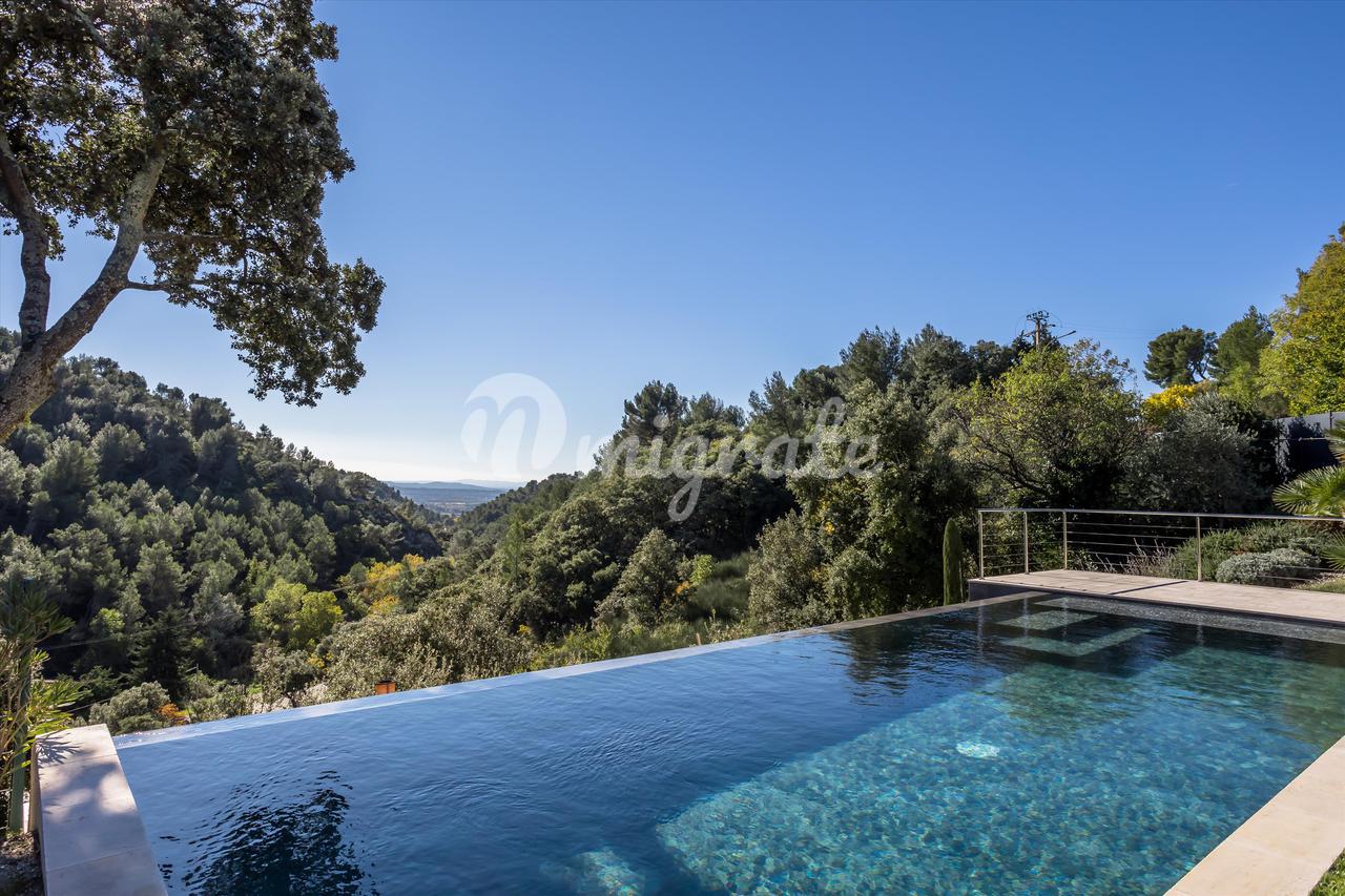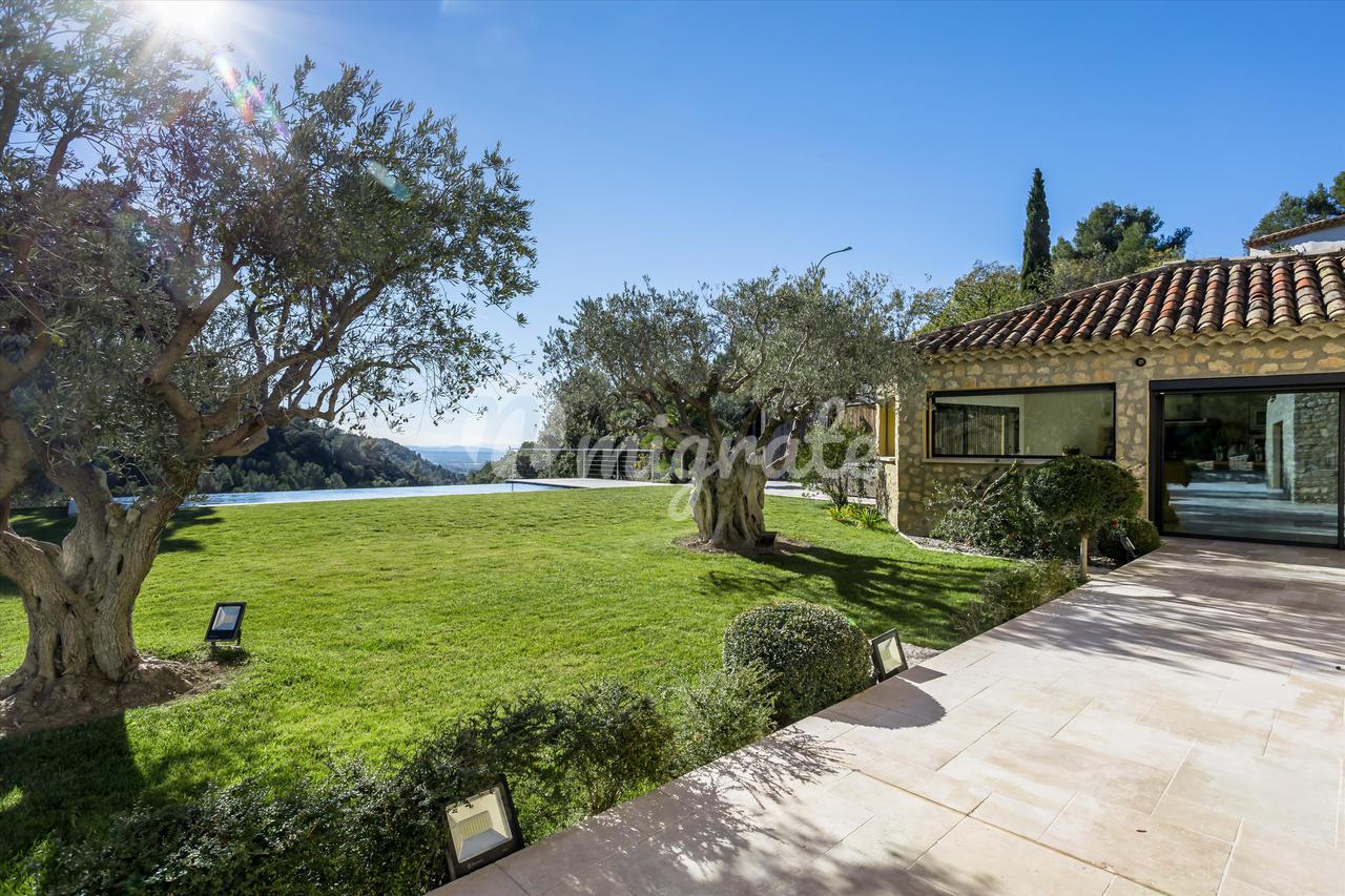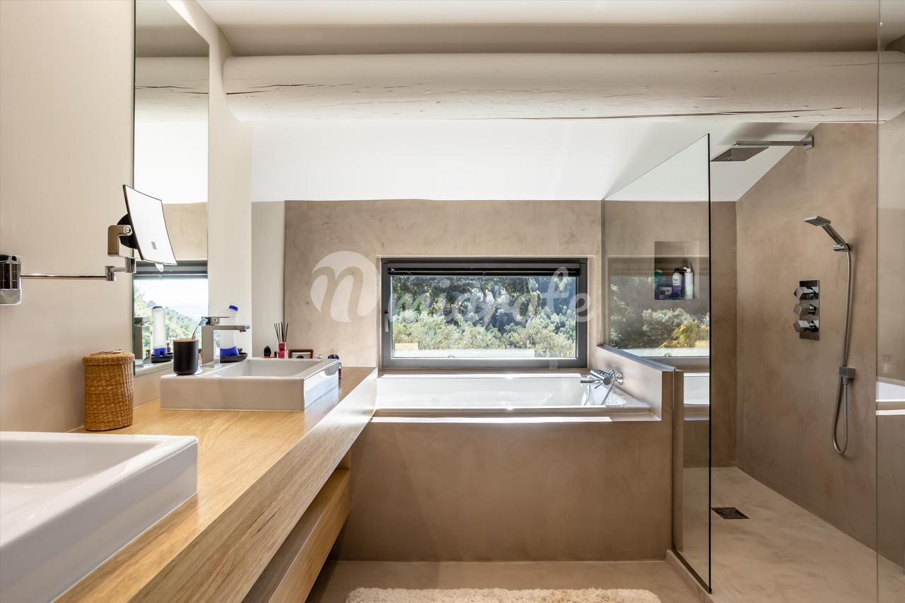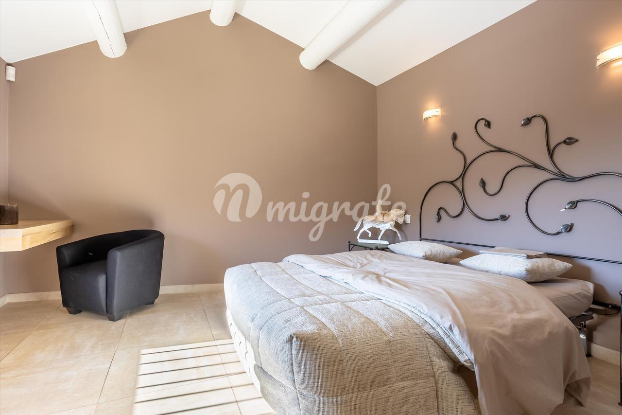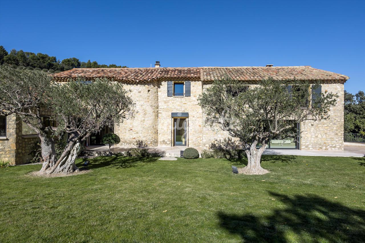 Этот полностью отремонтированный каменный дом расположен на участке площадью около 0,64 га и имеет жилую площадь 275 кв.м. Главное здание включает в себя на первом этаже помещение для хранения велосипедов и тренажерный зал с сауной и спа. Уровень сада включает в себя гостиную с камином, столовую с еще одним камином, оборудованную кухню и прачечную. Первый этаж состоит из ванной комнаты, 3 спален, включая главную спальню с ванной комнатой, и большой кладовой, куда ведет другая лестница. Кроме того, в собственности есть гостевой дом площадью около 35 кв. м, включающий гостиную, кухню и ванную комнату, 2 бассейна и 2 гаража.