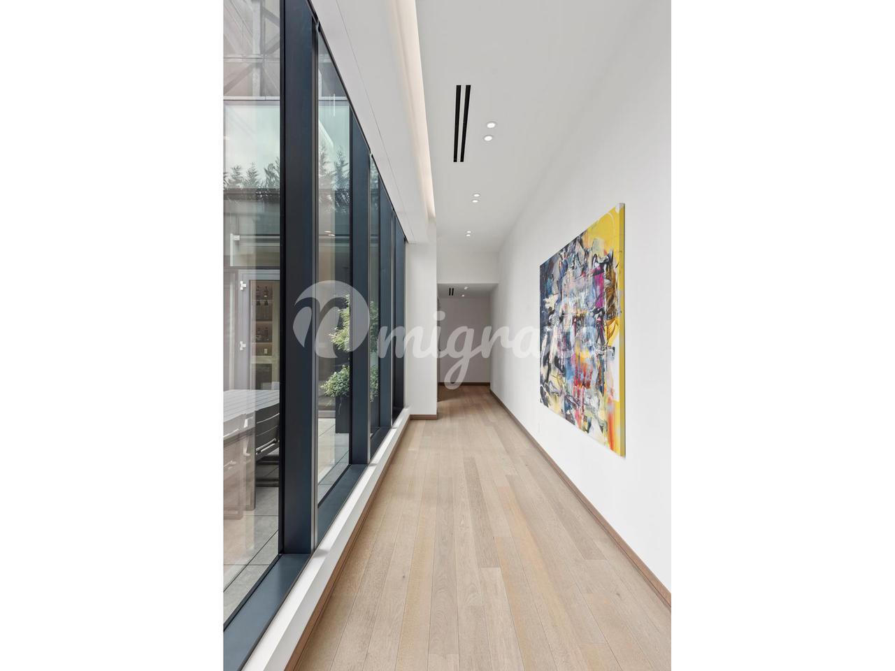 На кухне установлены изготовленные на заказ шкафы из европейского дуба, столешница из полированной стеклянной композитной плиты, фартук из античной серой мраморной плиты, светильники Dornbracht, двойная духовка и варочная панель Bertazzoni, а также холодильник Sub-Zero, морозильная камера и винная зона с двумя зонами. кулер. Этот дом включает в себя три гостевые спальни с ванными комнатами, бар с раковиной, прачечную / подсобное помещение с раковиной. Резиденцию окружают ниша и встроенное верхнее освещение, а также элегантные полы из дымчатого серого дуба, 8-футовые внутренние двери из цельного дерева и скрытые оконные карманы с электронными солнцезащитными шторами.