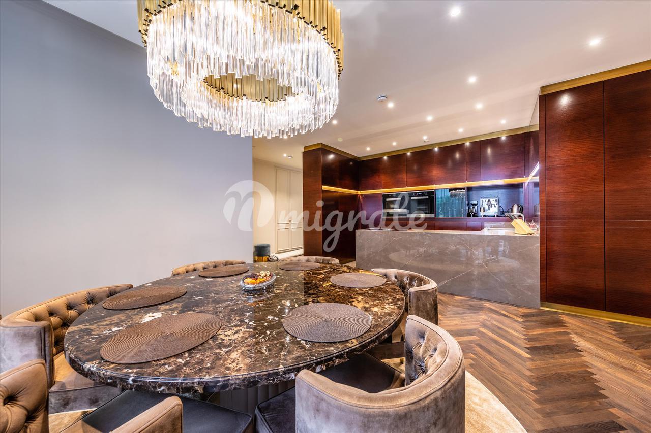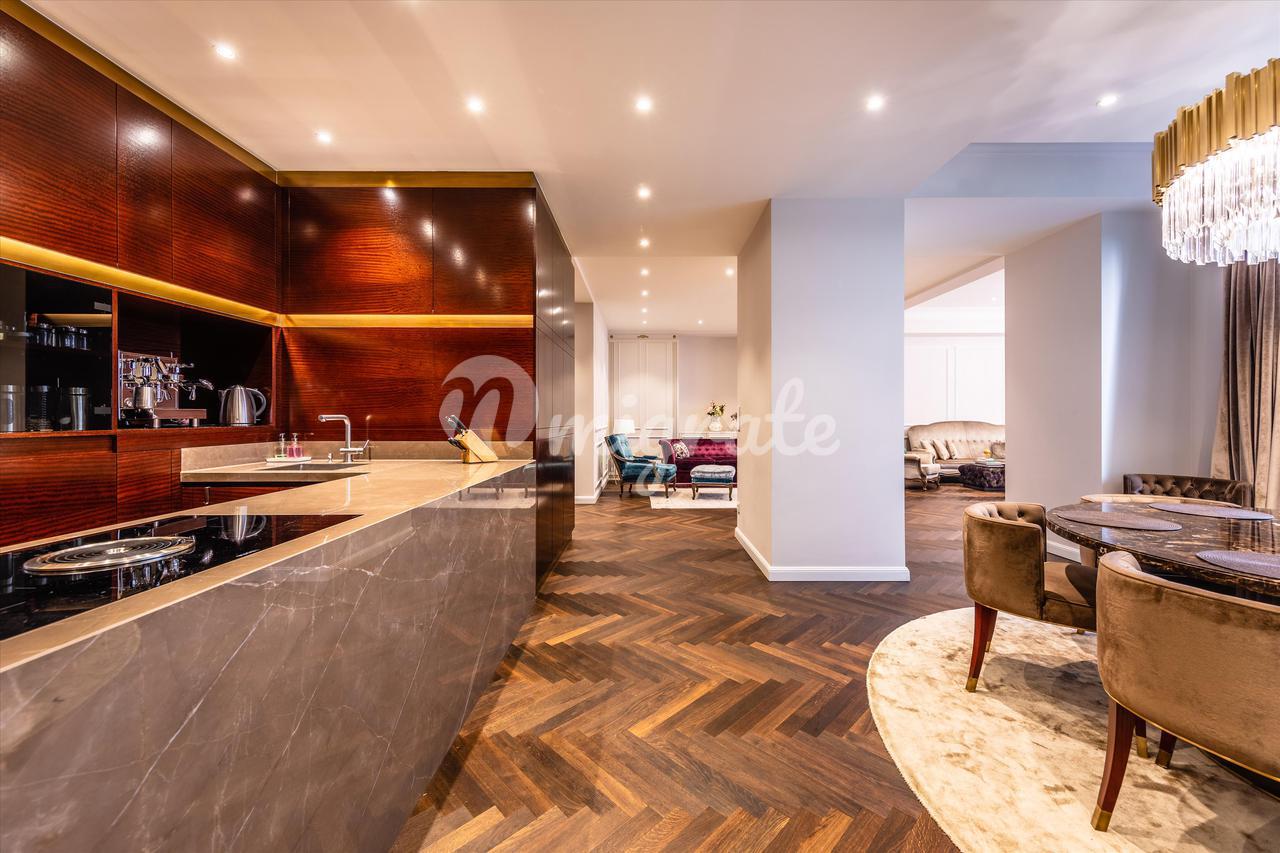 Квартира меблирована по чрезвычайно высоким стандартам Cserni Design. Эксклюзивные материалы и сбалансированная цветовая гамма создают роскошную атмосферу. Темный паркет в елочку, мраморный пол, эксклюзивные ванные комнаты и встроенные шкафы, а также кухня со всей бытовой техникой дополняют комфорт проживания.