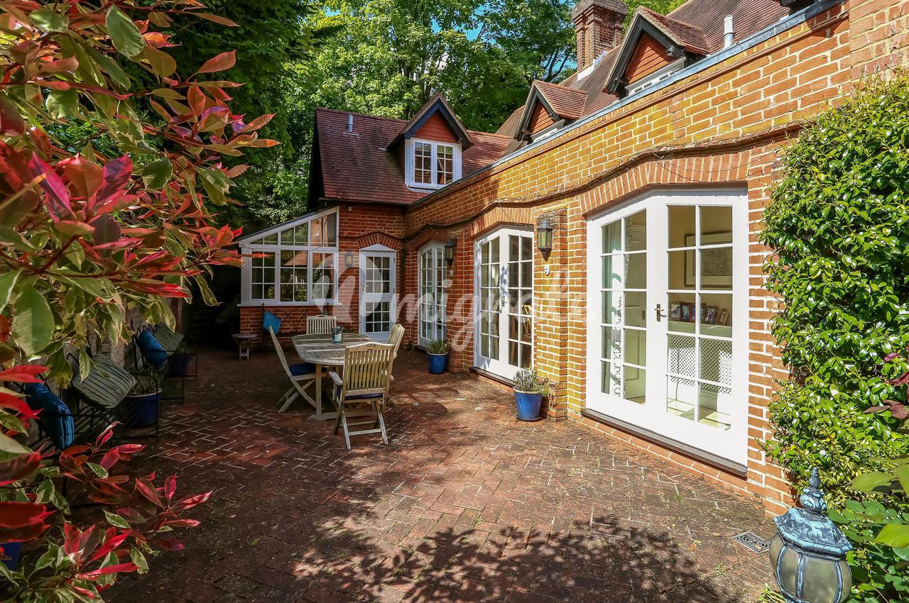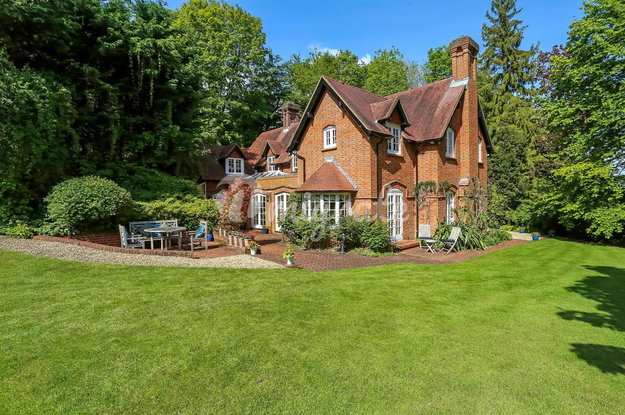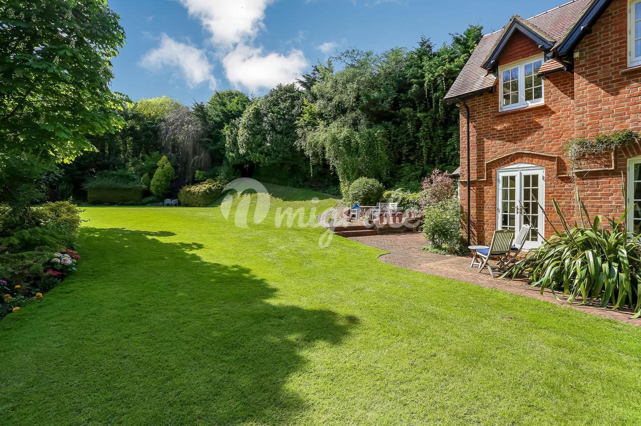 Снаружи к дому можно подъехать через электрические ворота на посыпанной деревьями подъездной дорожке из гравия. Перед домом есть просторная парковка, а также встроенный гараж на две машины. Терраса окружает дом и идеально подходит для отдыха на свежем воздухе. Сад преимущественно заложен газоном с вкраплениями взрослых экземпляров деревьев и четко установленными бордюрами, что создает прекрасное ощущение уединения. В саду есть восхитительный летний домик, расположенный среди лесных деревьев. Общая площадь садов составляет около 1,6 акра.