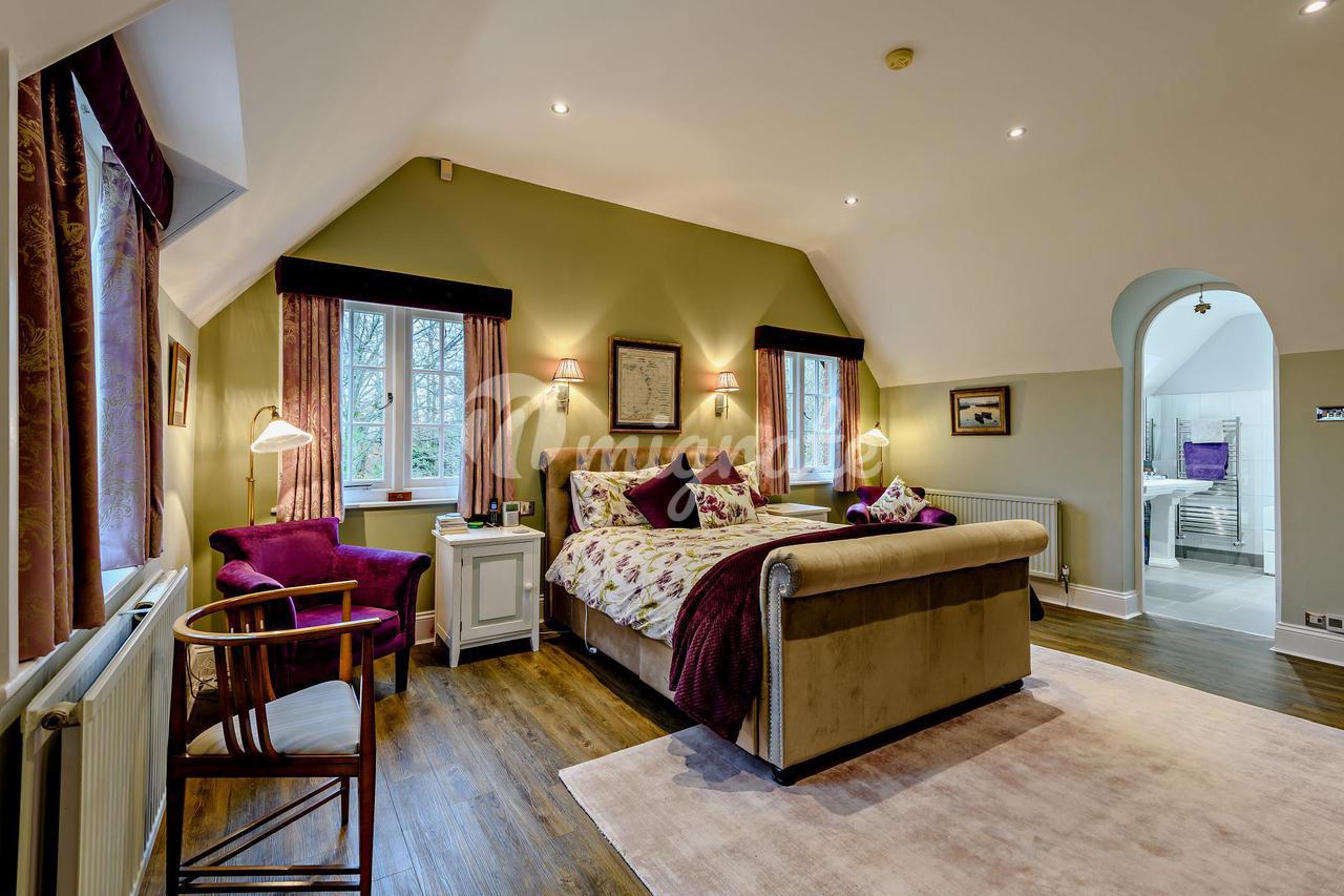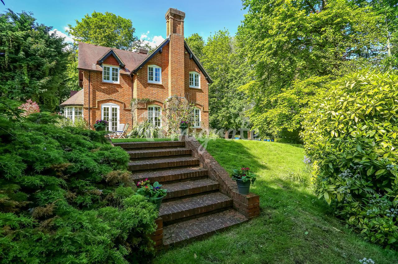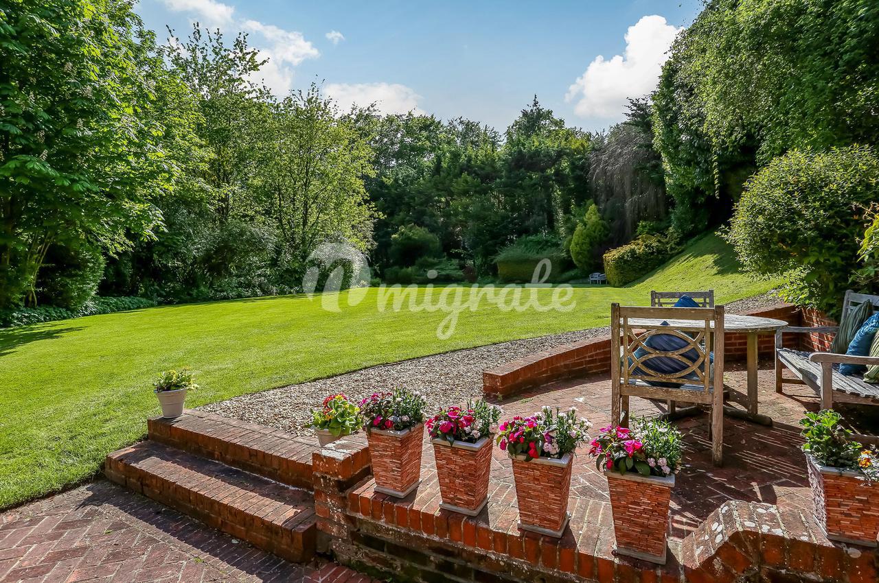 Снаружи к дому можно подъехать через электрические ворота на посыпанной деревьями подъездной дорожке из гравия. Перед домом есть просторная парковка, а также встроенный гараж на две машины. Терраса окружает дом и идеально подходит для отдыха на свежем воздухе. Сад преимущественно заложен газоном с вкраплениями взрослых экземпляров деревьев и четко установленными бордюрами, что создает прекрасное ощущение уединения. В саду есть восхитительный летний домик, расположенный среди лесных деревьев. Общая площадь садов составляет около 1,6 акра.
