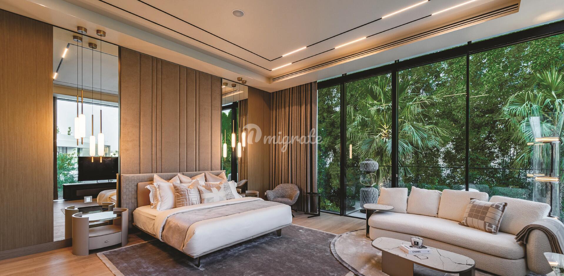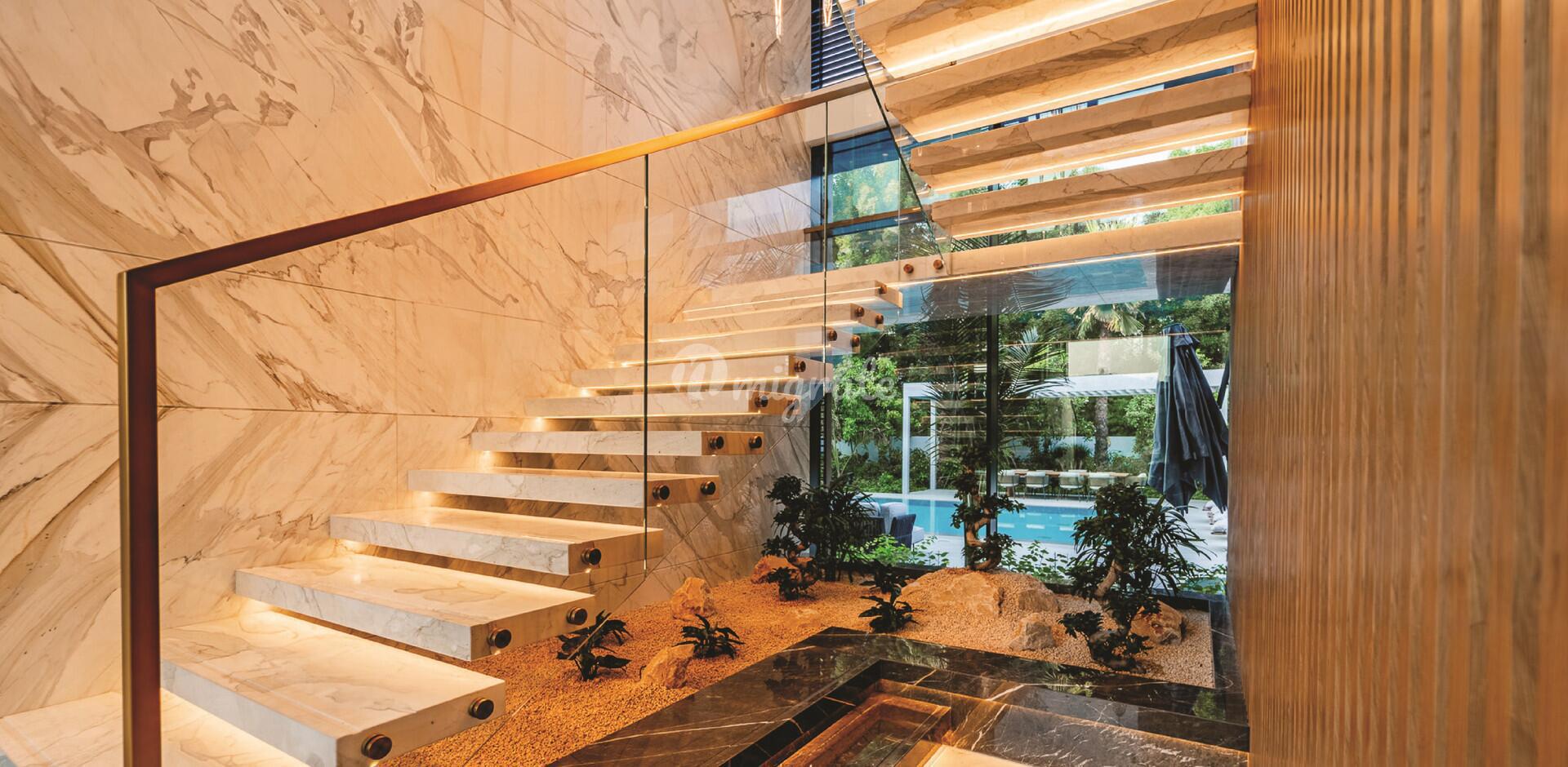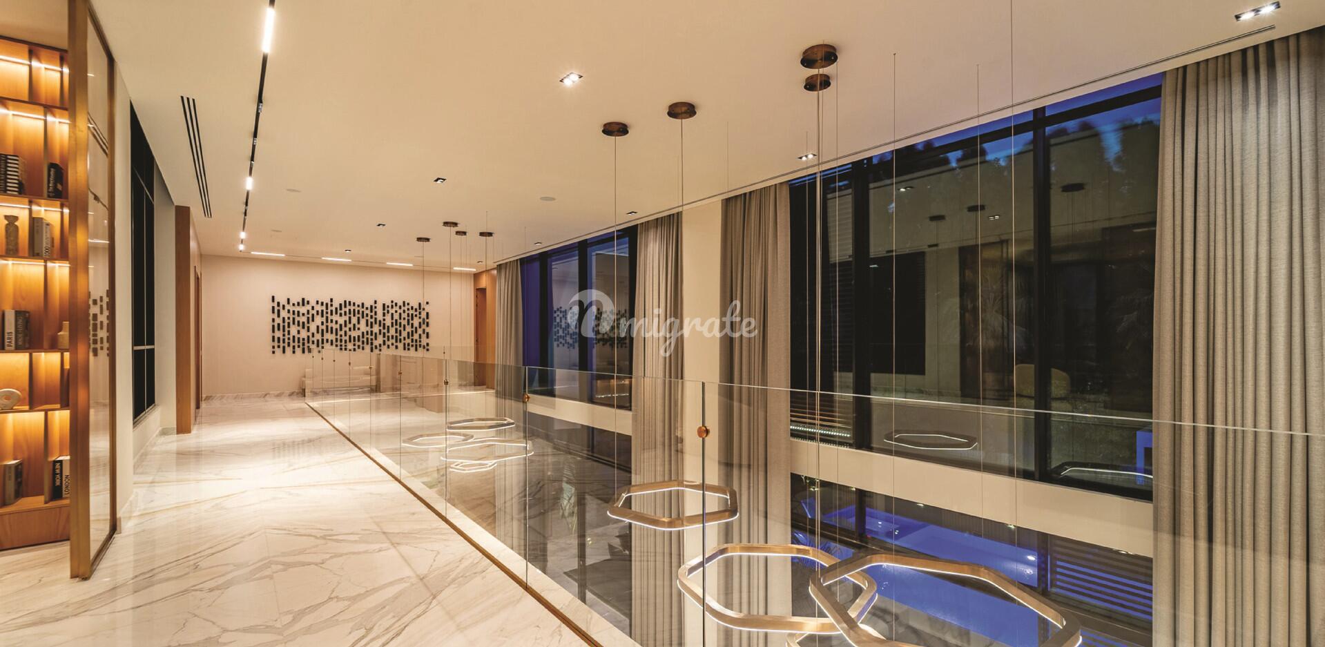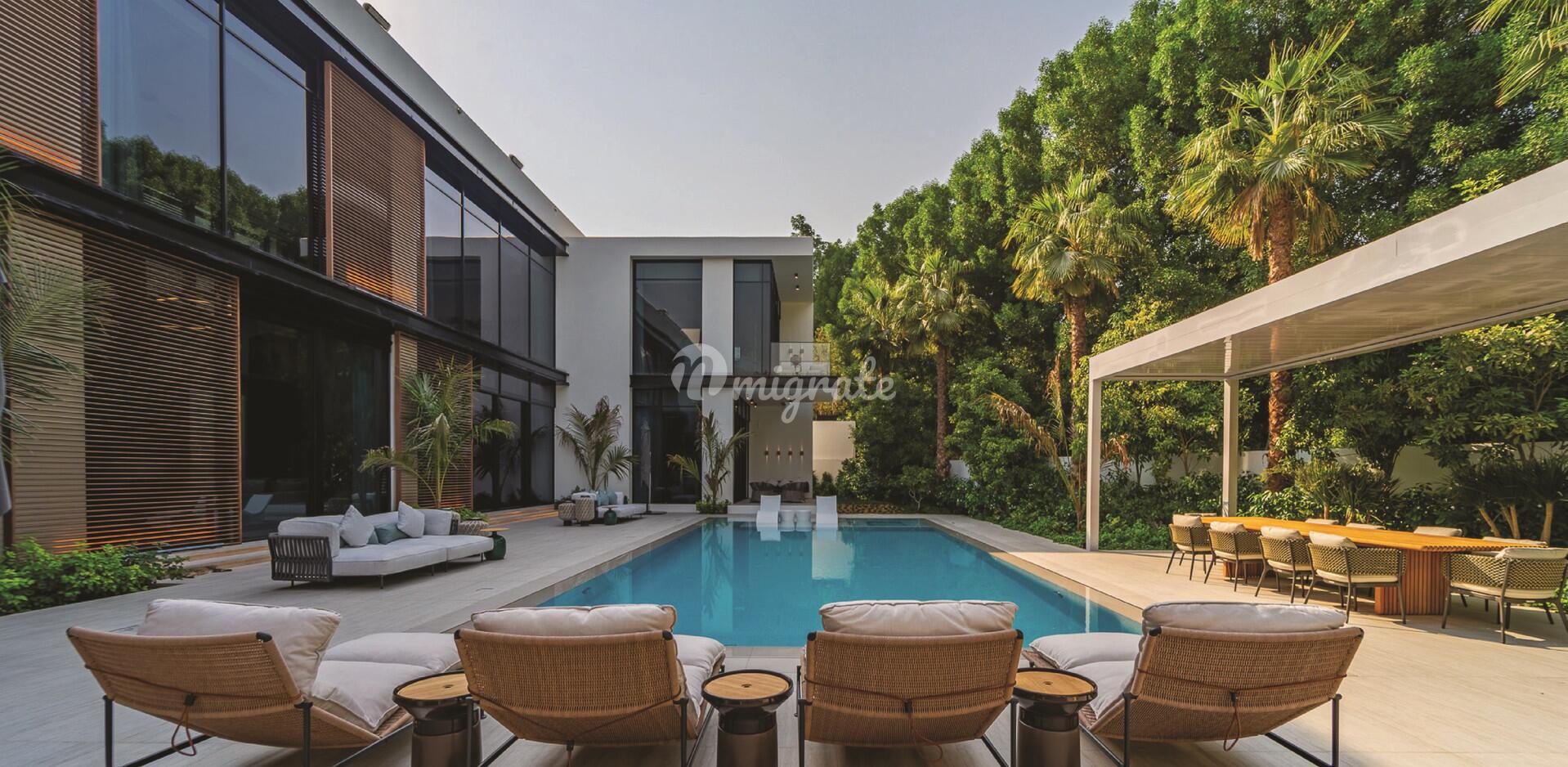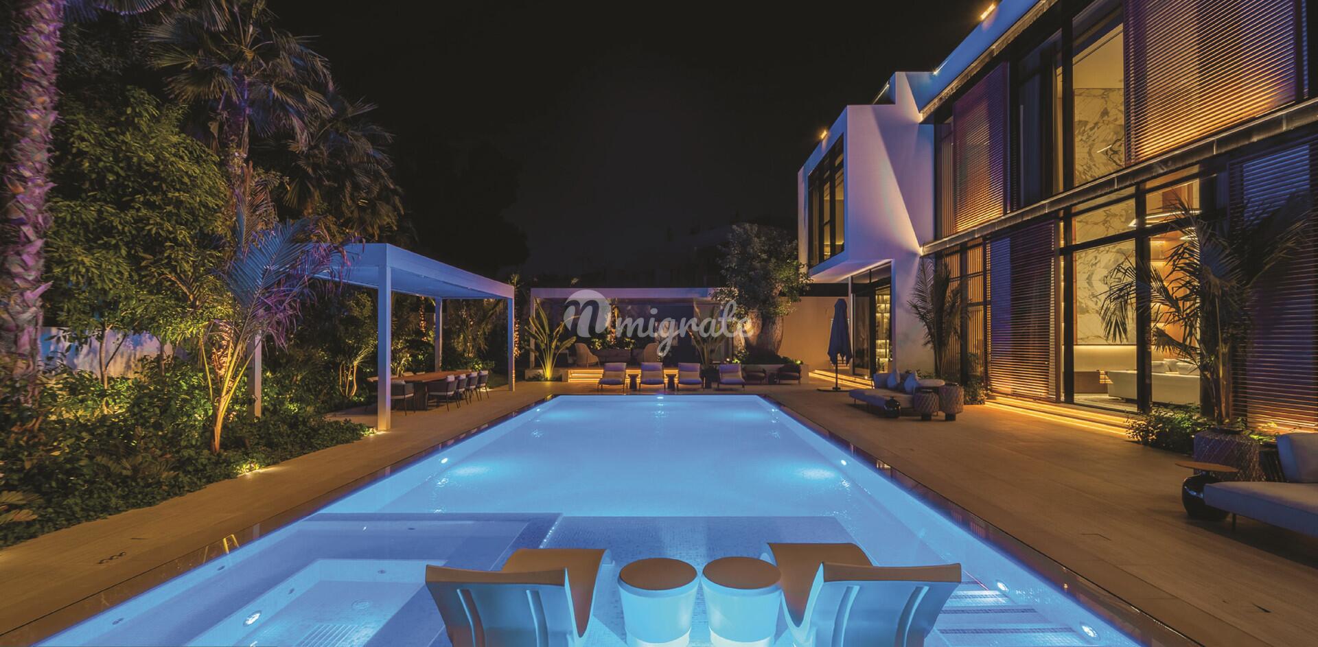 Архитектура этого особняка демонстрирует изысканную современную утонченность, а широкие окна заливают интерьеры естественным светом. На двух просторных этажах особняка расположены пять прекрасно оборудованных спален и несколько гостиных зон, созданных для комфорта и стиля. Кроме того, здесь есть открытые пространства с пышным садом, тенистой беседкой, изысканными обеденными зонами и элегантным баром, идеально подходящим для приема гостей. А в самом сердце особняка находится потрясающий бассейн, который является идеальным местом для безмятежного отдыха на свежем воздухе.