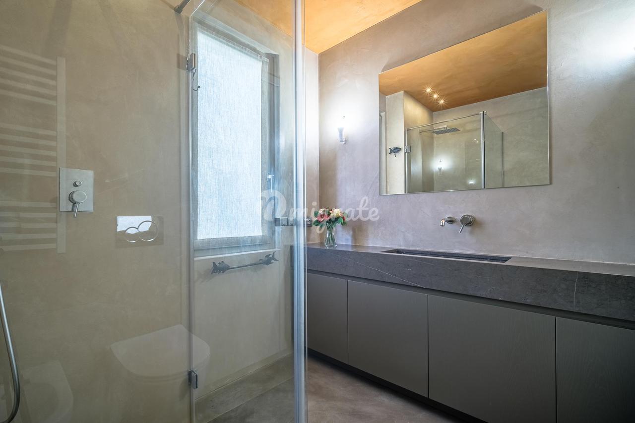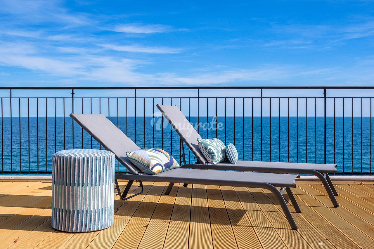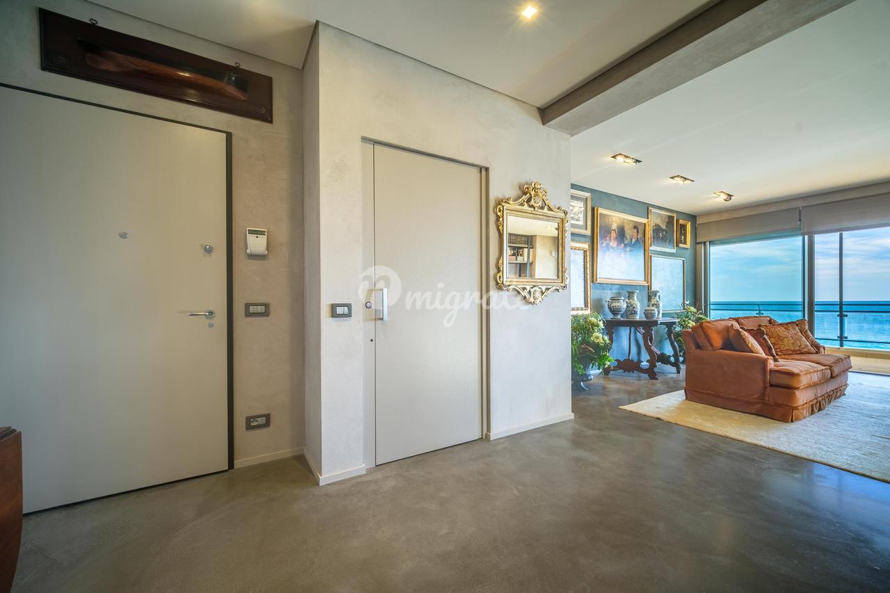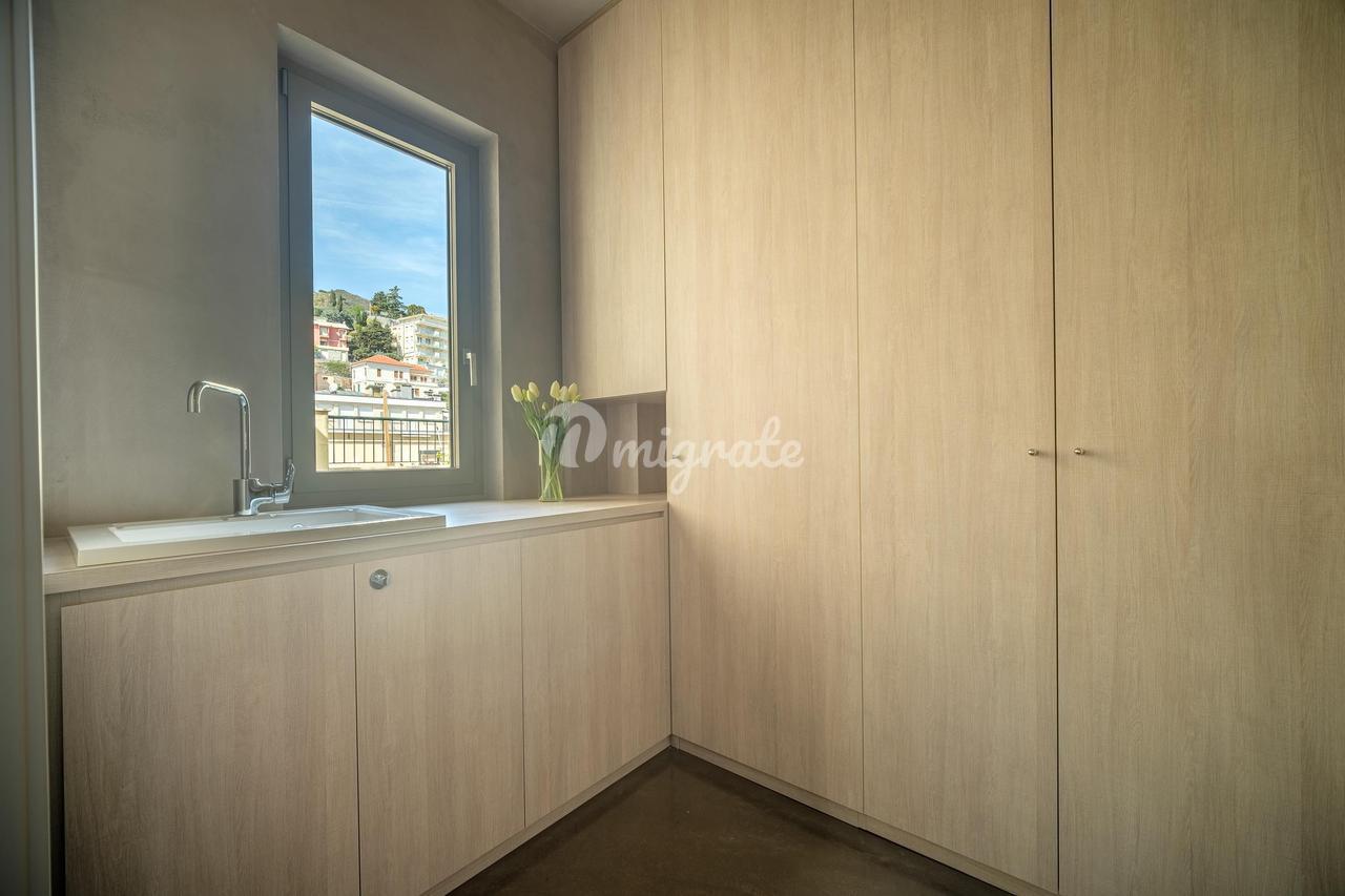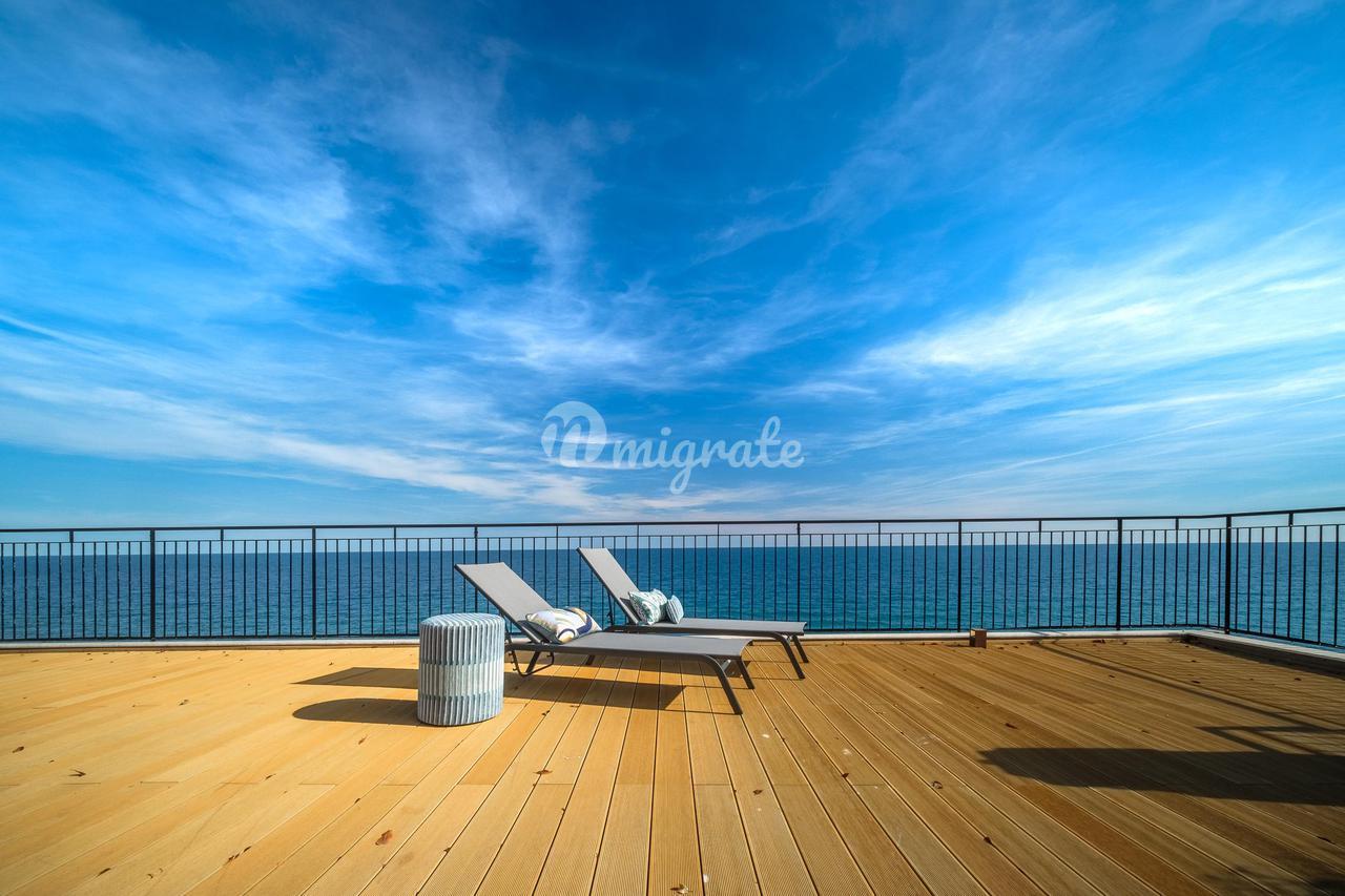 Внутренний лифт ведет на верхний этаж, включающий гостиную и кухню площадью 26 кв.м. Терраса на шестом этаже, вымощенная тиковым деревом, площадью около 150 кв.м с видом на море оборудована раковиной на открытом воздухе и кладовой.