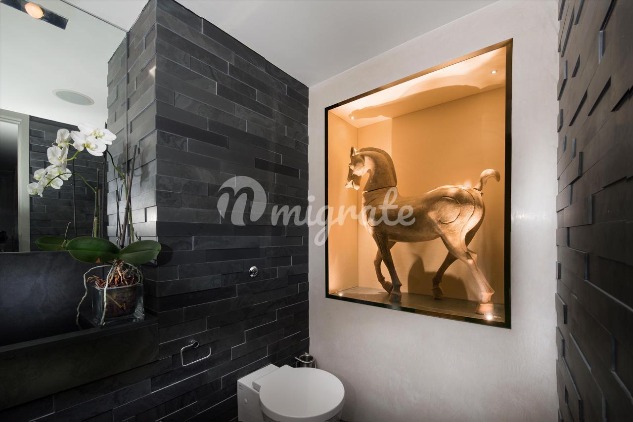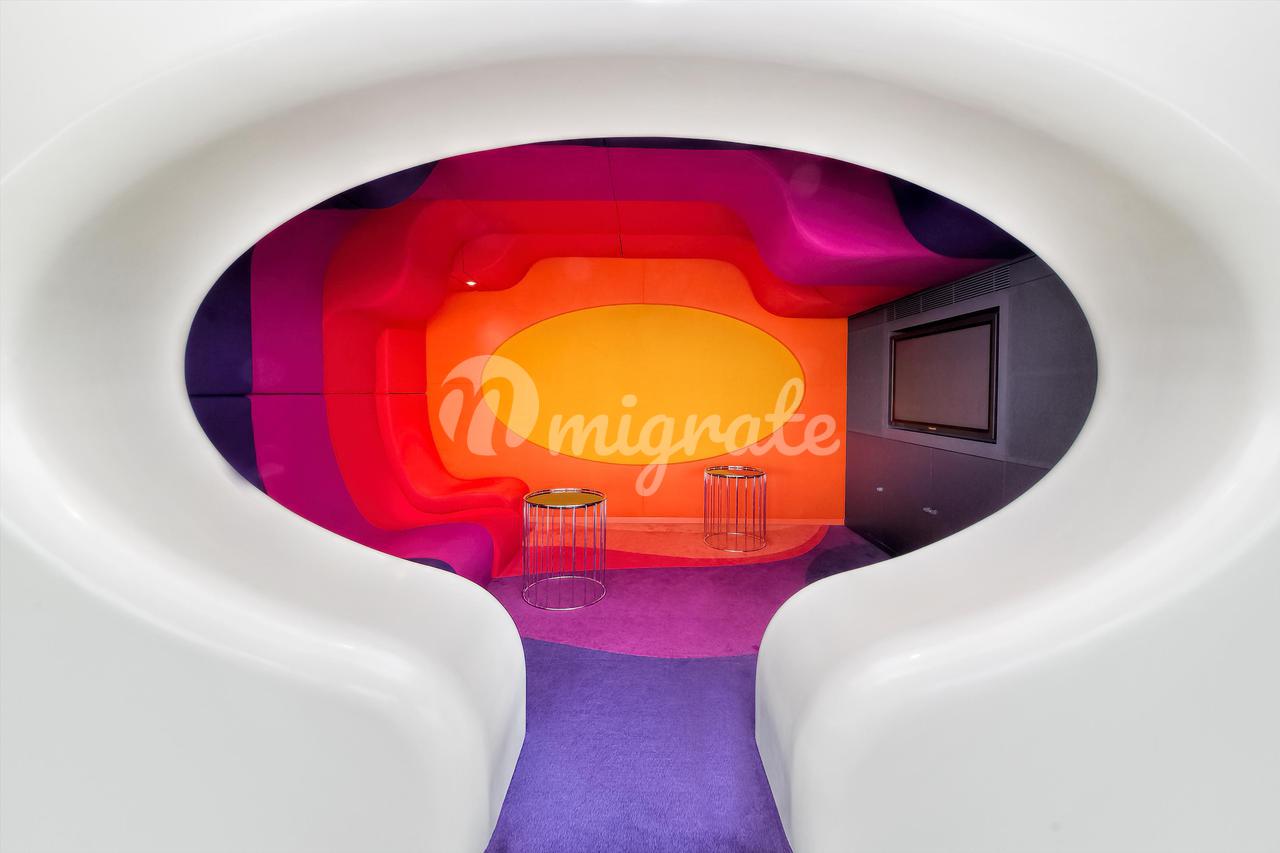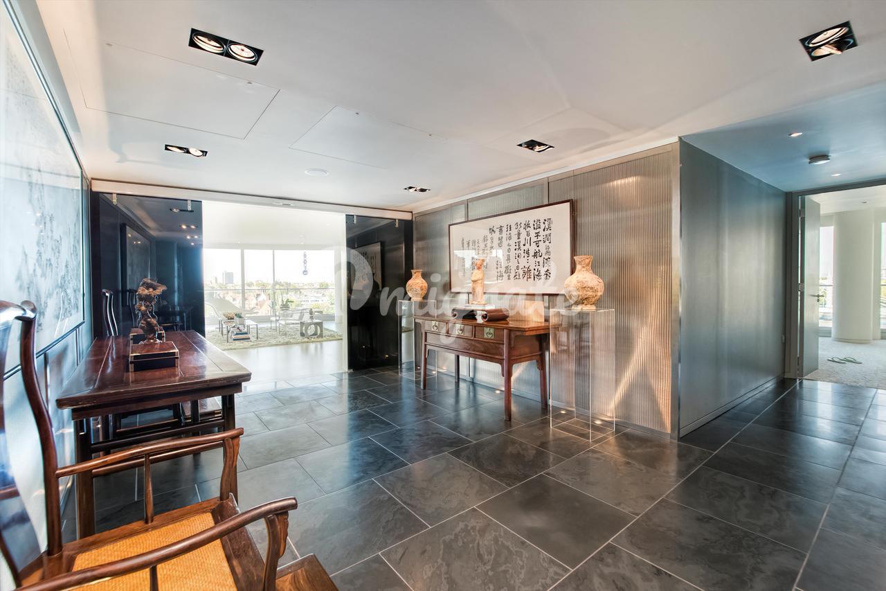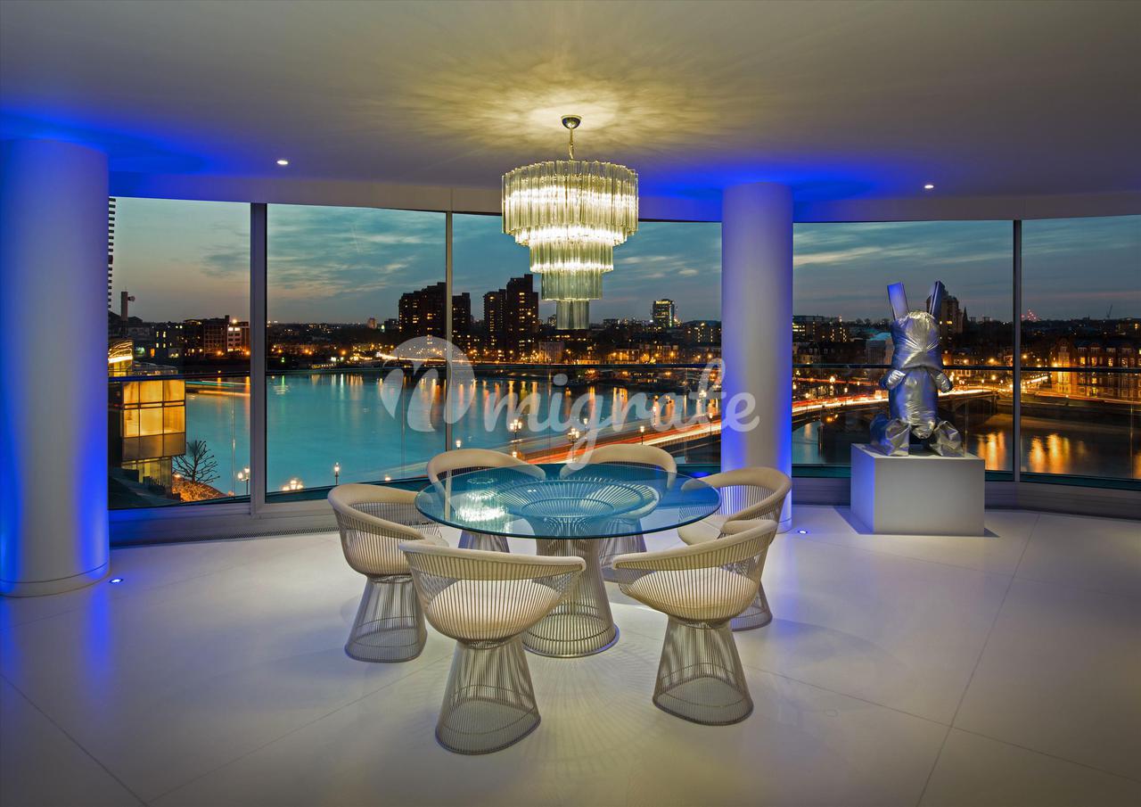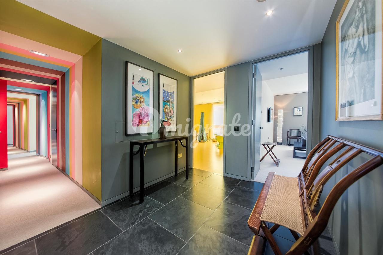 Это гарантирует непревзойденный вид из основных комнат и максимальное использование внутреннего пространства. Огромная приемная имеет холодную белую палитру и включает в себя контрастные средства массовой информации, оформленные в спектре смелых цветов. Кроме того, зеркальный анклав Вернера Пантона с пузырьковыми стульями создает впечатление нависания над Темзой. Причудливая система освещения формирует фон для этой инсталляции и создает эффект остановки шоу в этой уже потрясающей комнате. Просторный коридор, оформленный в модных темных тонах, ведет в спальные помещения.