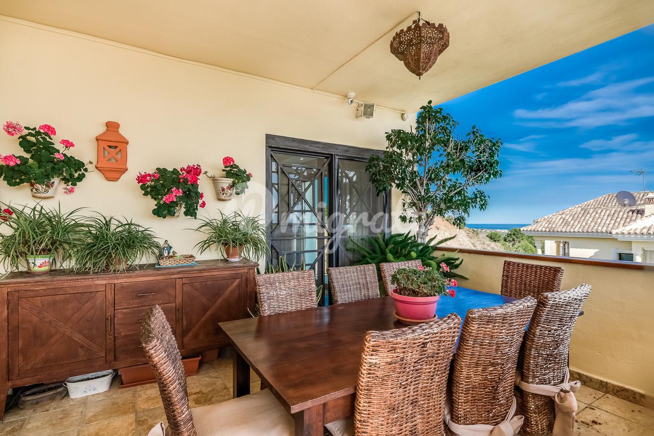 Жилье распределено по 2 уровням. На первом этаже есть фойе с гостевым туалетом, гостиная с камином и отдельная столовая, обе с выходом на крытую террасу с видом на побережье Средиземного моря. Полностью оборудованная кухня с бытовой техникой Samsung и Siemens и прачечная, две спальни с ванными комнатами и террасы с видом на горы.