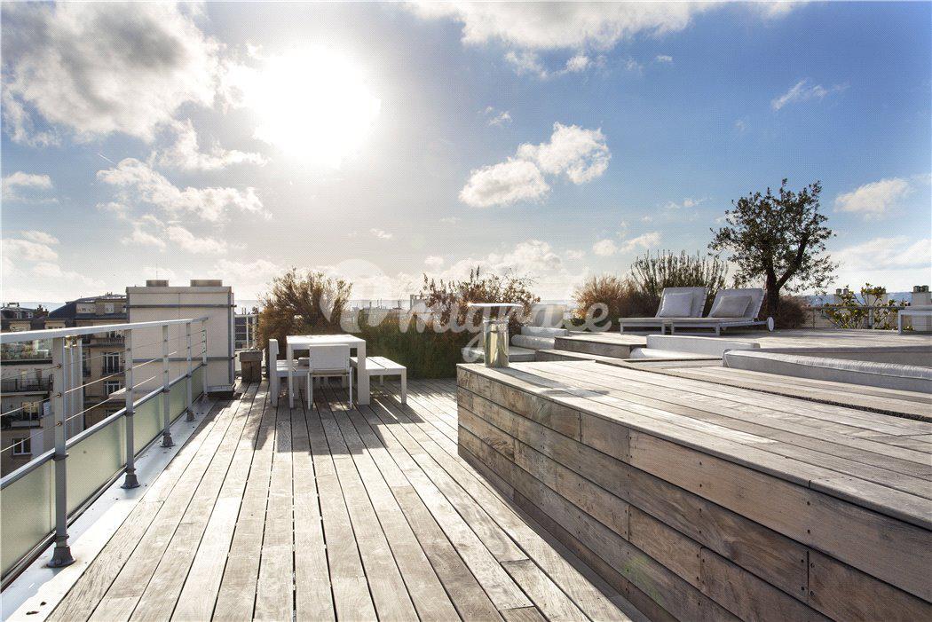 Роскошные апартаменты с видом на Эйфелеву башню расположены в центре Парижа. Апартаменты находятся на 8 этаже и включают гостиную с выходом на просторную террасу, столовую, библиотеку, кухню, 2 спальни, гардеробную, а также террасу на крыше с захватывающими видами на город. Дом оснащен лифтом, на цокольном этаже находится гараж.