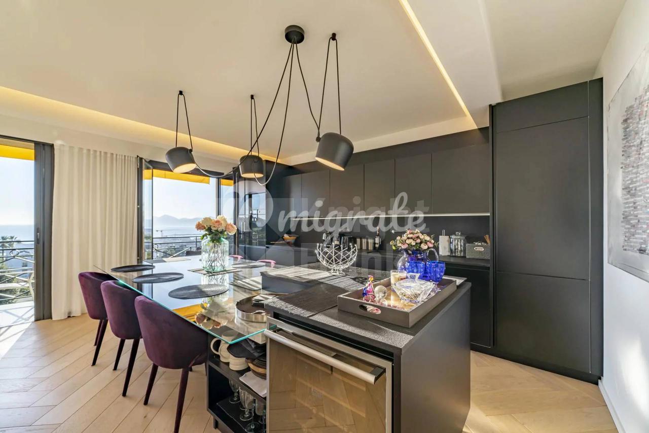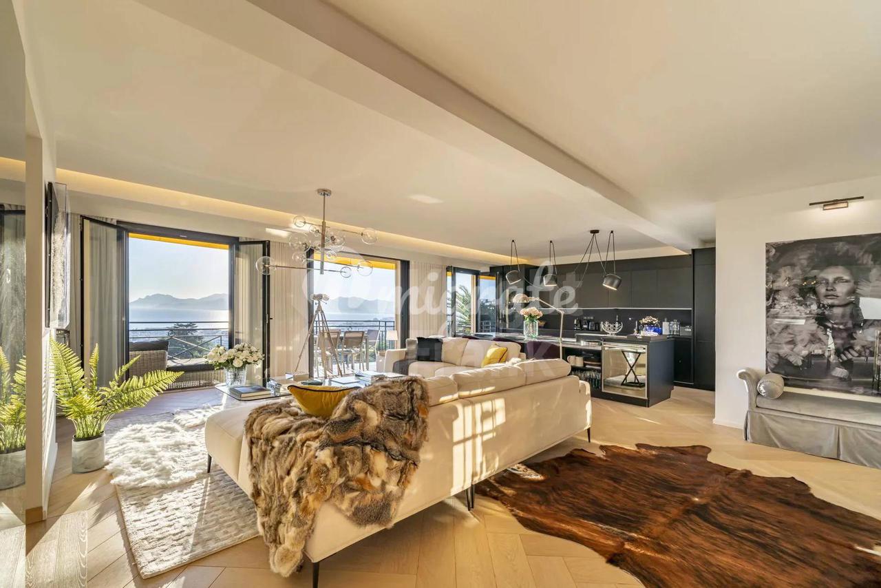 Панорамные окна открывают великолепный вид на Каннский залив и горы Эстерель. В апартаментах также есть терраса и 3 балкона.