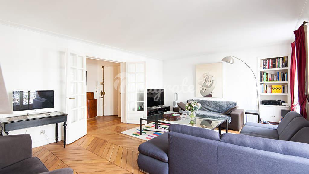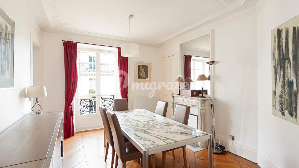 Апартаменты расположены в Париже в 8-ом округе в очень востребованном районе Вилье, рядом со школами и магазинами, в прекрасном здании на 4-ом этаже. Апартаменты состоят из просторной гостиной, столовой, кухни, кабинета, 3 спален и 2 ванных комнат. В квартире есть камины.