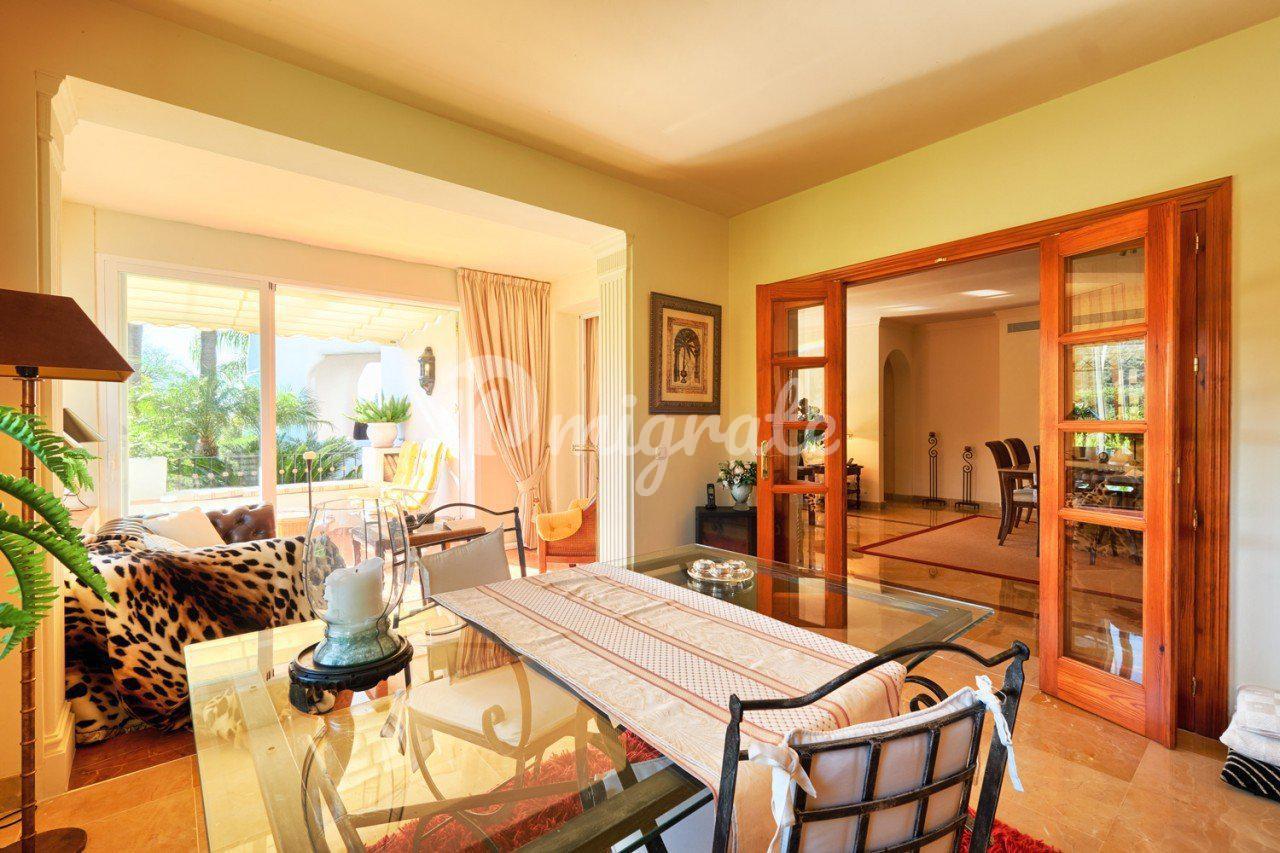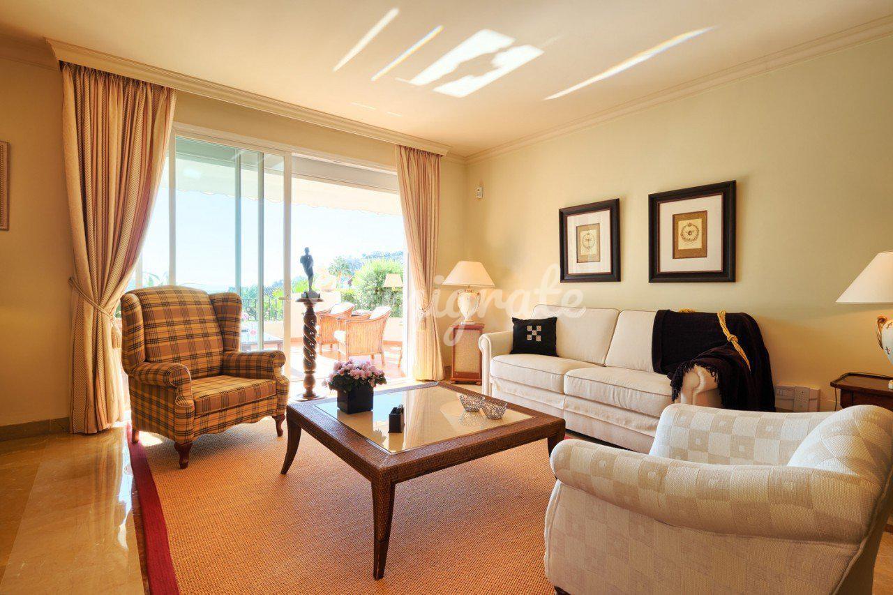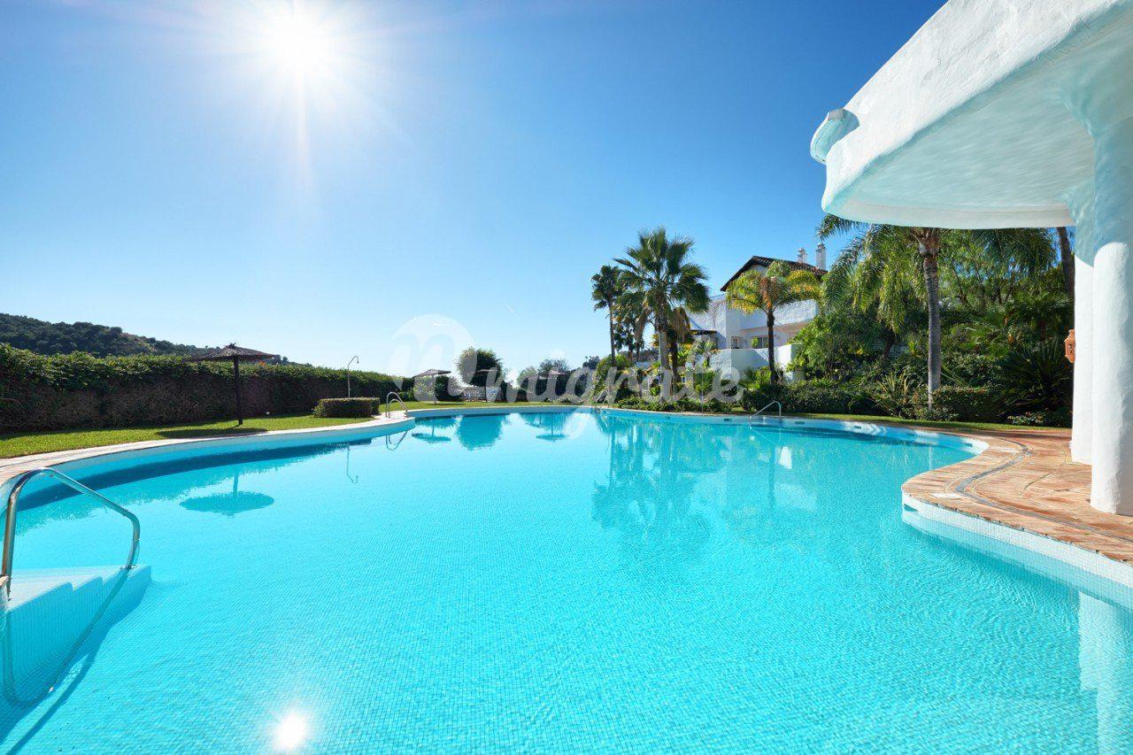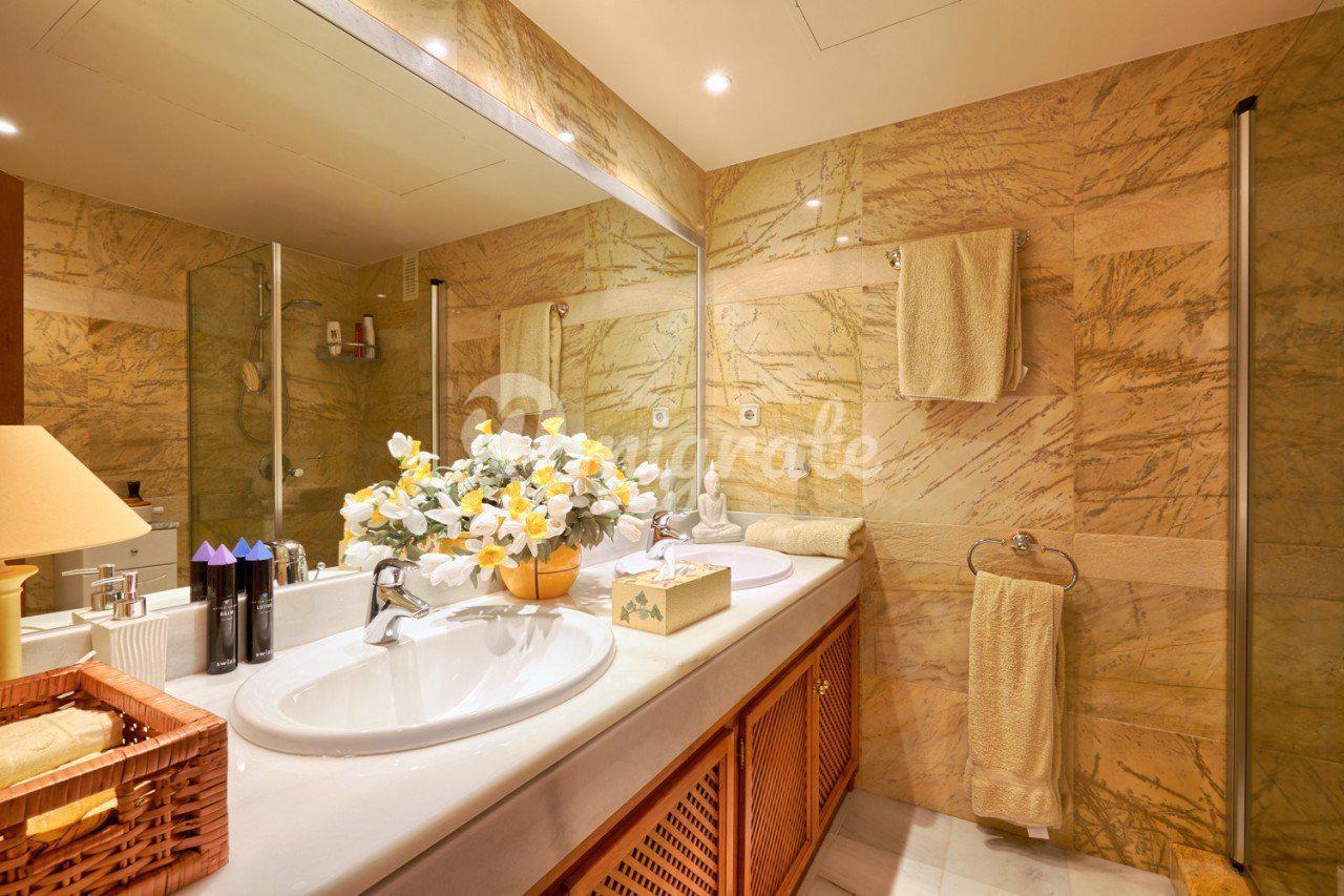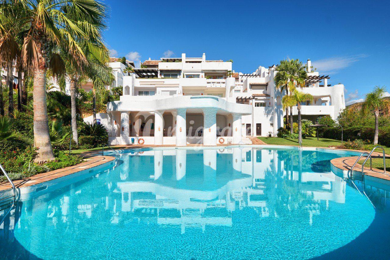 Просторные 3х-спальные апартаменты, расположенные на первом этаже закрытого охраняемого комплекса, в Бенахавис. Апартаменты располагают большой гостиной и столовой, полностью оборудованной кухней с прачечной, главной спальней с ванной комнатой, двумя гостевыми спальнями и двумя ванными комнатами. Все спальни имеют выход на террасы, с красивым видом на море, гольф поле и горы. В стоимость входит место в подземной парковке и кладовка. На территории комплекса ухоженный сад и бассейн.