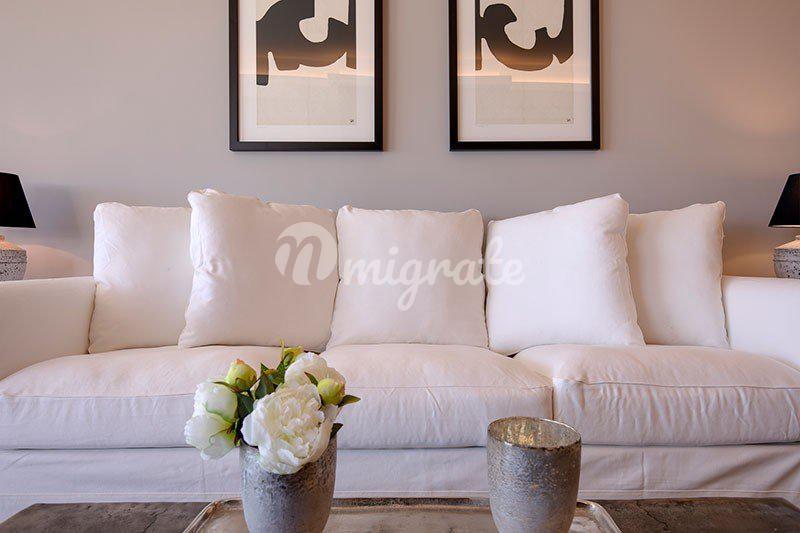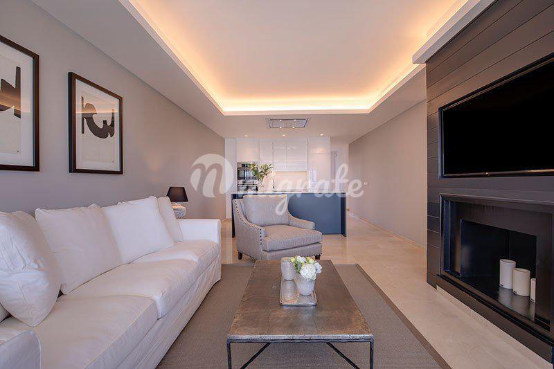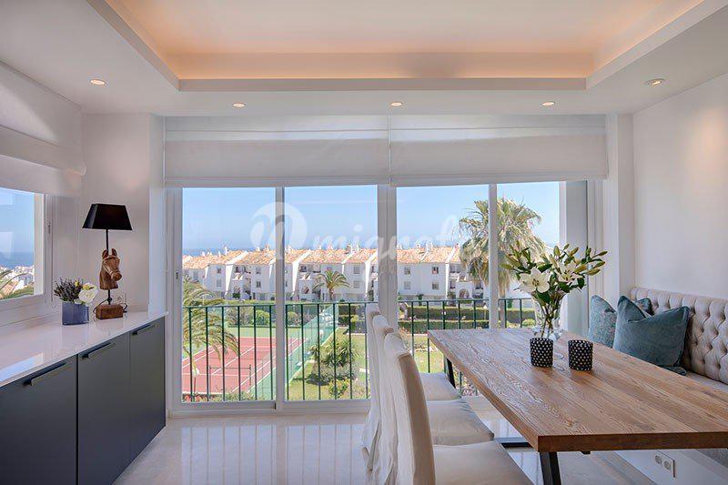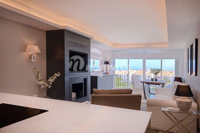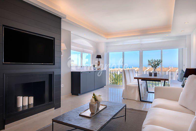Апартаменты с видом на море, расположенные в районе Новая Андалусия, Марбелья. Закрытый охраняемый комплекс Urb. Cerro Blanco имеет живописную андалузскую архитектуру, ландшафтные сады. Апартаменты полностью обновлены и оформлены в современном дизайнерском стиле. В апартаментах три спальни, две ванные комнаты. Прекрасная гостиная с камином и открытая оборудованная кухня, из гостиной открывается прекрасный вид на сады и море. Апартаменты продаются полностью меблированными. Подземный гараж на один автомобиль. Идеальная инвестиция для тех, кто хочет приобрести недвижимость в пешей доступности от пляжа, магазинов, ресторанов и других удобств. В 5 минутах от торгового центра Centro Plaza, в 10 минутах ходьбы от Пуэрто Банус.