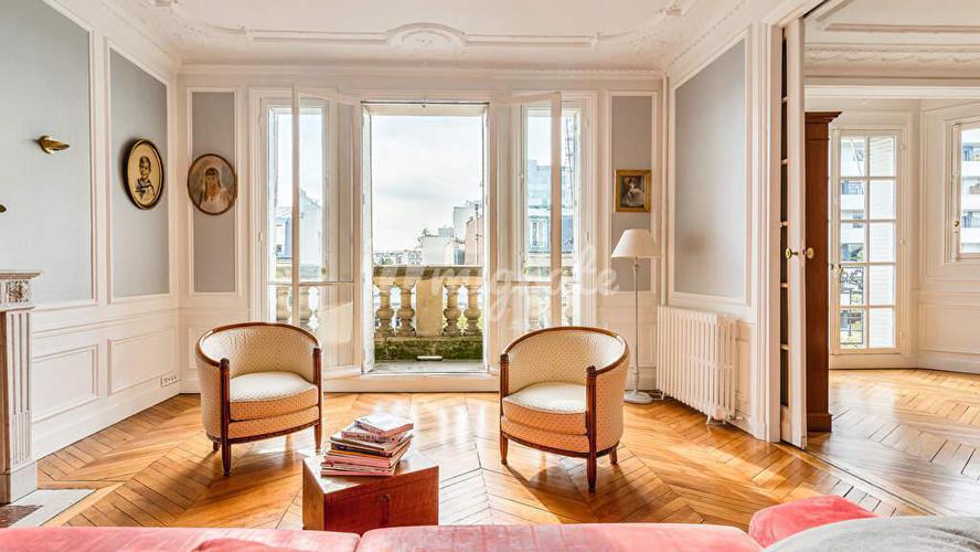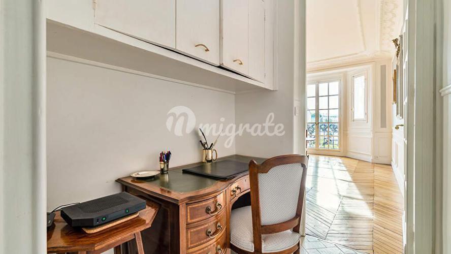 На тихой улице, в самом сердце оживленного района Виктора Гюго и его магазинов. На первом этаже на лифте великолепного постосмановского углового здания с парой постоянных консьержей. Эта квартира сохр