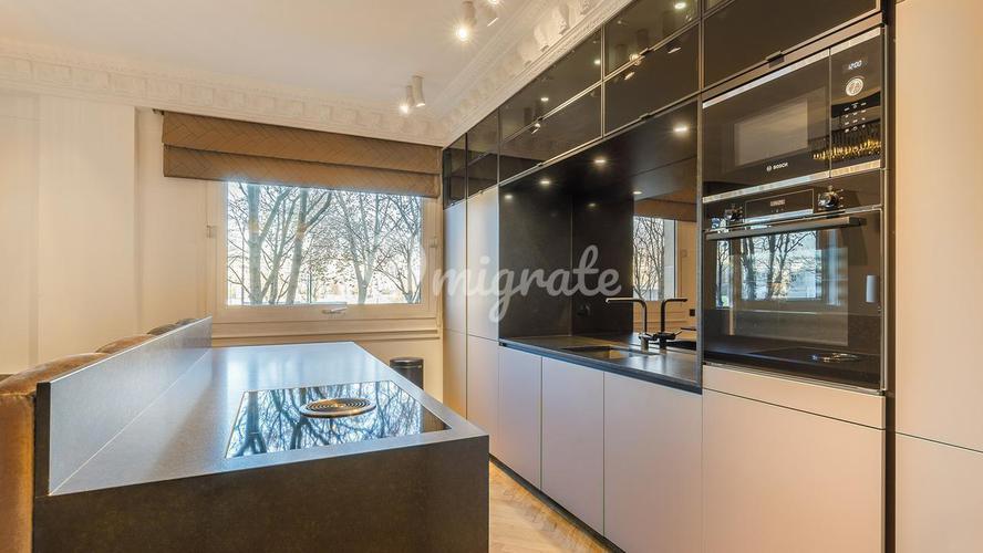 Эта красивая квартира расположена на 4-м этаже элегантного старинного здания 1862 года и имеет жилую площадь 271,25 кв.м. С очаровательным входом, он включает в себя двойную гостиную с камином, хорошо