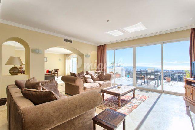 Просторный 4-х спальный пентхаус-триплекс в Las Colinas de la Heredia, Бенаавис. Ориентация на Юг с панорамным видом на побережье и Средиземноморье.Первый этаж: Большая гостиная и столовая с камином и