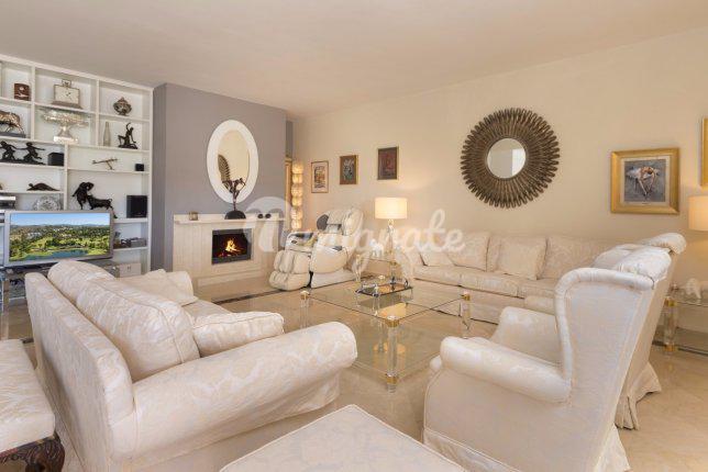 Уникальный четырехспальный двухуровневый пентхаус, тихий и приватный с прекрасным панорамным видом на гольф поле, побережье и Средиземное море. Первый этаж: Просторная гостиная и столовая с открытой п