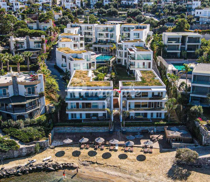 Роскошная бутик-резиденция с частным песчаным пляжем в Бодруме. В апартаментах и на территории: 2 спальни, 1 гостиная и кухня, 1 ванная комната, большой балкон с видом на море, панорамный вид, частный