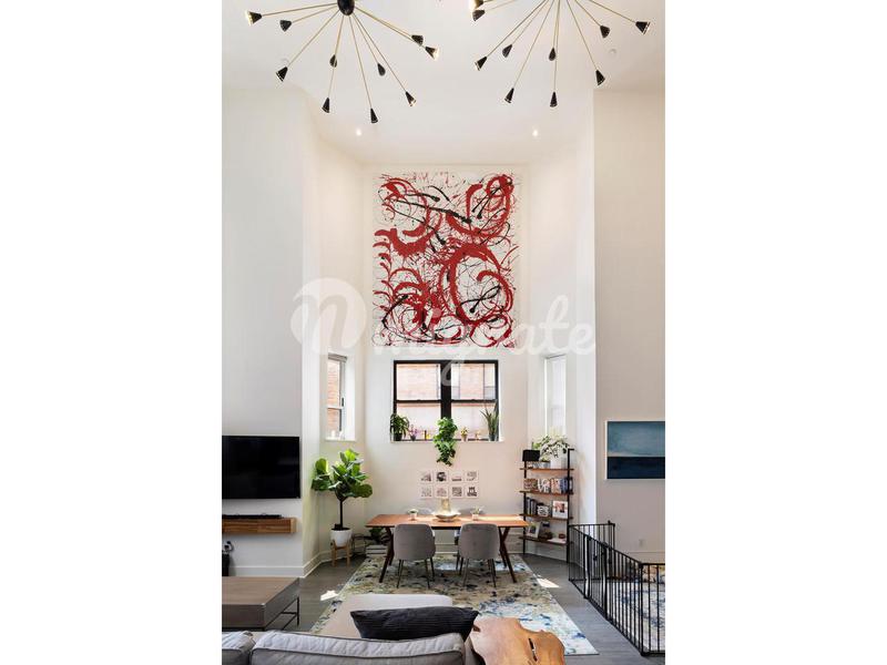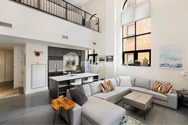 Этот двухуровневый лофт с одной спальней и двумя ванными комнатами в благоустроенном здании имеет потолки высотой 22 фута и кухню открытой планировки с нестандартной мебелью и техникой из нержавеющей