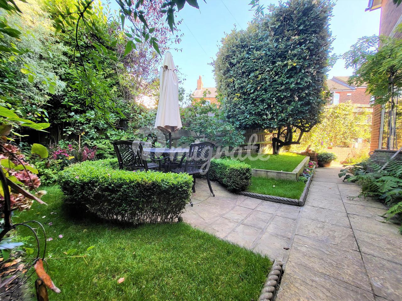 Внешне красочный и частный сад был благоустроен, чтобы включать в себя патио, идеально подходящее для трапезы на свежем воздухе, и лужайку.