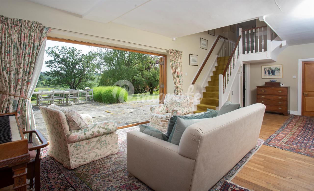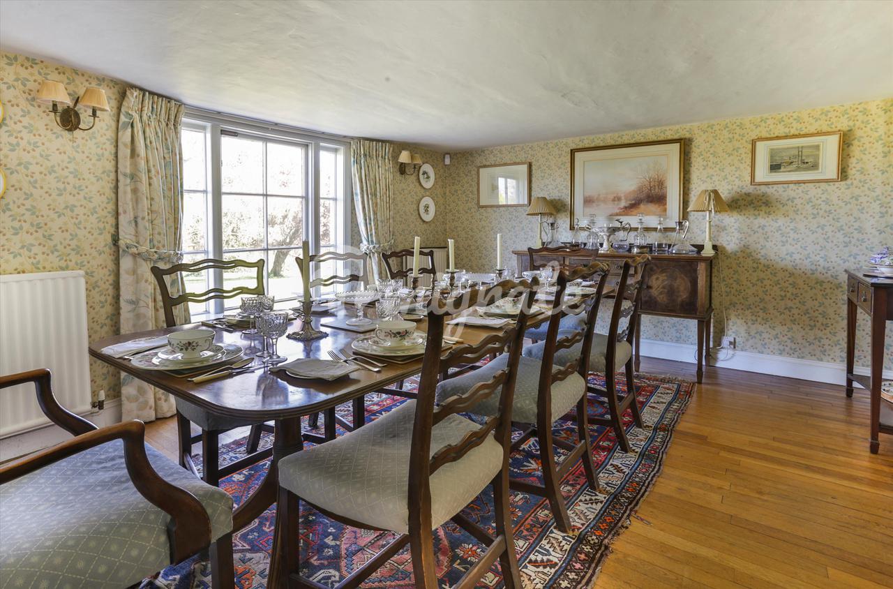Из приемной дверь ведет в гостиную со стеклянными дверями наружу и открытым камином. Эта комната находится рядом с кухней/комнатой для завтрака с масляной печью AGA с четырьмя печами и дверью, ведущей в столовую, которая имеет отдельную дверь в приемную и двери на террасу. Подсобное помещение/кладовая в задней части дома имеет выход наружу, вместе с кладовой, дополнительным туалетом и котельной.