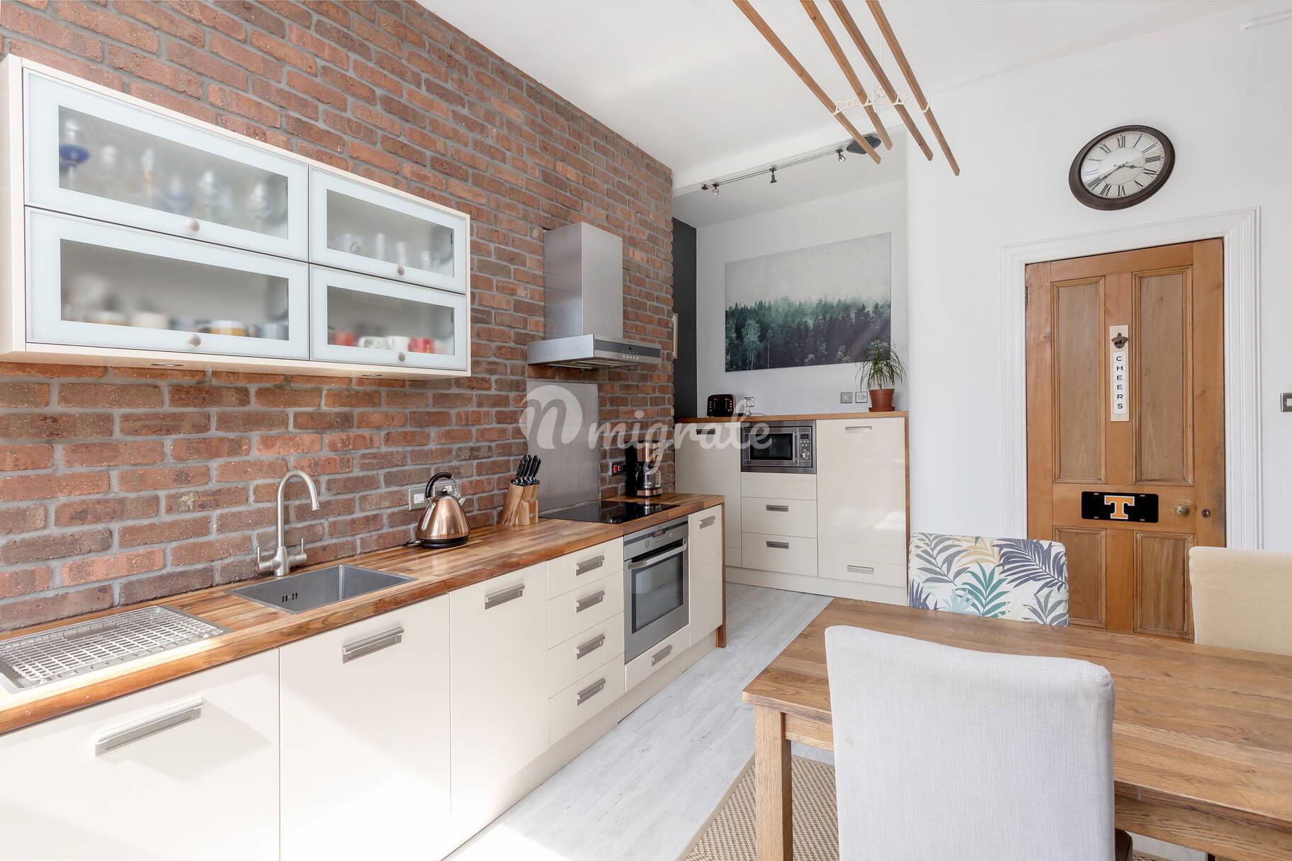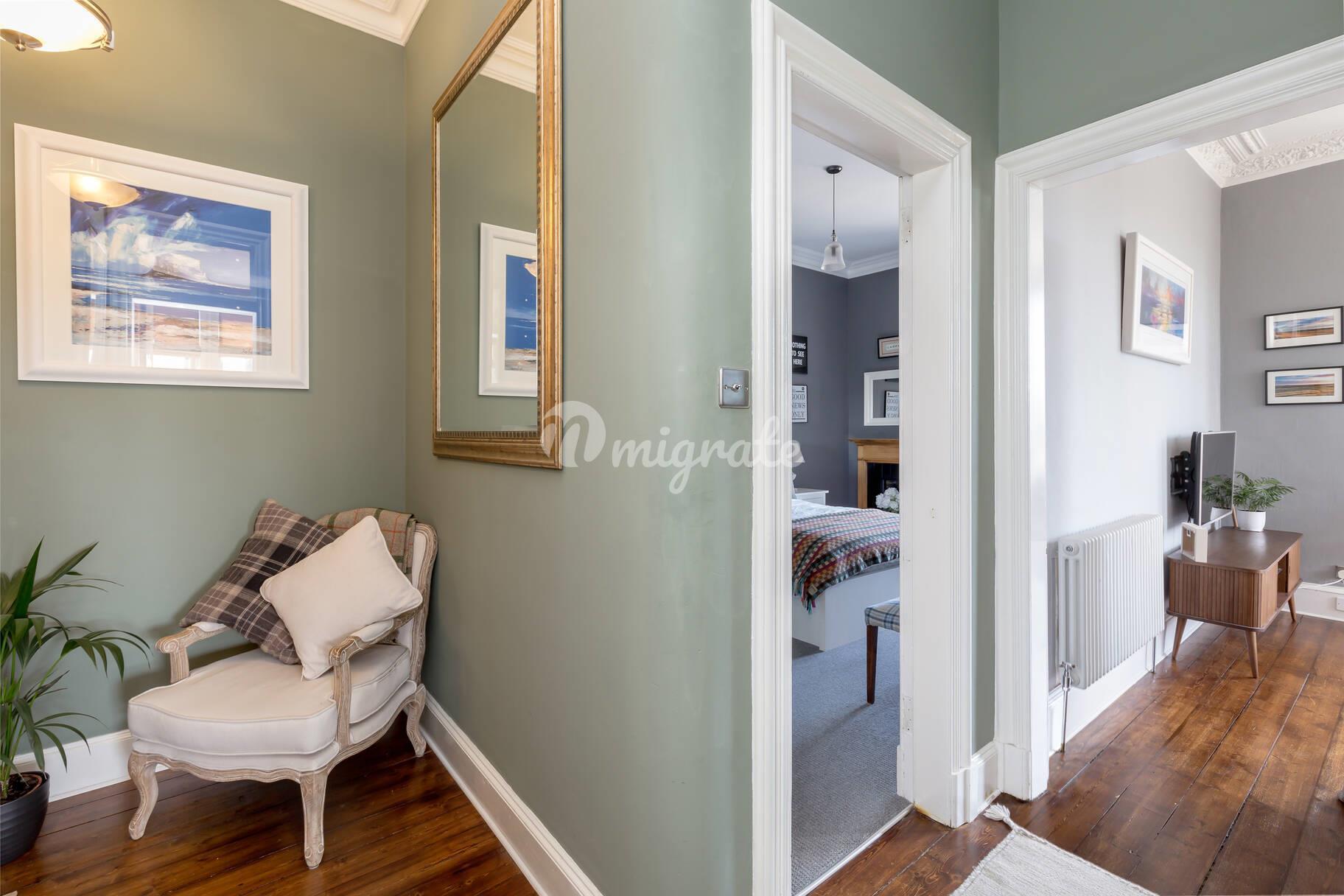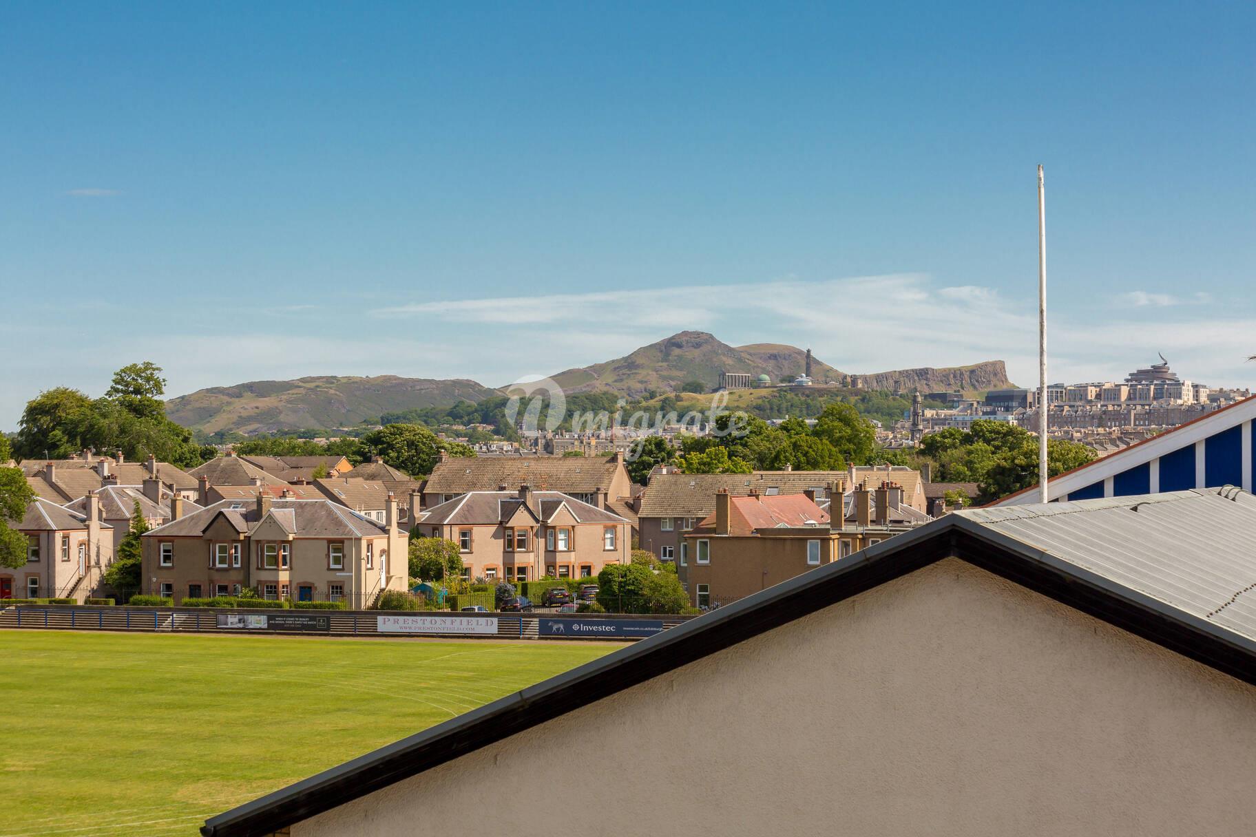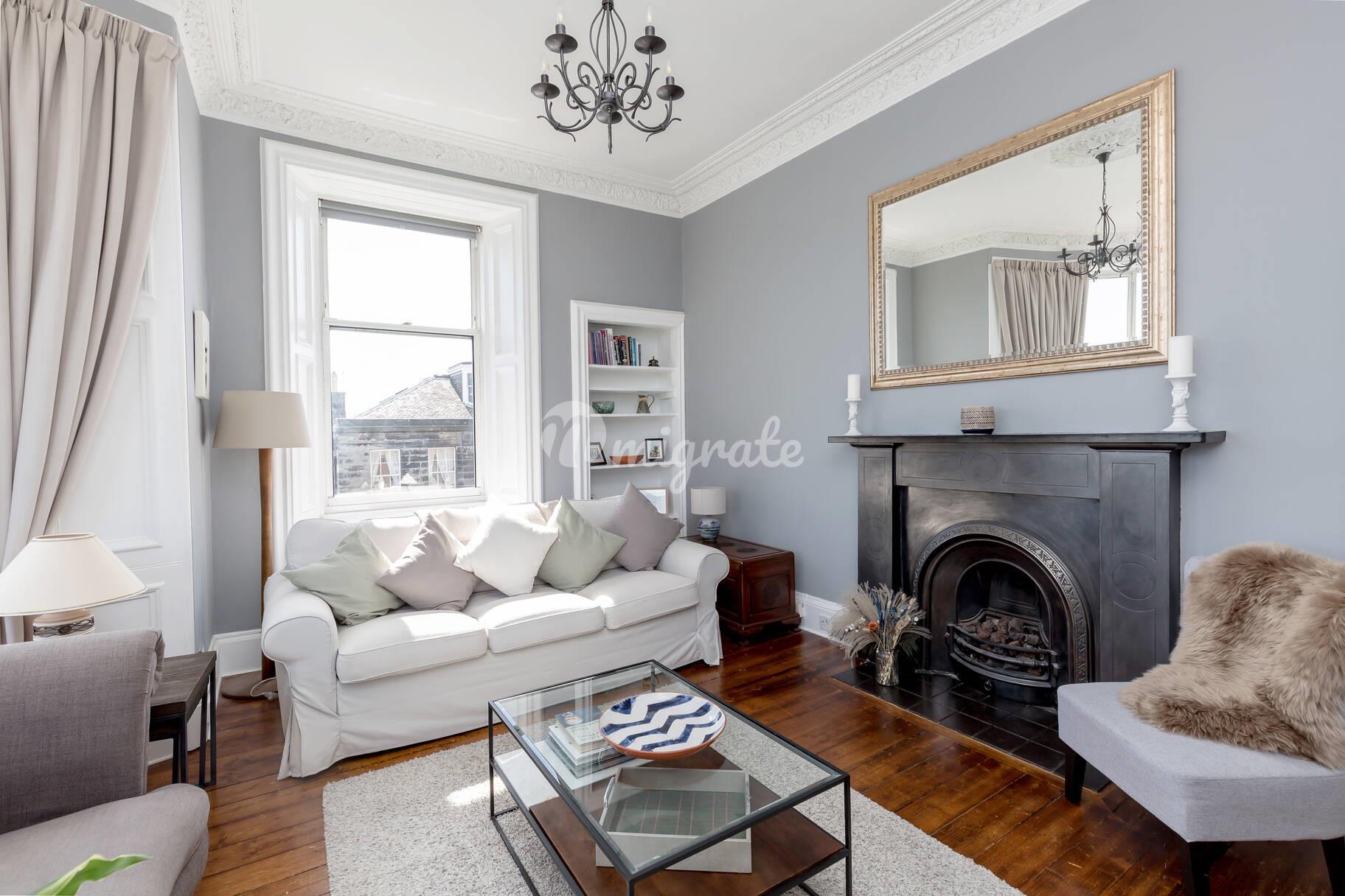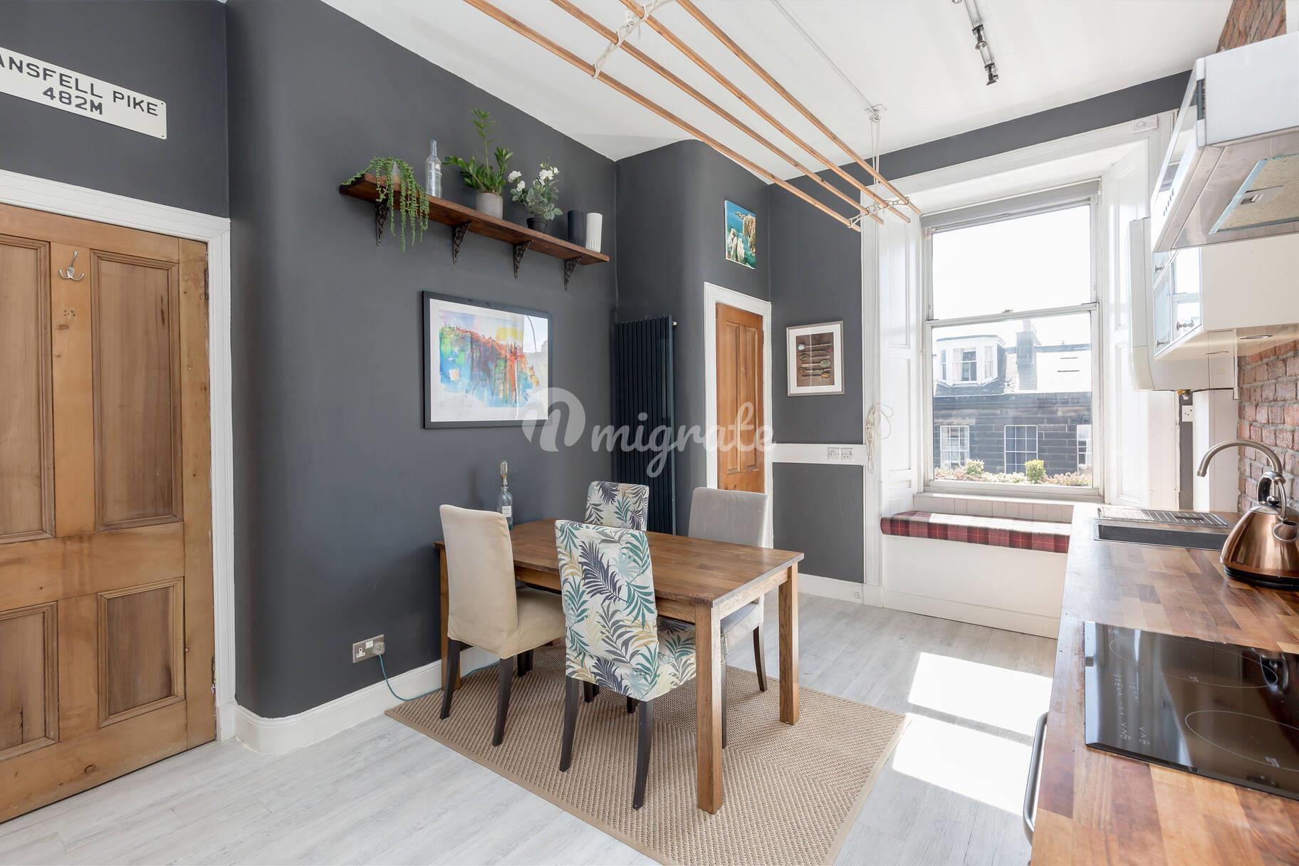 В гостиной идеально сочетаются оригинальные черты замысловатого карниза и исключительного камина с современным дизайном интерьера. Из больших окон открывается панорамный вид на горизонт Эдинбурга, включая Эдинбургский замок и резиденцию Артура. Светлая и хорошо спланированная кухня с облицовкой из кирпича и высоким потолком позволяет создать просторное семейное пространство или место для развлечений.