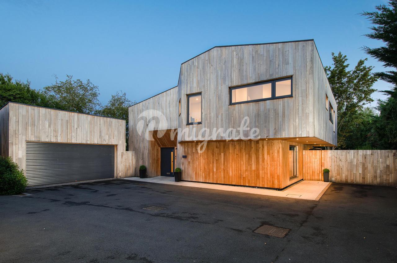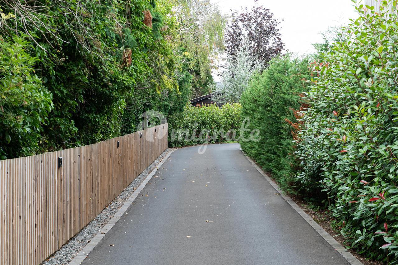 К дому ведет огороженная забором общая подъездная дорога, дающая доступ к гаражу на две машины и обеспечивающая парковку для нескольких автомобилей.