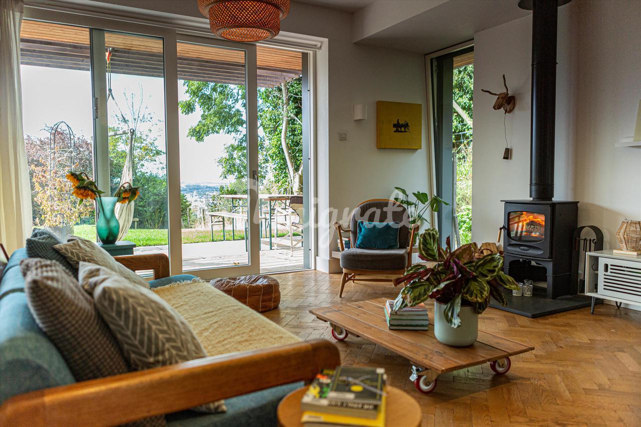 По всей длине этого помещения расположены три пары раздвижных дверей с тройным остеклением, каждая из которых выходит на мощеную веранду. Все ощущение этого жилого пространства биофильно; внутри есть отличная связь с природными элементами снаружи - это прекрасный, расслабляющий дом.