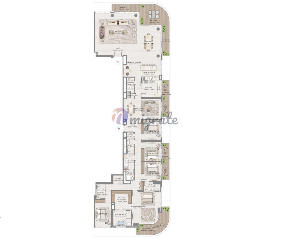 Резиденция располагается на самой вершине изящно спроектированной башни, сдается с полной меблировкой. В каждой резиденции будет собственный бассейн на террасе с 360-градусным видом на Арабский залив. Интерьеры выполнены в мягких пастельных тонах, что способствует созданию умиротворенной атмосферы в доме. Для комфорта жителей представлены инфинити-бассейны, ландшафтный сад, тренажерный зал, зоны для барбекю, площадки для занятий спортом на свежем воздухе и другие удобства.