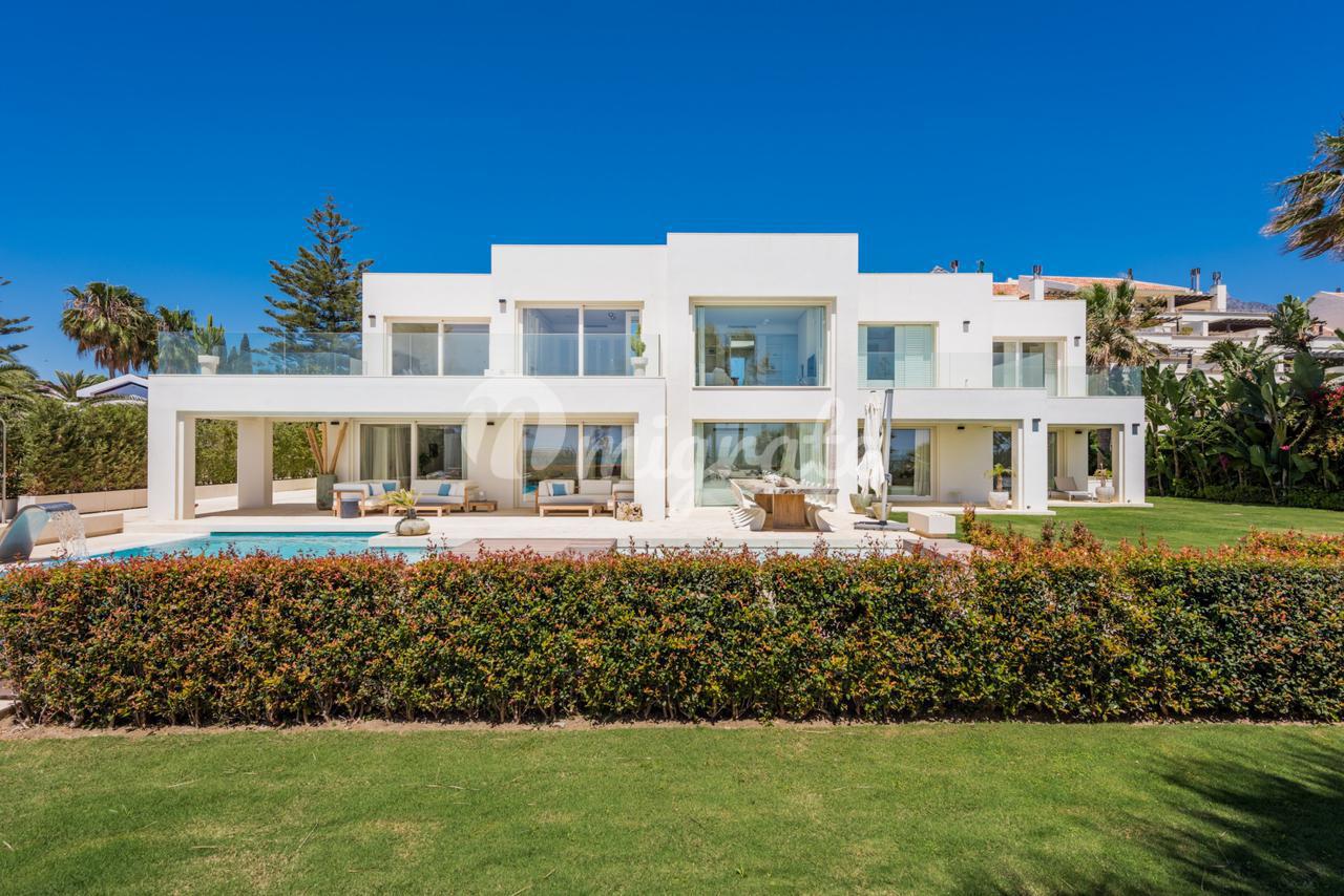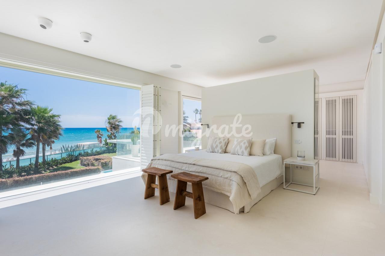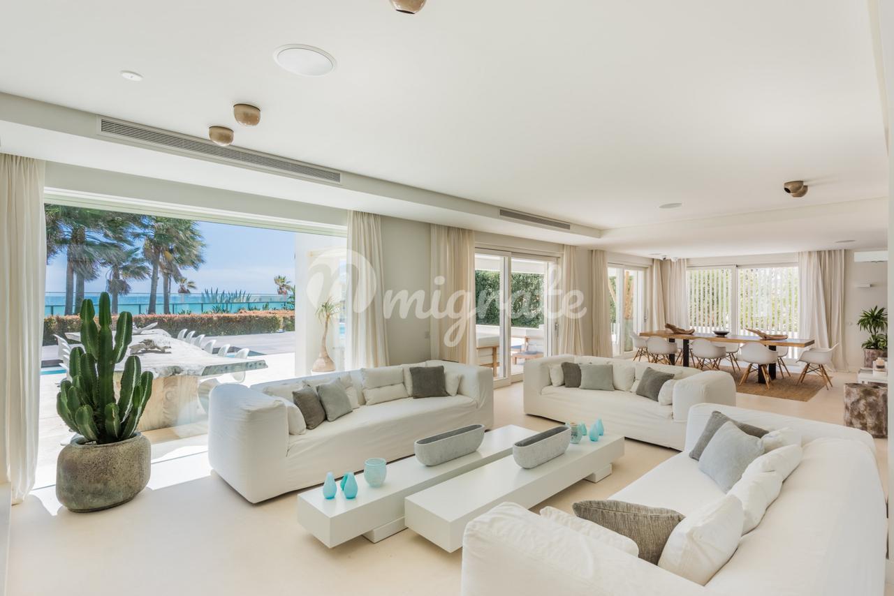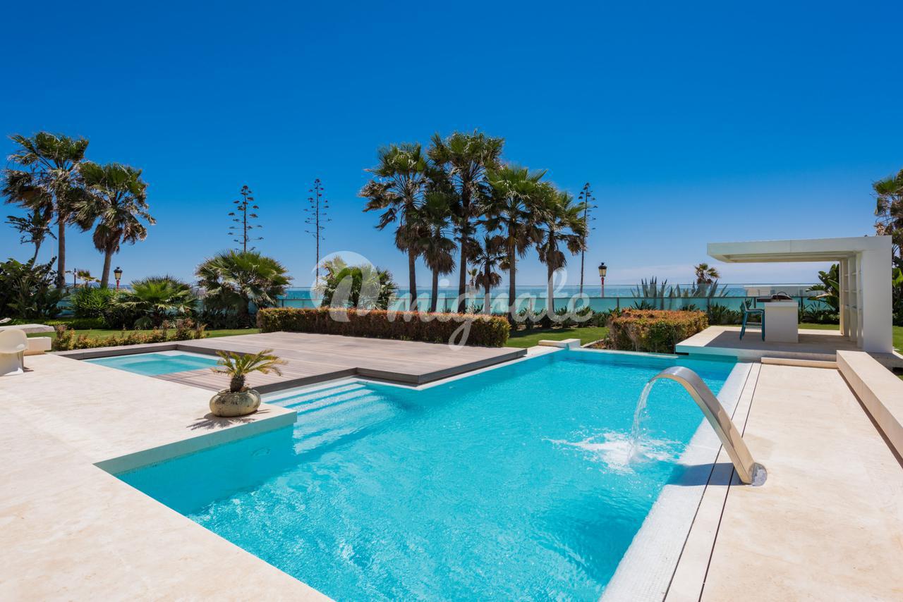 Одна из самых впечатляющих вилл на первой линии пляжа между Пуэрто Банусом и Марбельей. Возможно, это единственный ультрасовременный отель с современным дизайном на Золотой миле, примерно в 20 минутах ходьбы от всех видов удобств в Пуэрто Банусе, примерно в 3,5 км. до поля для гольфа Las Brisas; 3,5 км. до международного колледжа Алоха и 6,5 км. в центр города Марбелья. Эта захватывающая жемчужина сочетает в себе современную архитектуру с непревзойденными интерьерами, инсталляциями и технологиями. В отделке были использованы дерево и мрамор белых оттенков. Его отражение наполняет интерьеры светом. Голубая линия морского берега видна из всех комнат дома. Построенная на трех уровнях, эта ультрасовременная вилла состоит из прихожей с гостевым туалетом, прямоугольной гостиной с газовым камином, обеденной зоны и прилегающей полностью оборудованной кухни, оснащенной электроприборами. Крытая терраса рядом с гостиной выходит на бассейн и джакузи. Кроме того, на первом этаже находится телевизионная комната и две спальни с двуспальными кроватями.