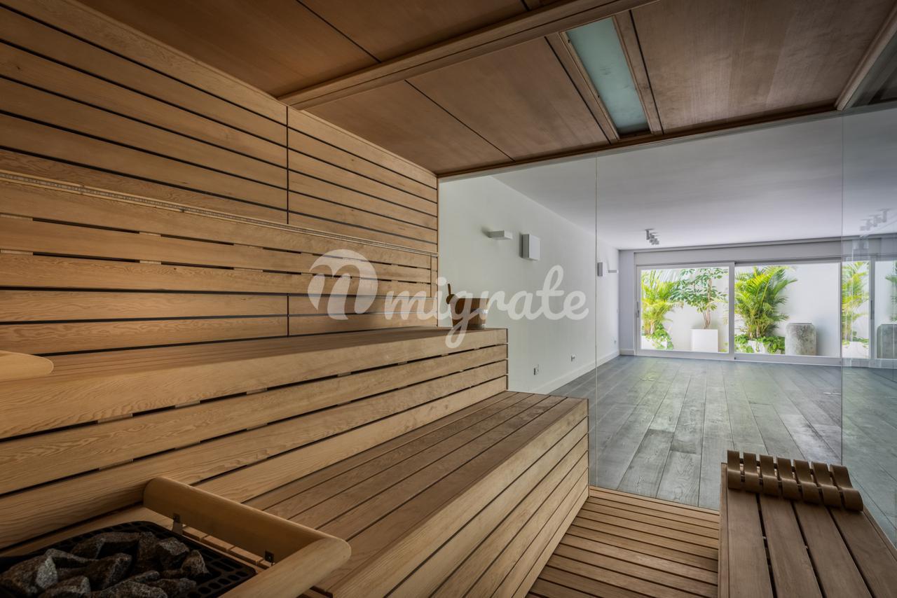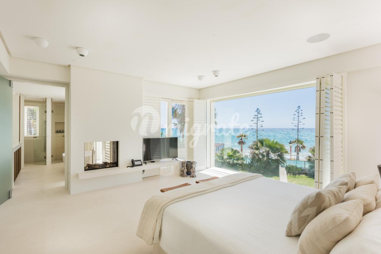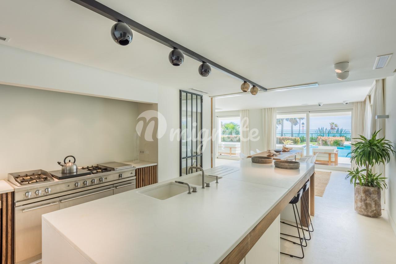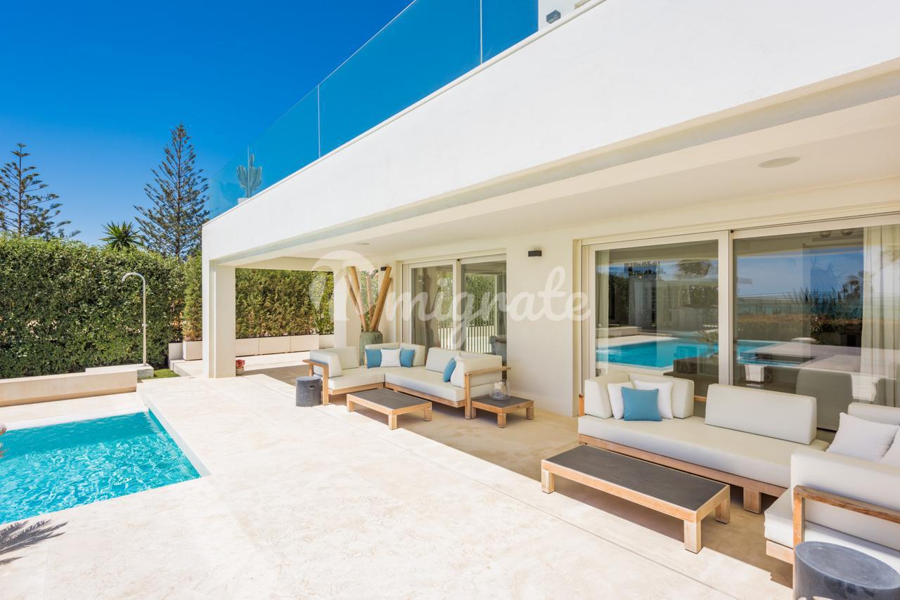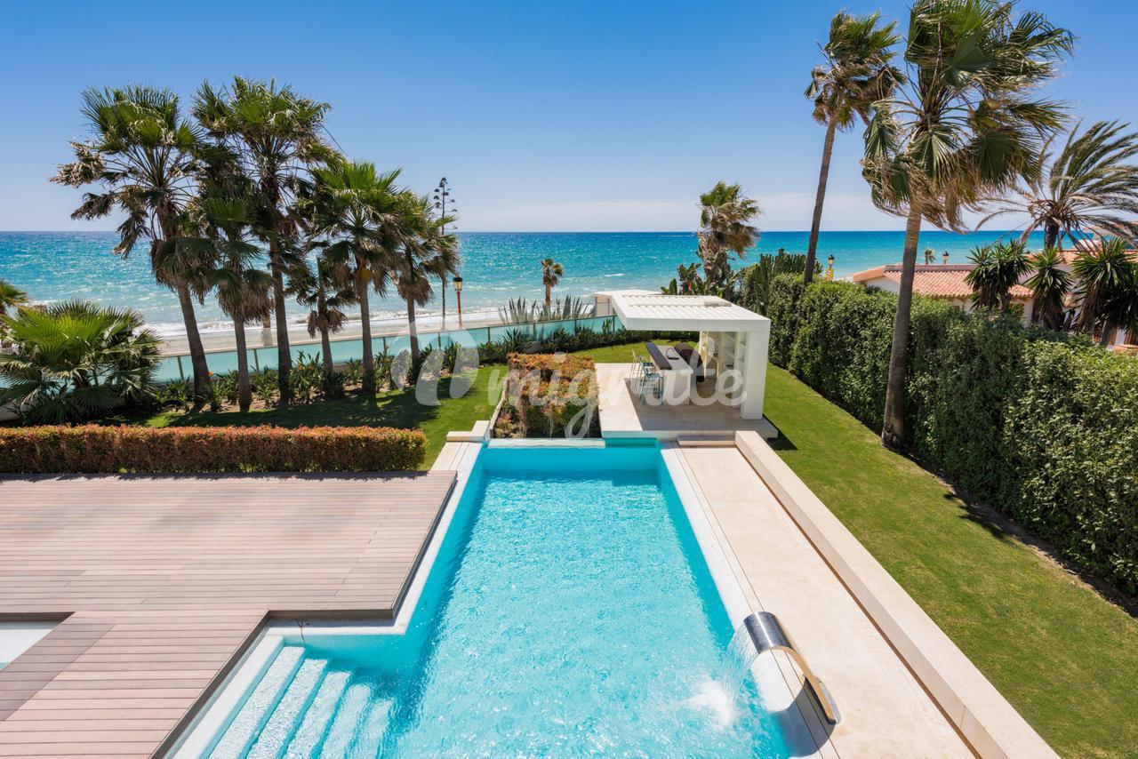 Одна из самых впечатляющих вилл на первой линии пляжа между Пуэрто Банусом и Марбельей. Возможно, это единственный ультрасовременный отель с современным дизайном на Золотой миле, примерно в 20 минутах ходьбы от всех видов удобств в Пуэрто Банусе, примерно в 3,5 км. до поля для гольфа Las Brisas; 3,5 км. до международного колледжа Алоха и 6,5 км. в центр города Марбелья. Эта захватывающая жемчужина сочетает в себе современную архитектуру с непревзойденными интерьерами, инсталляциями и технологиями. В отделке были использованы дерево и мрамор белых оттенков. Его отражение наполняет интерьеры светом. Голубая линия морского берега видна из всех комнат дома. Построенная на трех уровнях, эта ультрасовременная вилла состоит из прихожей с гостевым туалетом, прямоугольной гостиной с газовым камином, обеденной зоны и прилегающей полностью оборудованной кухни, оснащенной электроприборами. Крытая терраса рядом с гостиной выходит на бассейн и джакузи. Кроме того, на первом этаже находится телевизионная комната и две спальни с двуспальными кроватями.