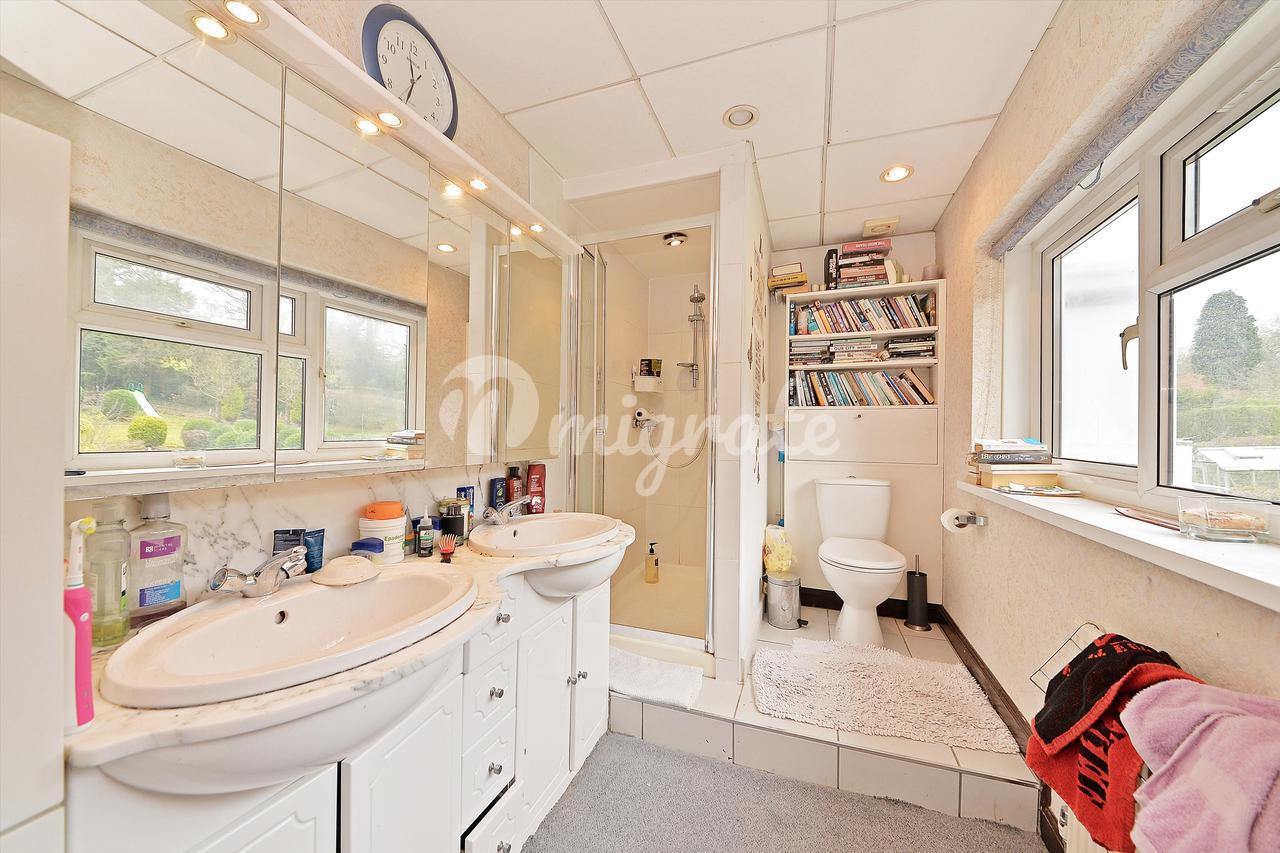 Семейная ванная комната хорошего размера с угловой душевой кабиной и двойной раковиной для умывания. Отдельный туалет находится по соседству.