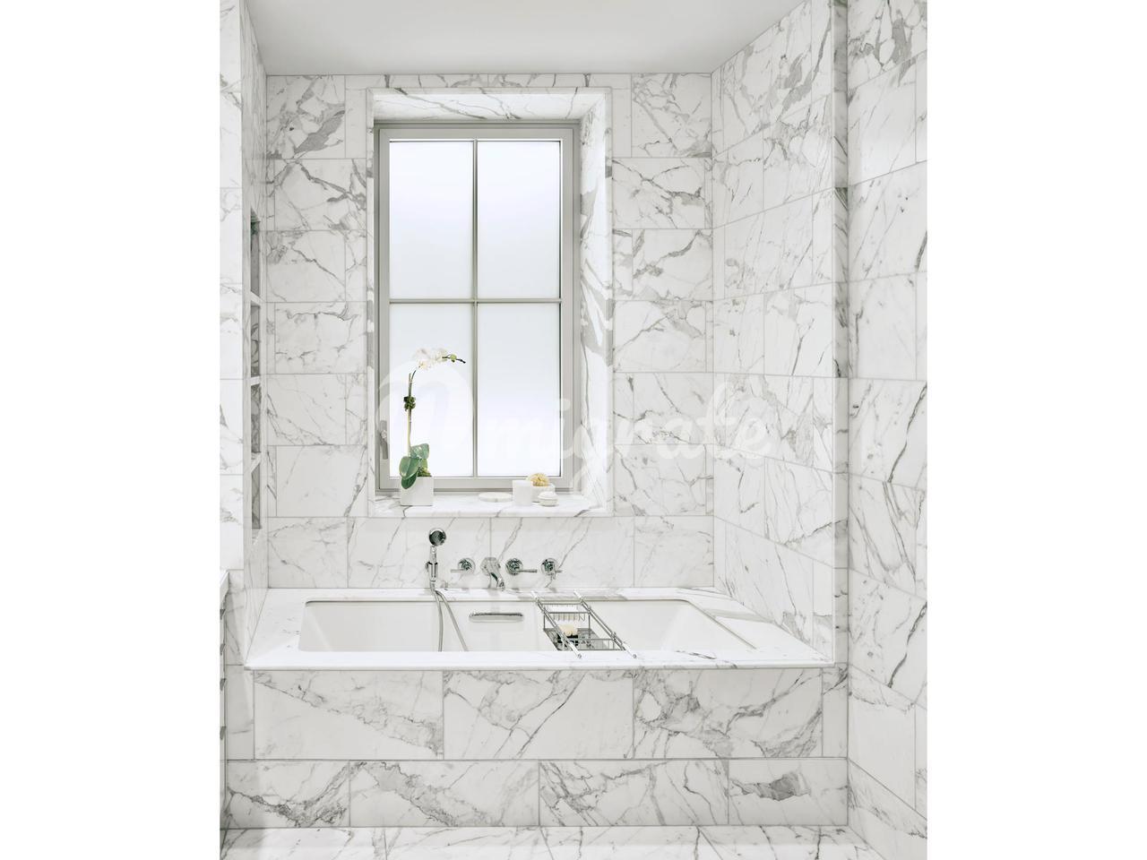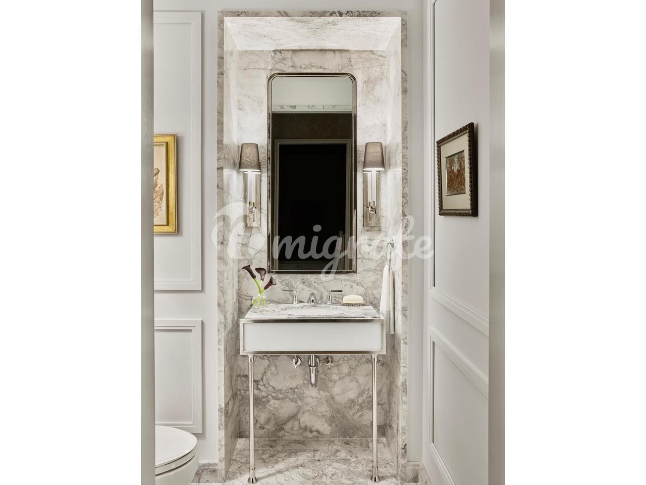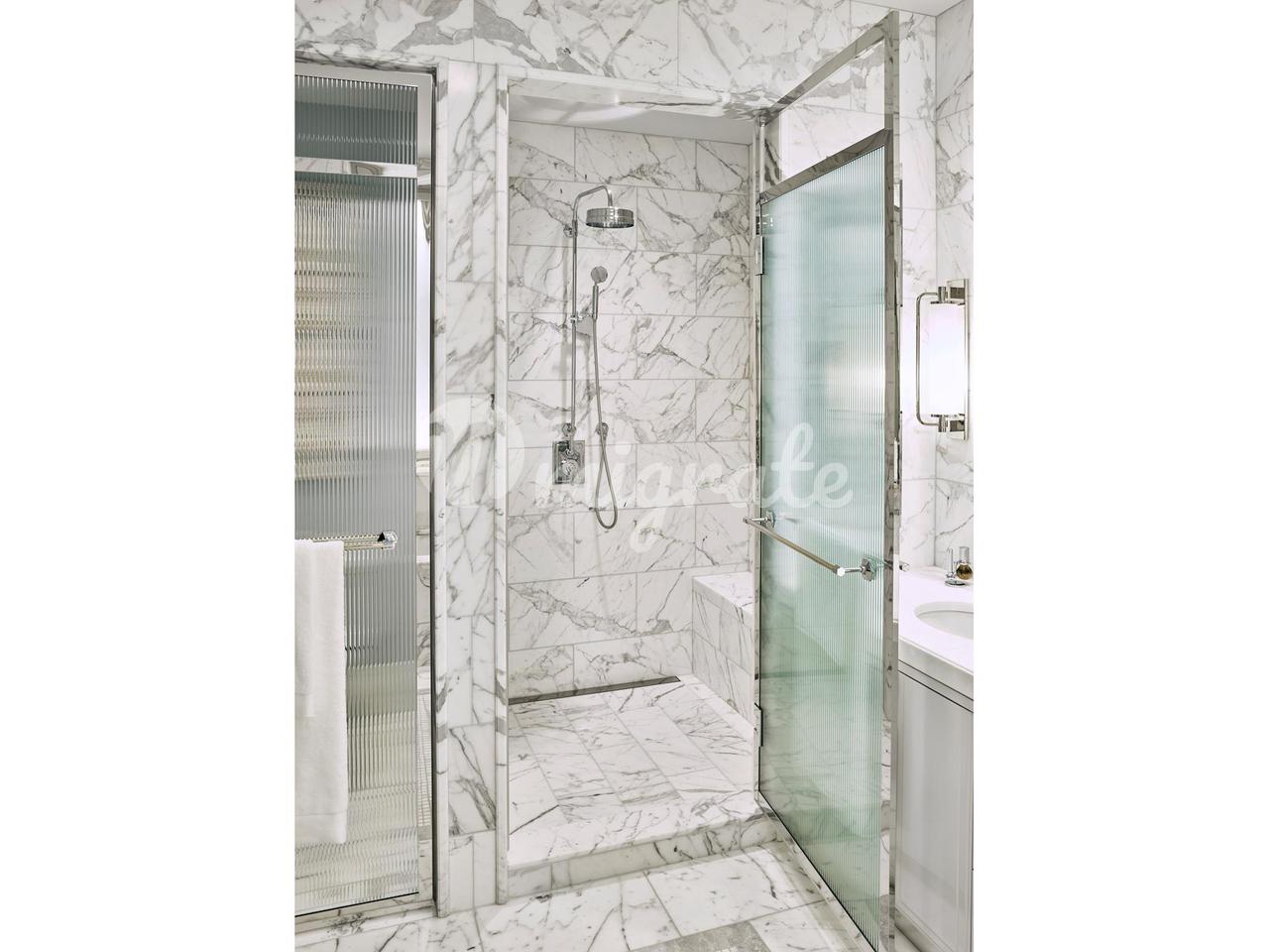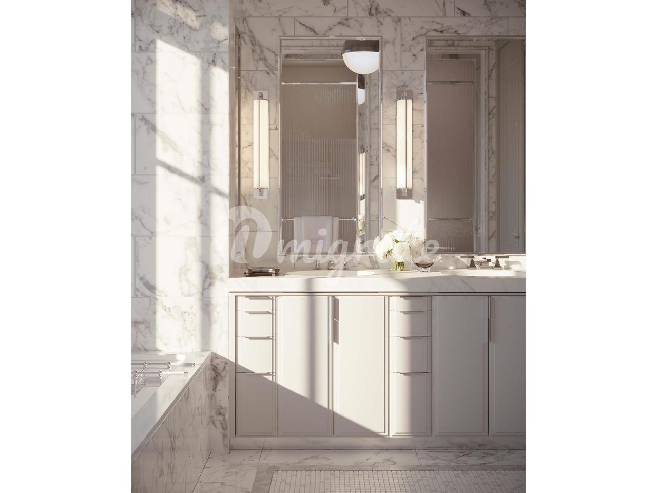 Во всех пяти дополнительных спальнях есть ванные комнаты, а между пятой и шестой спальнями расположен дополнительный кабинет с окном. В дополнительных ванных комнатах есть изготовленный на заказ туалетный столик с мраморной столешницей Statuarietto, раковина Kohler, аптечка Robern со встроенным зеркалом, бра из полированного никеля и фурнитура Lefroy Brooks. Белые стеклянные стены и мраморный пол Statuarietto ведут к глубокой ванне Kohler с мраморной палубой Statuarietto. Туалетная комната ослепляет изготовленным на заказ туалетным столиком, столешницей из мрамора Manhattan Dark, великолепной окантовкой, основанием и полом из мрамора White Fantasy, а также фурнитурой Lefroy Brooks.