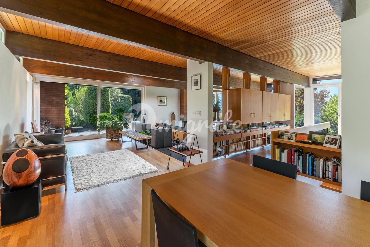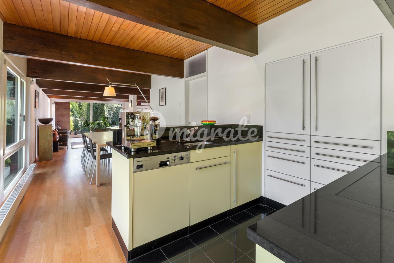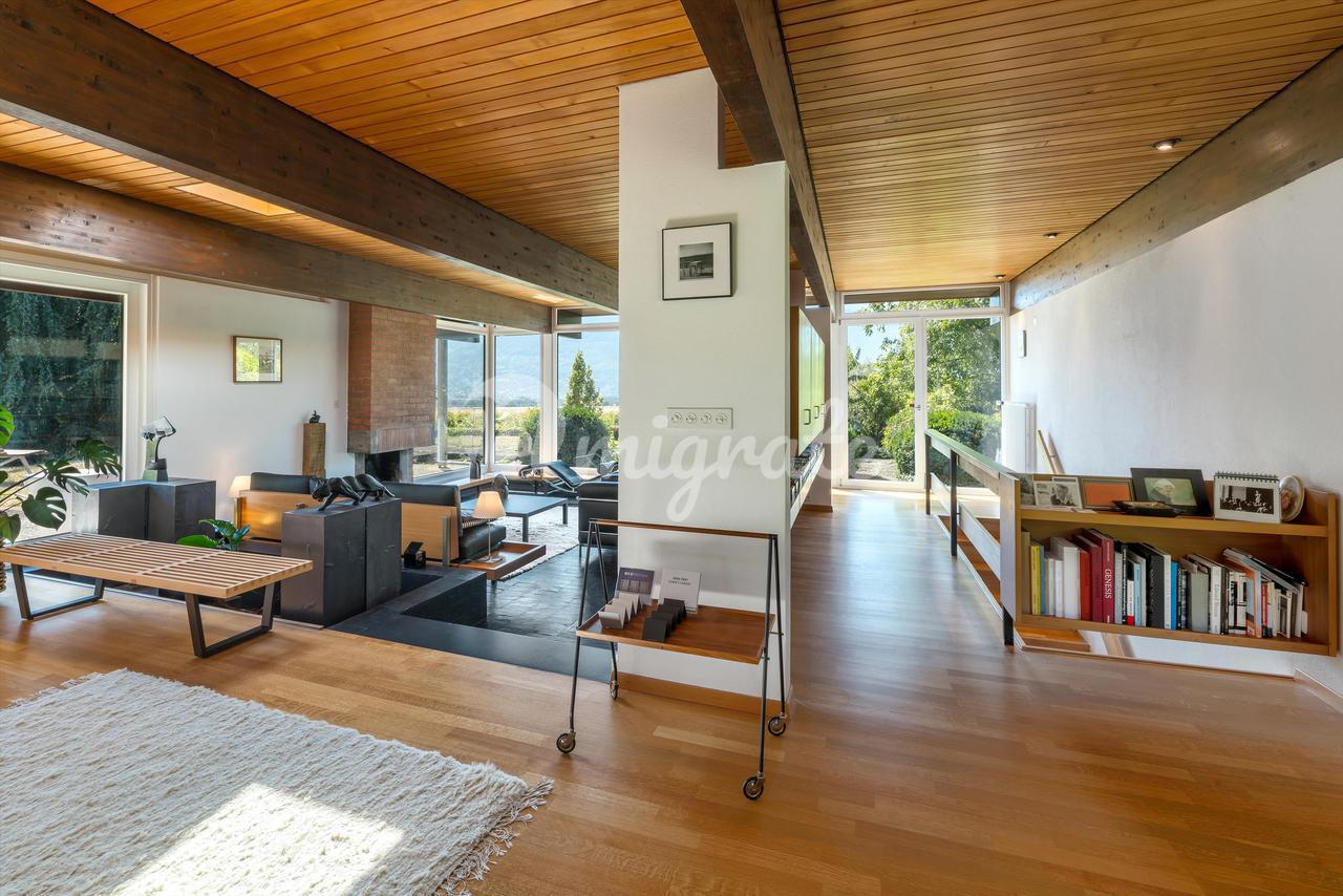 Нижний этаж состоит из большой гостиной с камином и выходом на улицу, кухни, выходящей в столовую, двух спален и ванной комнаты. В ландшафтном саду есть бассейн и душ на открытом воздухе.