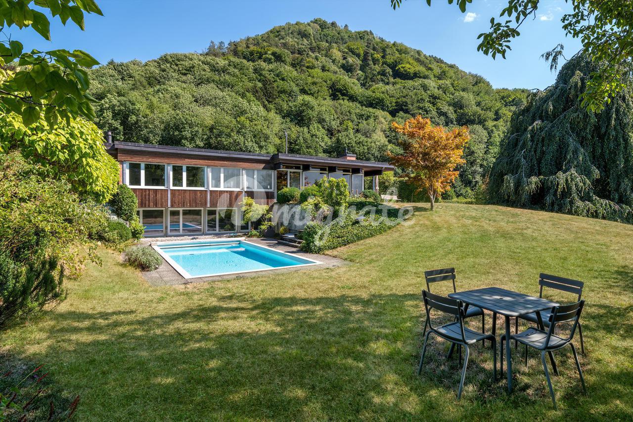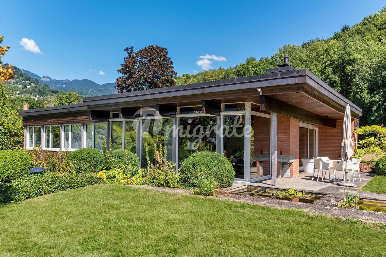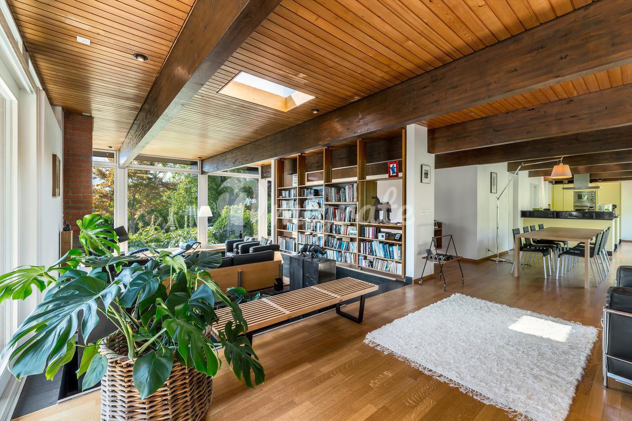 Нижний этаж состоит из большой гостиной с камином и выходом на улицу, кухни, выходящей в столовую, двух спален и ванной комнаты. В ландшафтном саду есть бассейн и душ на открытом воздухе.