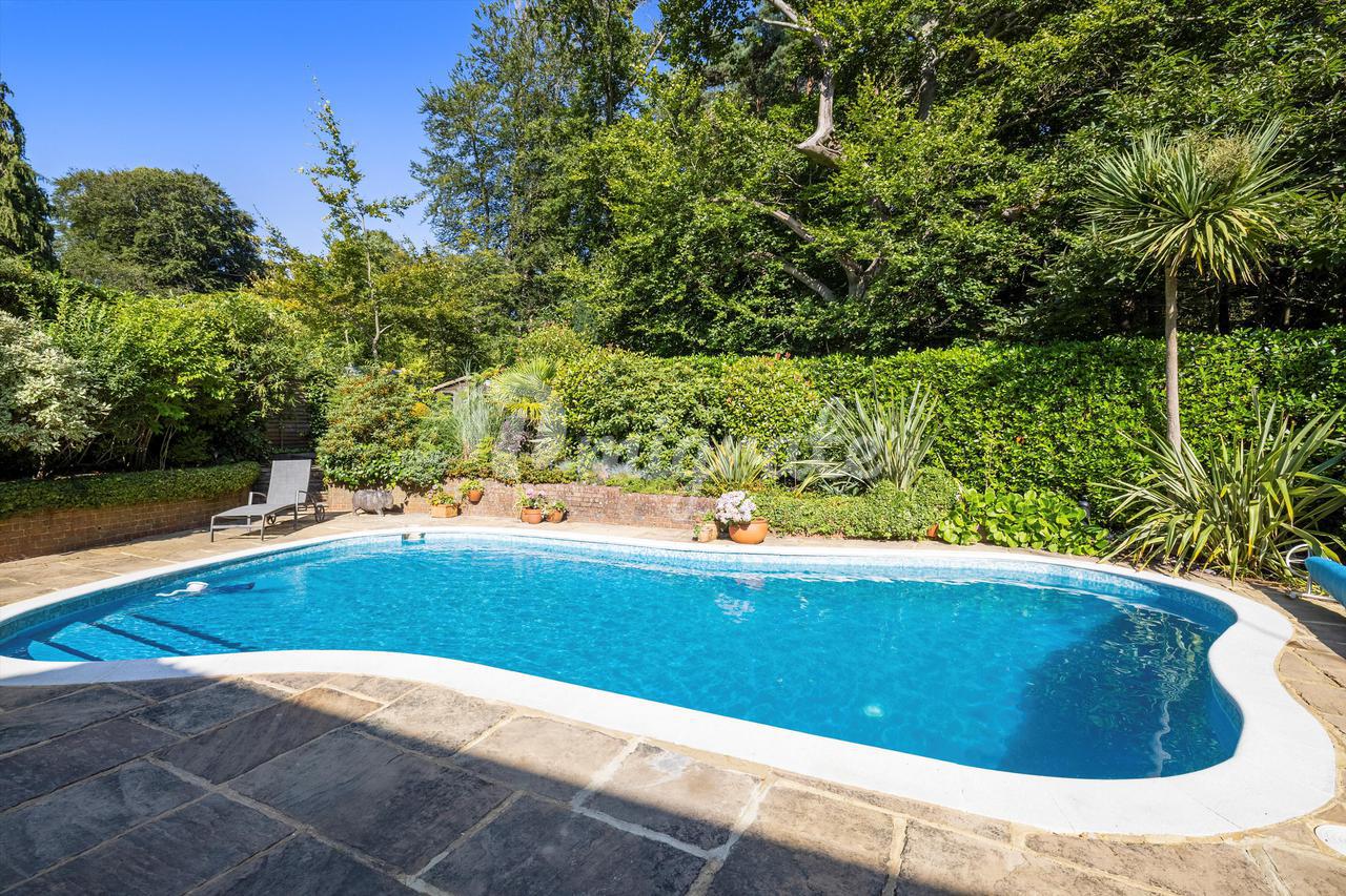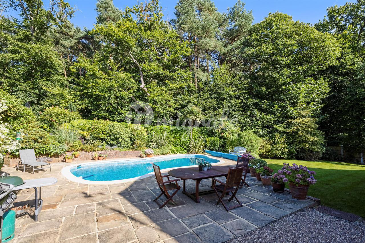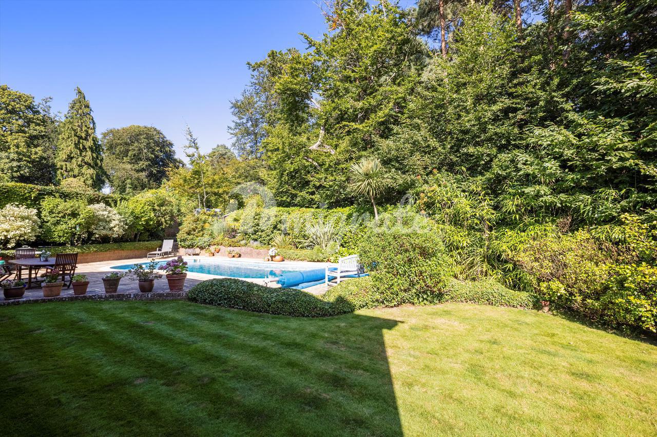 Существует большой внутренний дворик, который проходит через заднюю часть дома и вокруг открытого бассейна, а также приподнятую террасу. Сад невероятно уединенный и выходит на Оксшотт Вудс и пешеходные дорожки вокруг него. Сады хорошо благоустроены со зрелой живой изгородью и границами.
