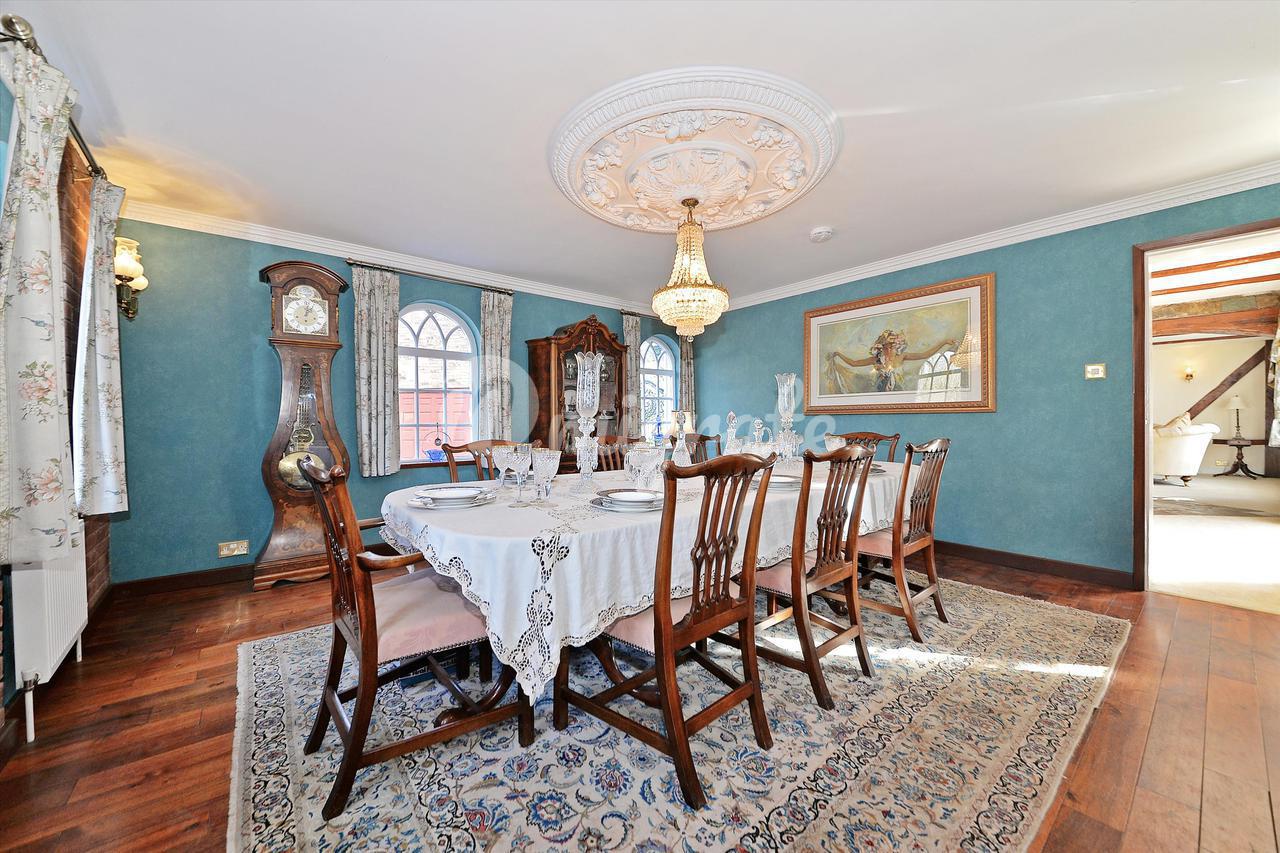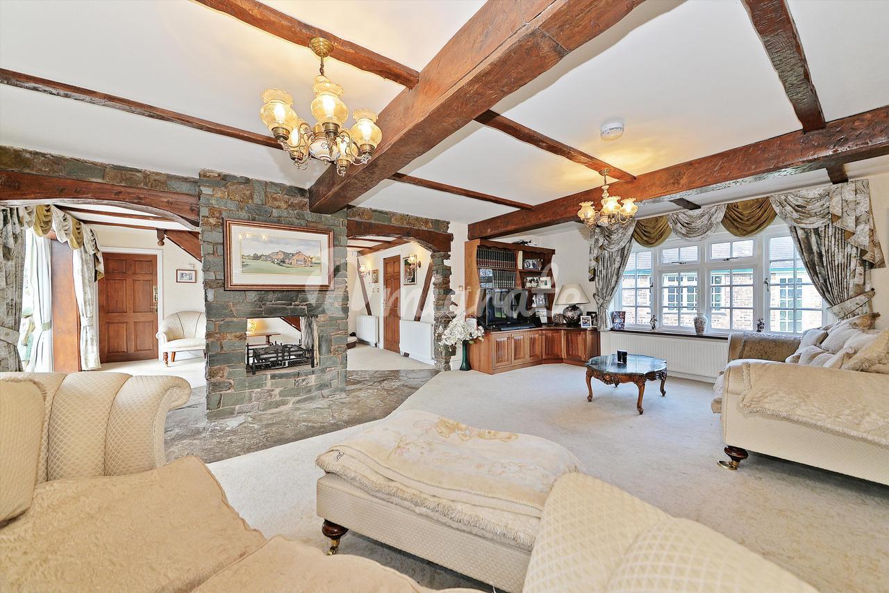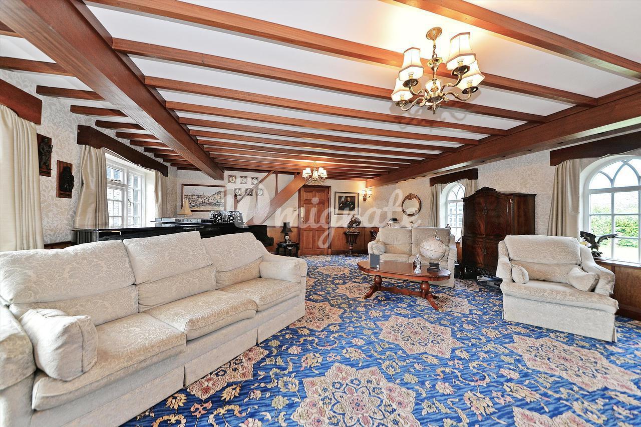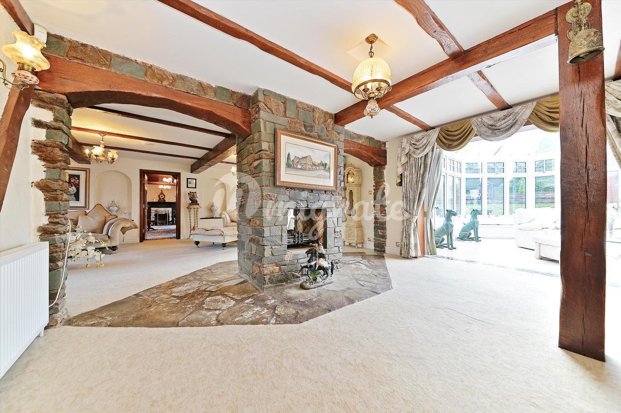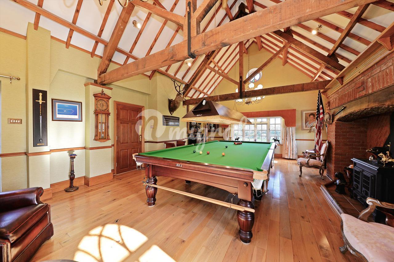 Это великолепное пространство двойной высоты, переходящее в игровую комнату, притягивает взгляд вверх. Балки А-образной формы являются настоящей изюминкой и дополняют потрясающий камин inglenook с балкой bressummer из грубо отесанного дуба. Большая богато украшенная дровяная горелка придает еще больше очарования. Это сказочное пространство имеет тройной аспект и залито естественным светом. Полностью застекленная панельная дверь обеспечивает доступ на заднюю террасу внутреннего дворика и создает потрясающий вид на жилые помещения на первом этаже как внутри, так и снаружи.