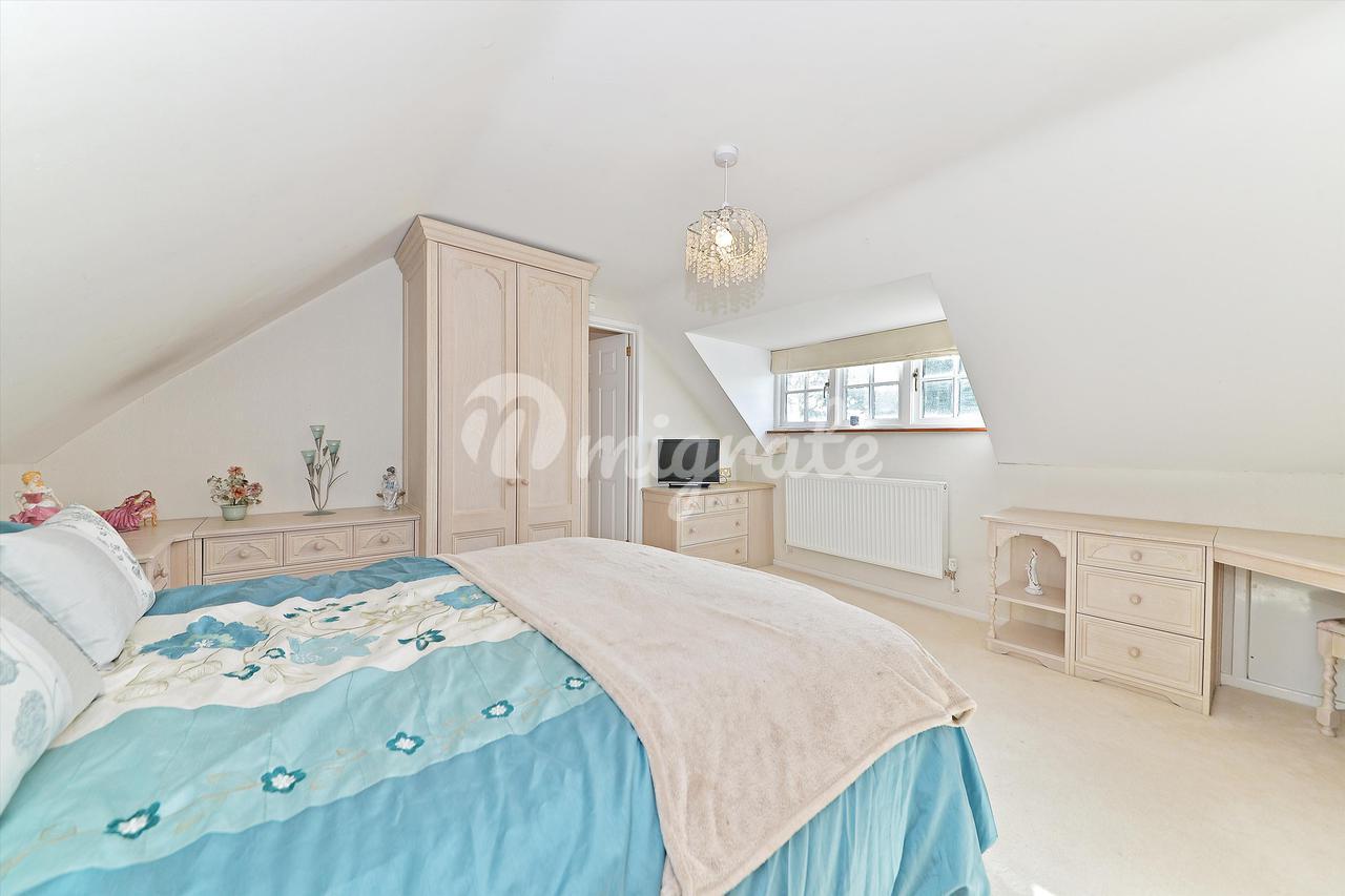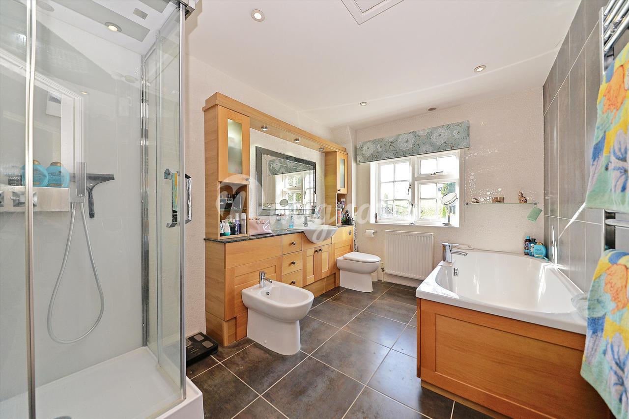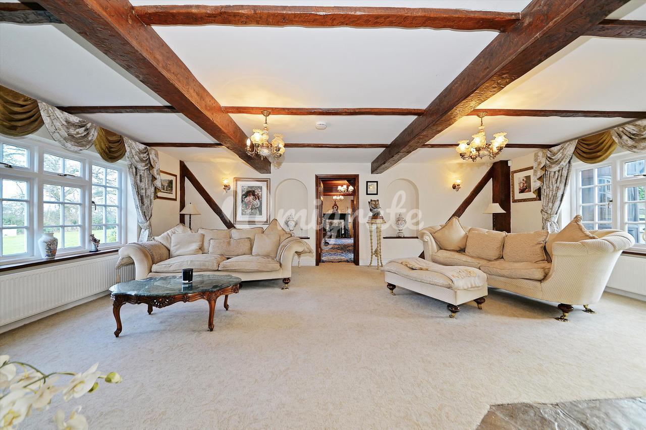 Помещение переходит в просторную гостиную с потолочными балками и стенами, обшитыми деревянными панелями. Из этой светлой комнаты открывается вид на сады перед домом и за его пределами. Роскошный по своему ощущению камин с резным обрамлением из темного дерева добавляет еще один акцент. Вторая открытая ступенчатая лестница ведет на небольшую лестничную площадку, где расположена четвертая спальня с собственной ванной комнатой, создающая отличный набор комнат для приезжих гостей или родственников.