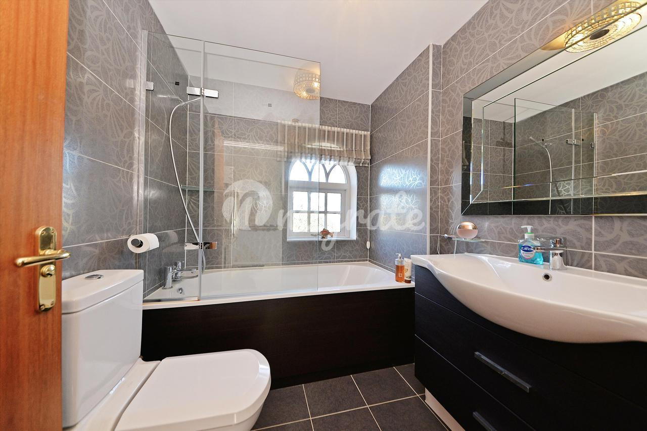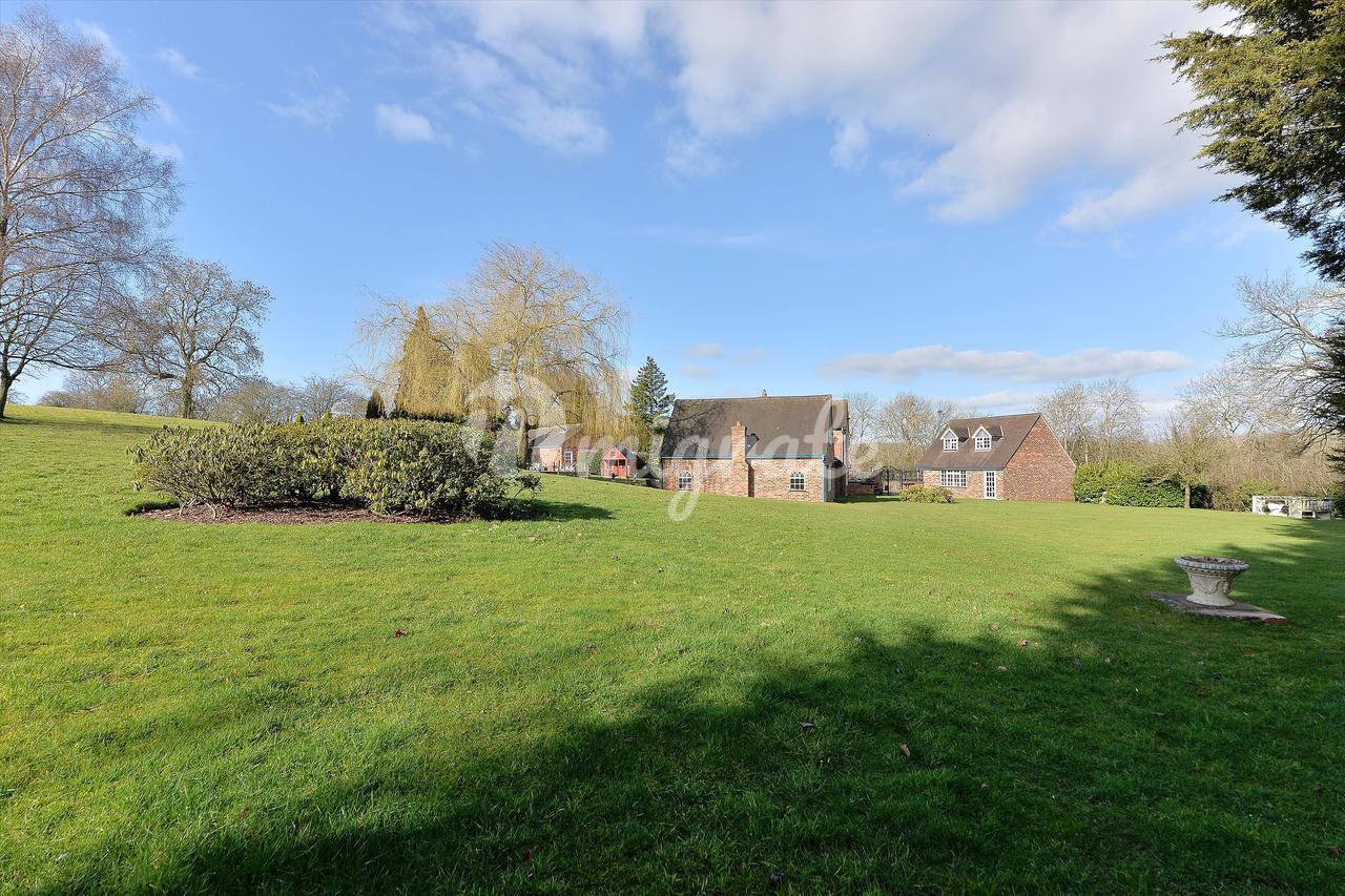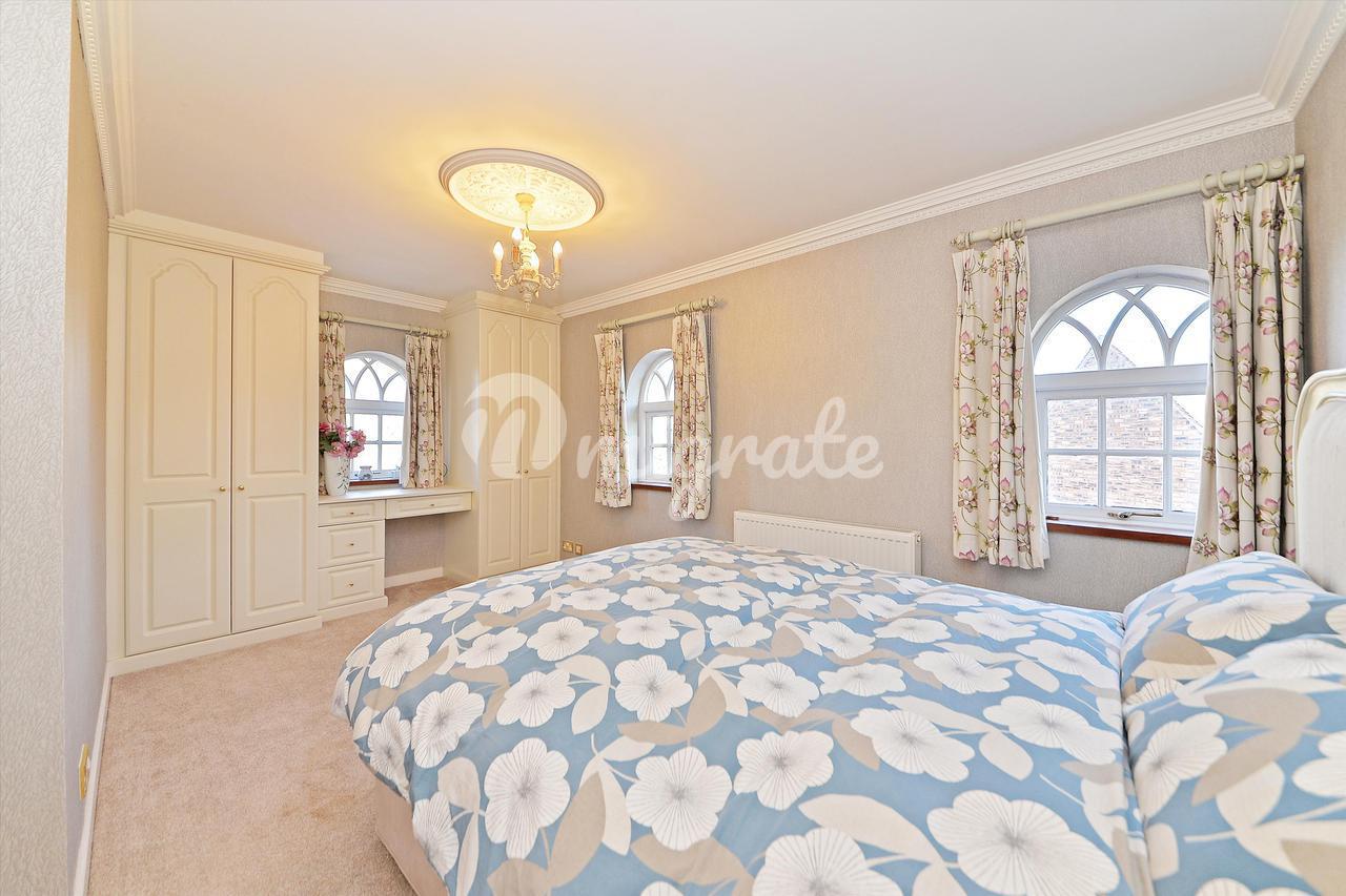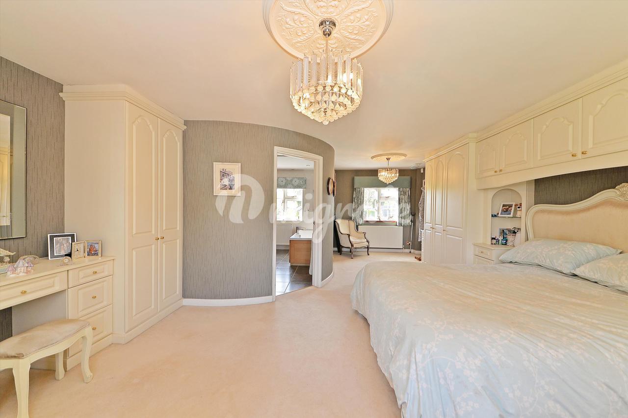 Помещение переходит в просторную гостиную с потолочными балками и стенами, обшитыми деревянными панелями. Из этой светлой комнаты открывается вид на сады перед домом и за его пределами. Роскошный по своему ощущению камин с резным обрамлением из темного дерева добавляет еще один акцент. Вторая открытая ступенчатая лестница ведет на небольшую лестничную площадку, где расположена четвертая спальня с собственной ванной комнатой, создающая отличный набор комнат для приезжих гостей или родственников.