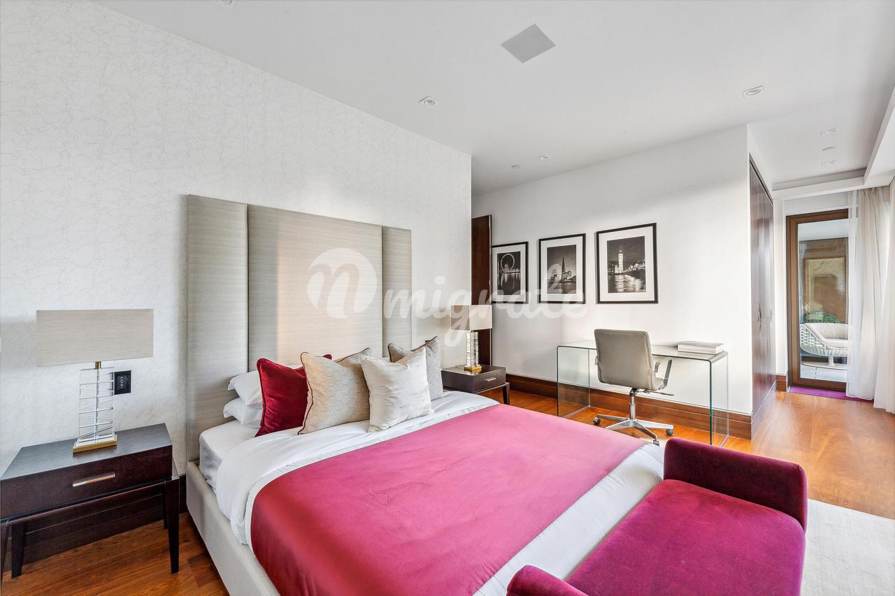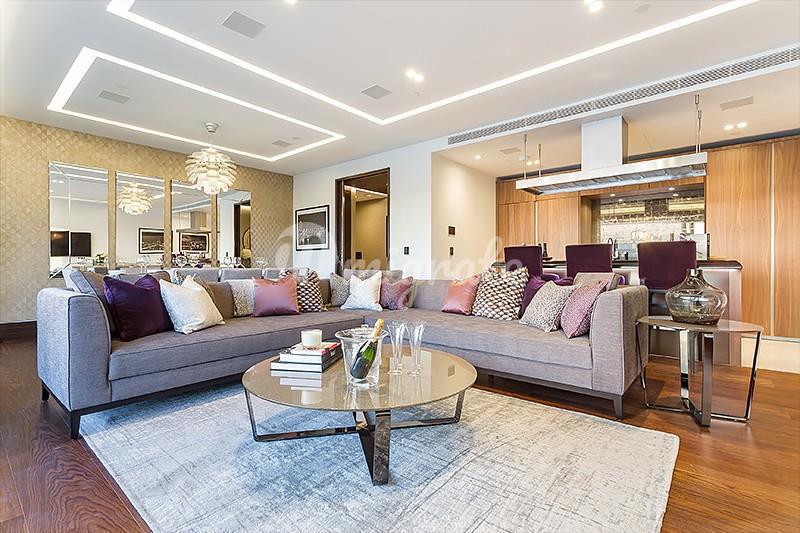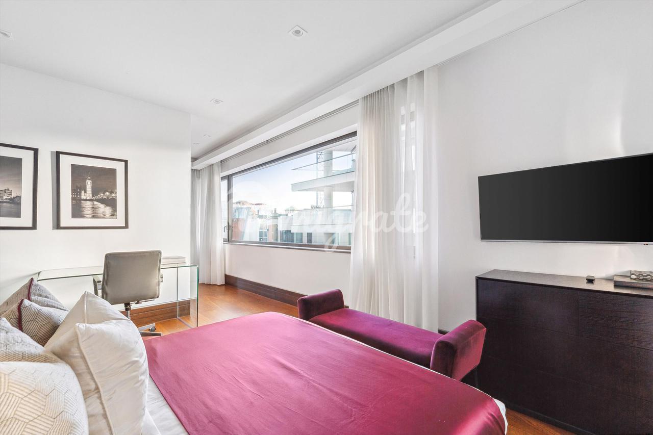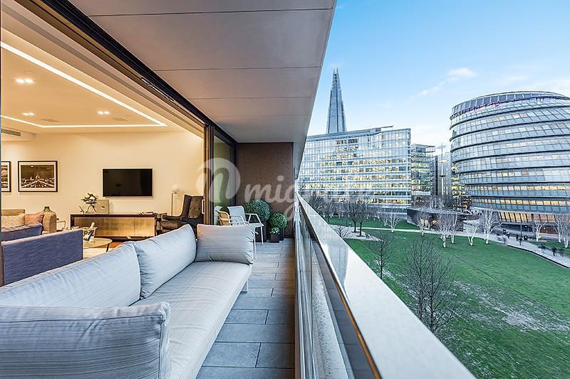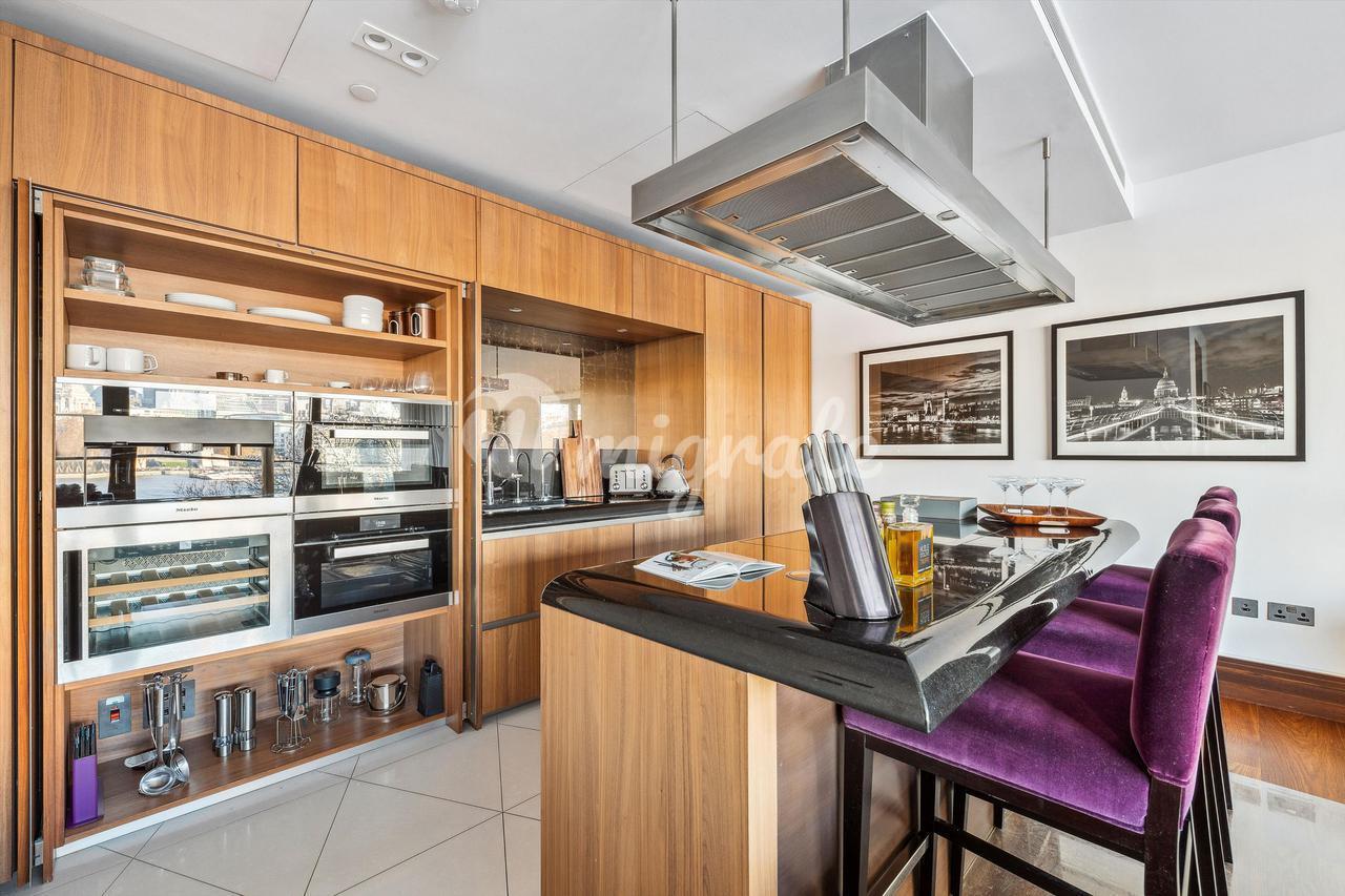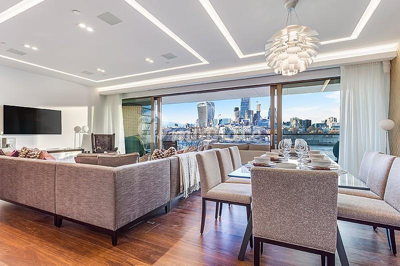 В квартире есть просторная приемная с окнами от пола до потолка, которые ведут на балкон, который тянется по всей длине приемной, откуда открывается непрерывный вид на реку, Лондонский Тауэр, Тауэрский мост и городской пейзаж. Кухня с высокими техническими характеристиками оснащена большим выбором встроенных шкафов и бытовой техники.