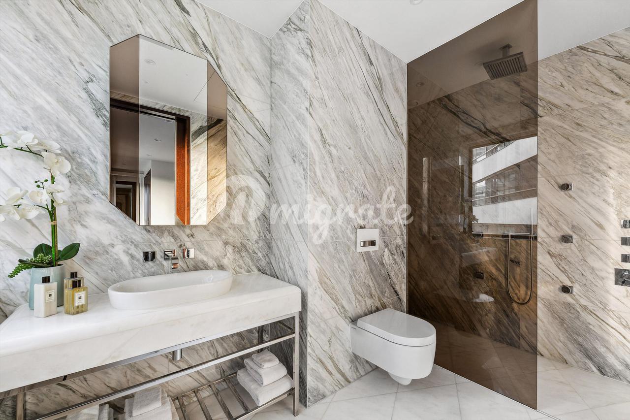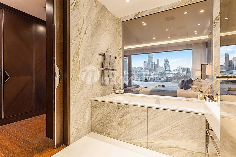 Бленхейм Хаус - это здание премиум-класса One Tower Bridge, и это отражено в зонах общего пользования и спецификации отделки. Пример этого можно увидеть в главной ванной комнате, где облицованная плиткой ванна расположена рядом с окном из "волшебного стекла", обеспечивающего уединение или вид на реку и город.