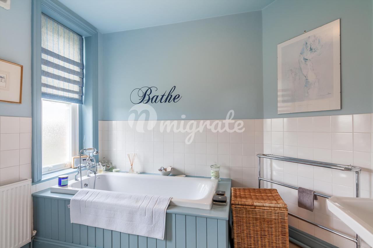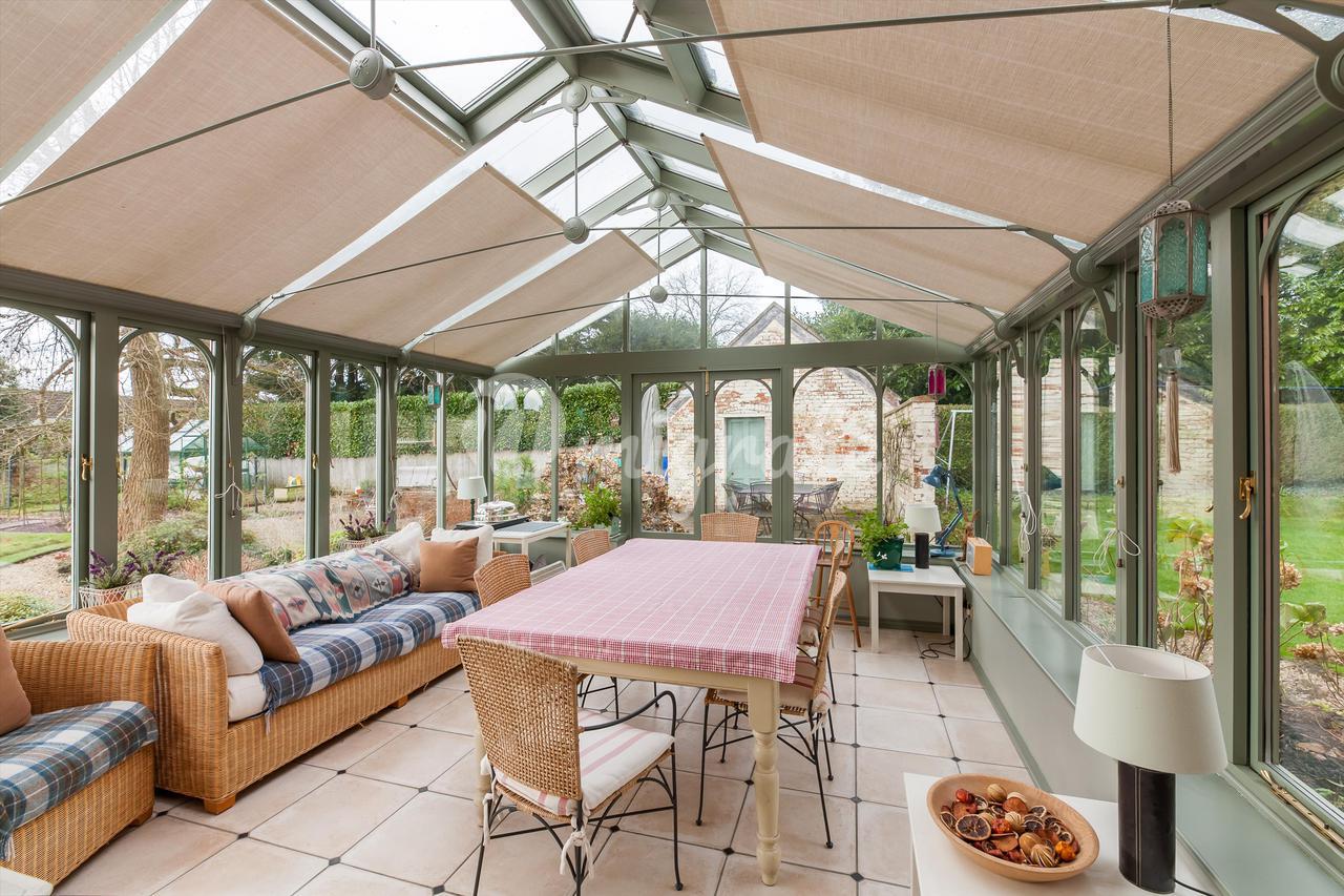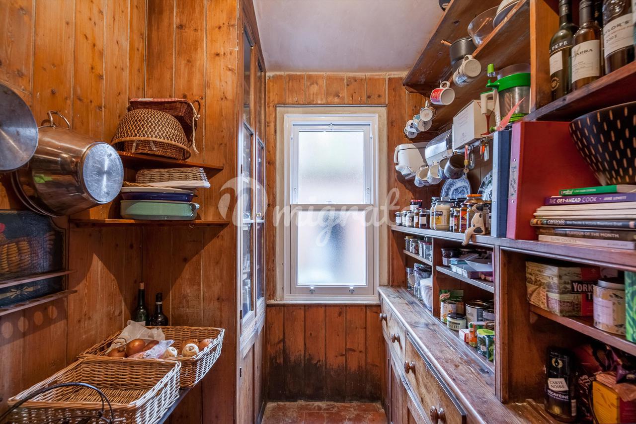 В передней части дома находится большая кухня с кухонными гарнитурами в стиле Shaker, окрашенными во французский серый цвет Farrow & Ball, и столешницами из темного гранита, встроенной бытовой техникой, плитой и раковиной Belfast. Из этой комнаты ведут еще две двери: одна в просторную кладовую с деревянными полками и шкафами, а другая в практичное подсобное помещение, а внизу есть доступ к подвалу.